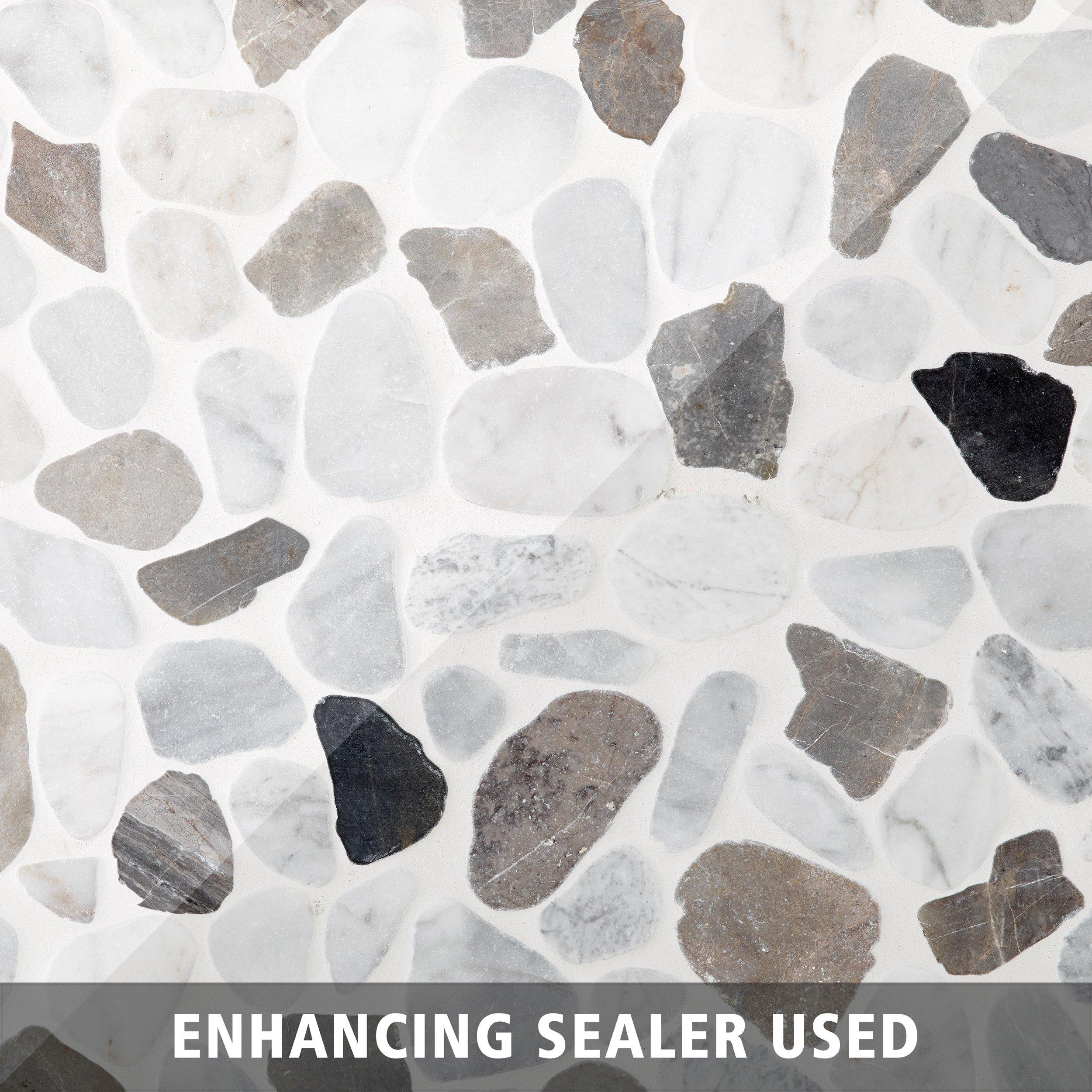 This 12 x 12 Bianco Carrara Mix II Pebble Marble Mosaic is gray and made from marble.
