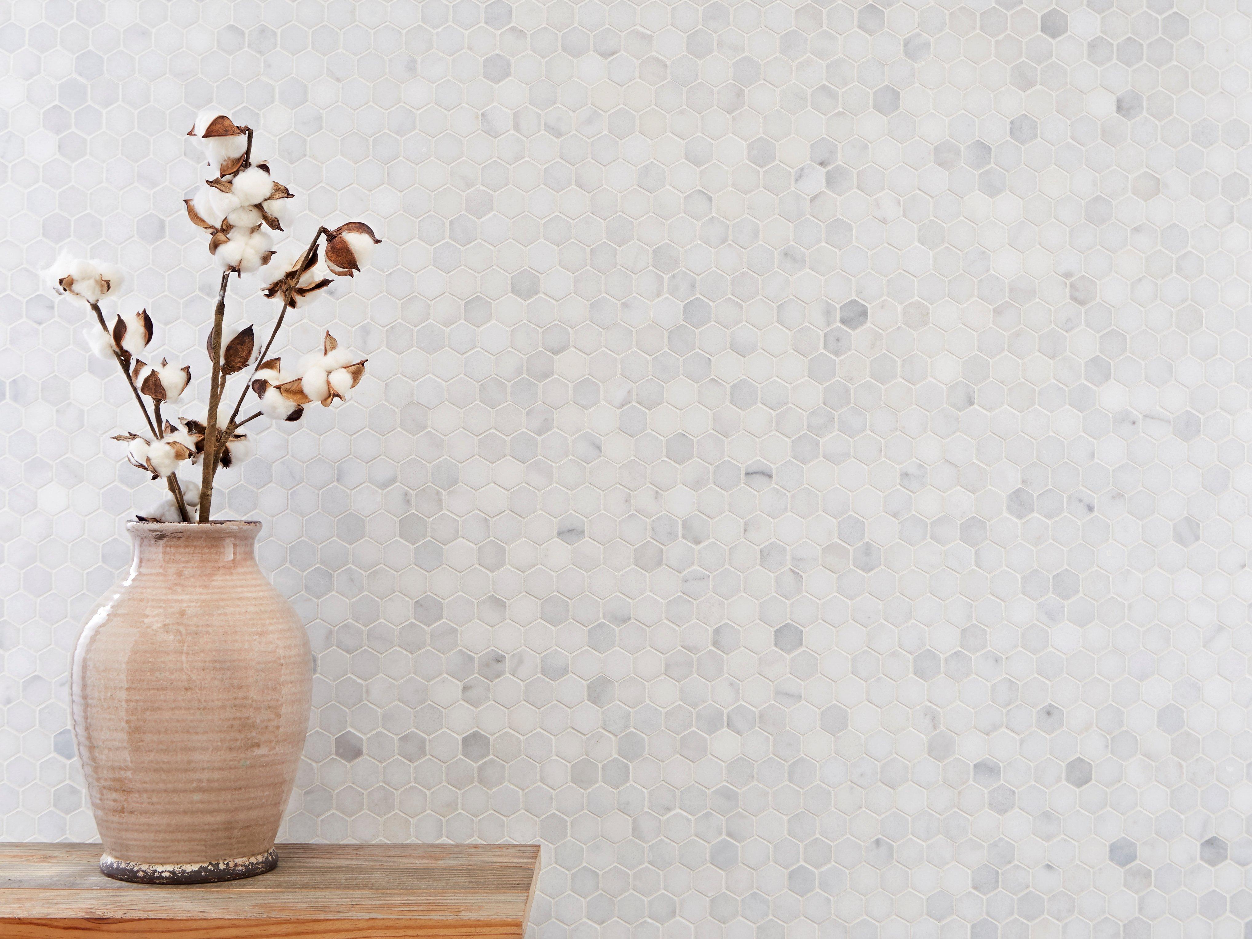 The Carrara Chateau Hexagon Honed Marble Mosaic in white is as timeless as it is versatile. Its durability and easy maintenance make it a practical and attractive addition to almost any room, and you’ll have an effortlessly elegant aesthetic.