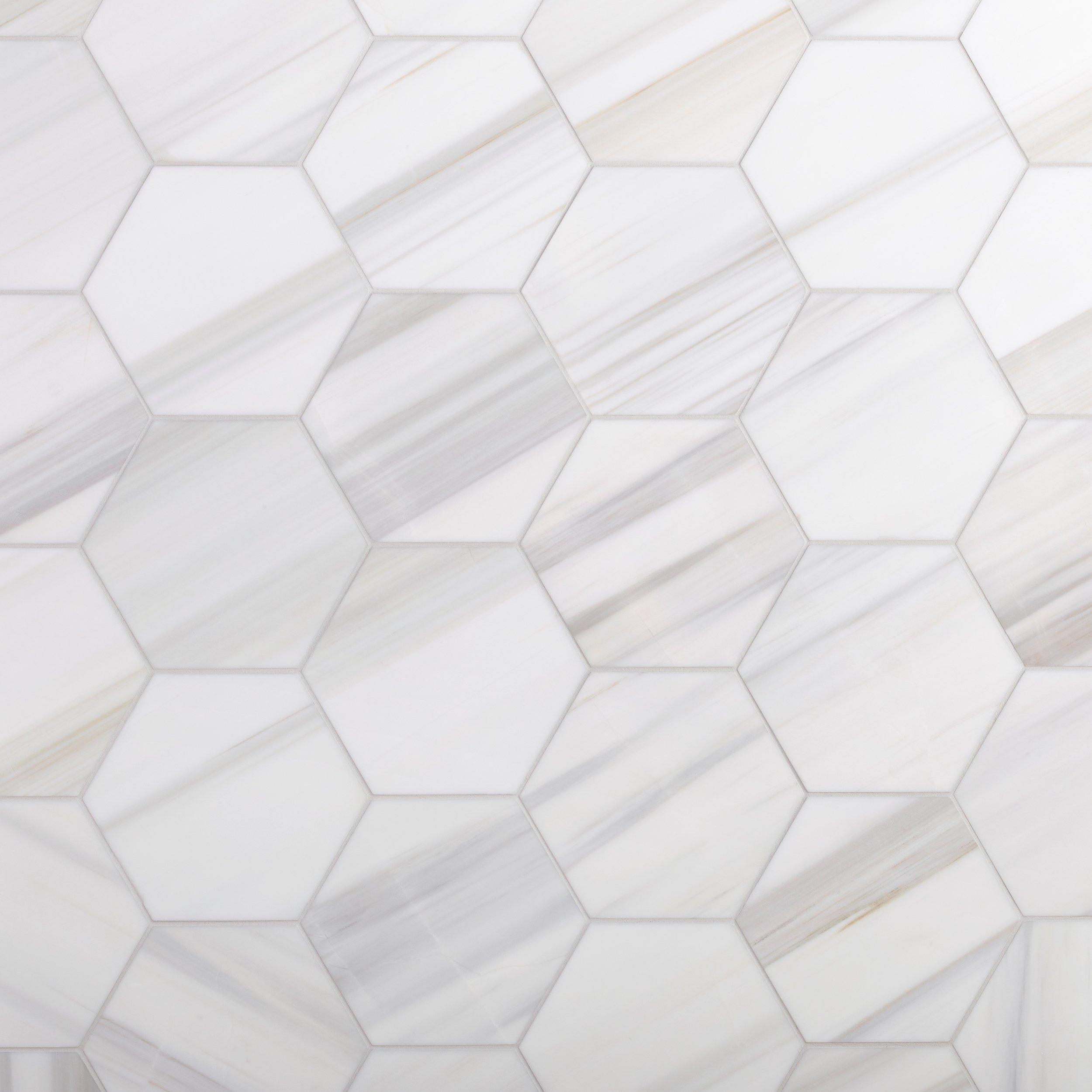 Natural stone like this beautiful Island Dolomite Hexagon Honed Marble Tile makes a timeless statement. This 8 x 9 decorative tile comes in white and has a honed finish. With many styles to choose from in forever versatile marble, you’ll appreciate the unique style of this tile.