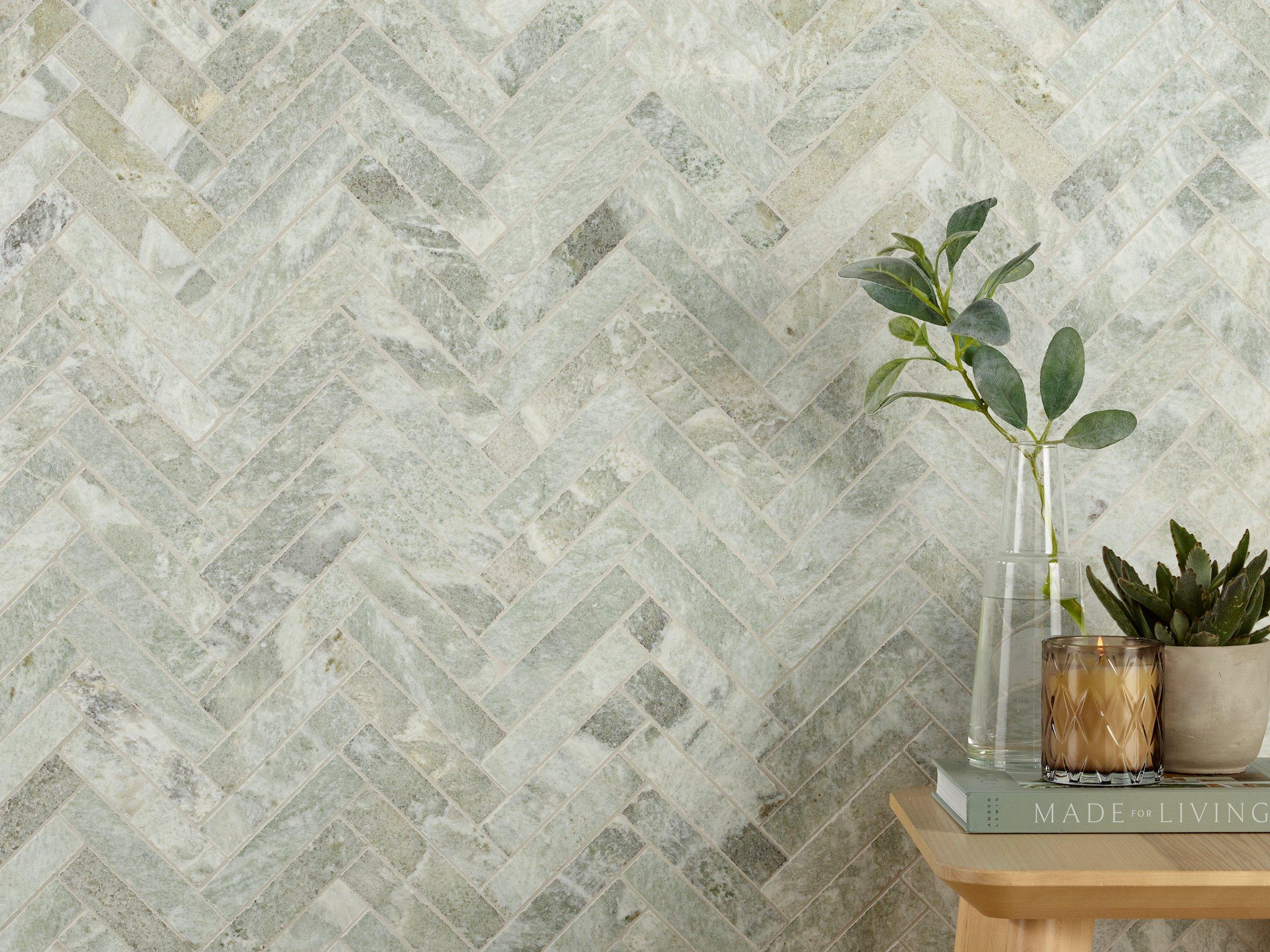 The Willow Sage Herringbone Marble Mosaic in green is as timeless as it is versatile. Its durability and easy maintenance make it a practical and attractive addition to almost any room, and you’ll have an effortlessly elegant aesthetic.