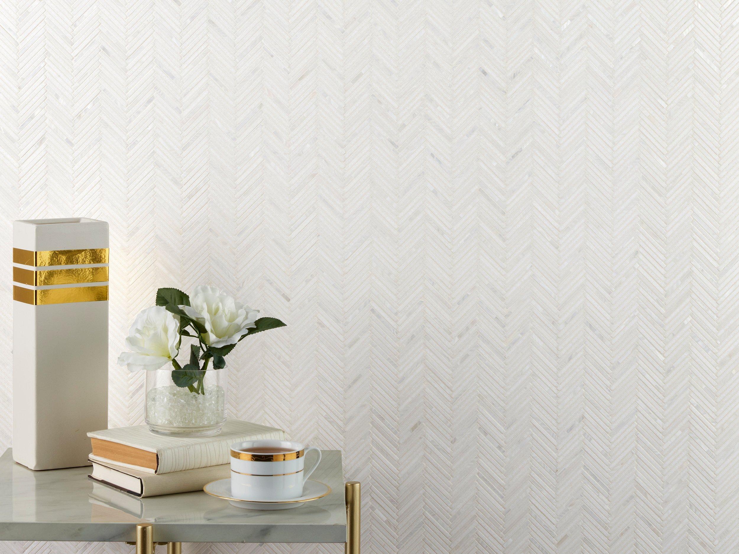 The Celine Chevron Thassos Mother of Pearl II Polished Marble Mosaic in white is as timeless as it is versatile. Its durability and easy maintenance make it a practical and attractive addition to almost any room, and you’ll have an effortlessly elegant aesthetic.