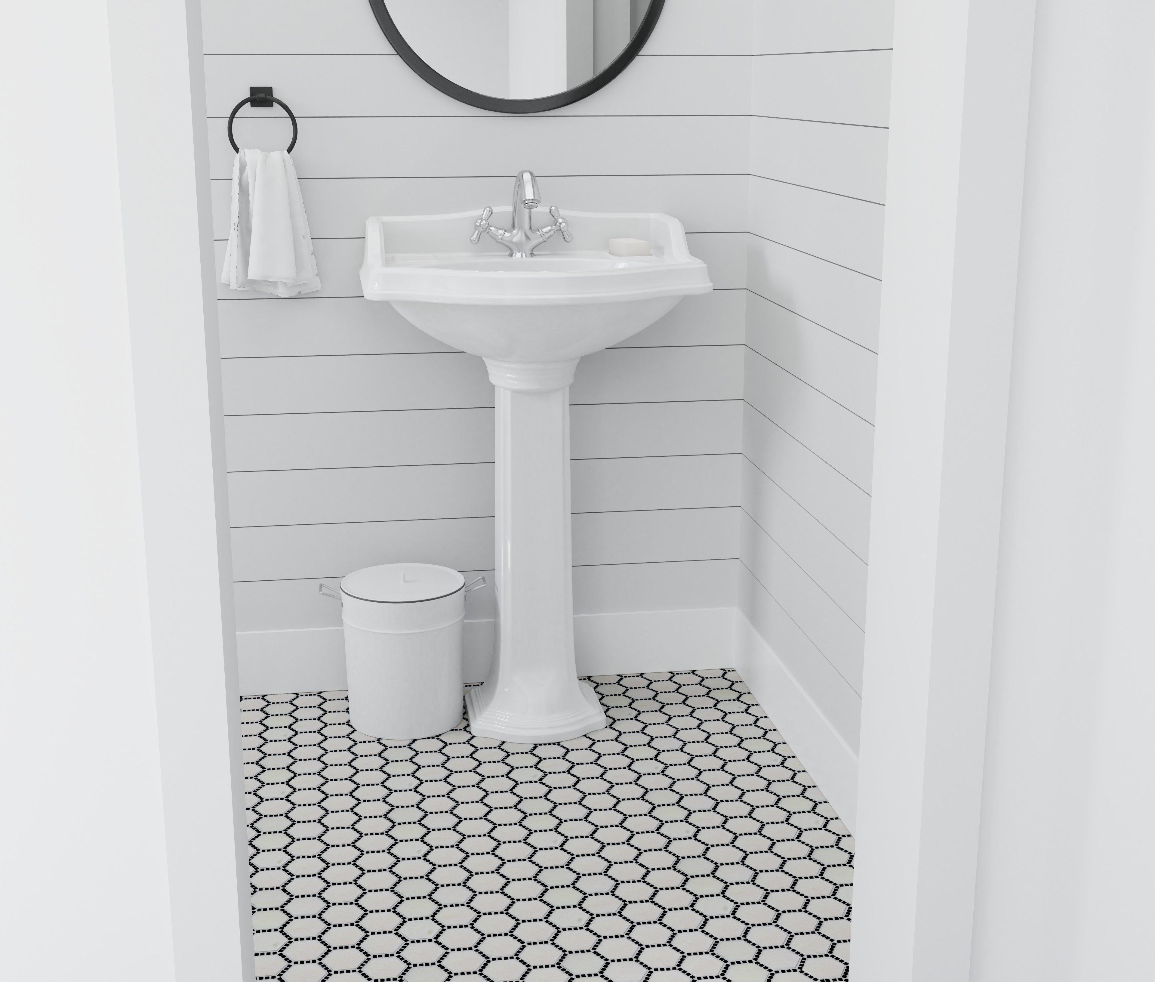 The Gossamer White and Black Marble Hexagon Mosaic in white is as timeless as it is versatile. Its durability and easy maintenance make it a practical and attractive addition to almost any room, and you’ll have an effortlessly elegant aesthetic.
