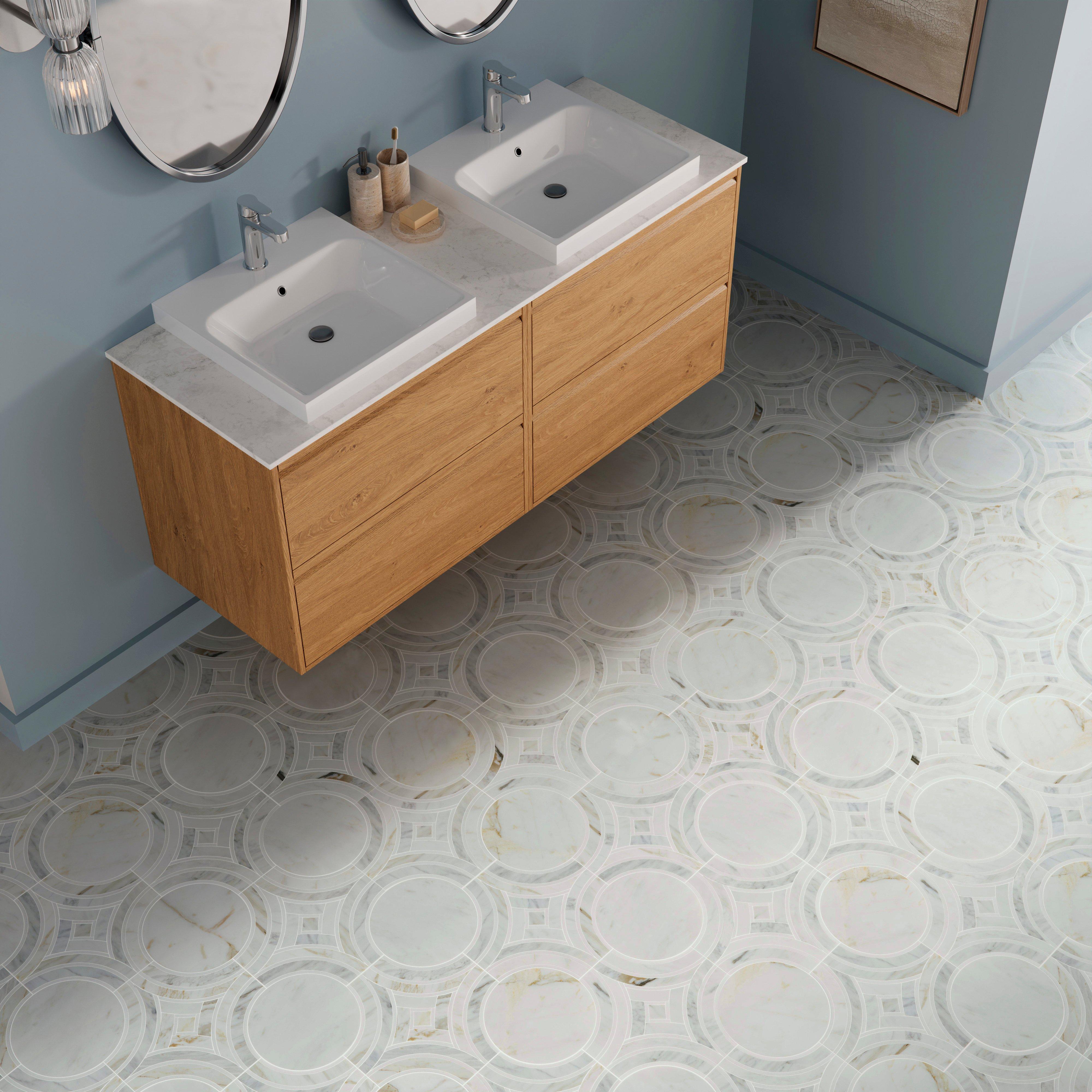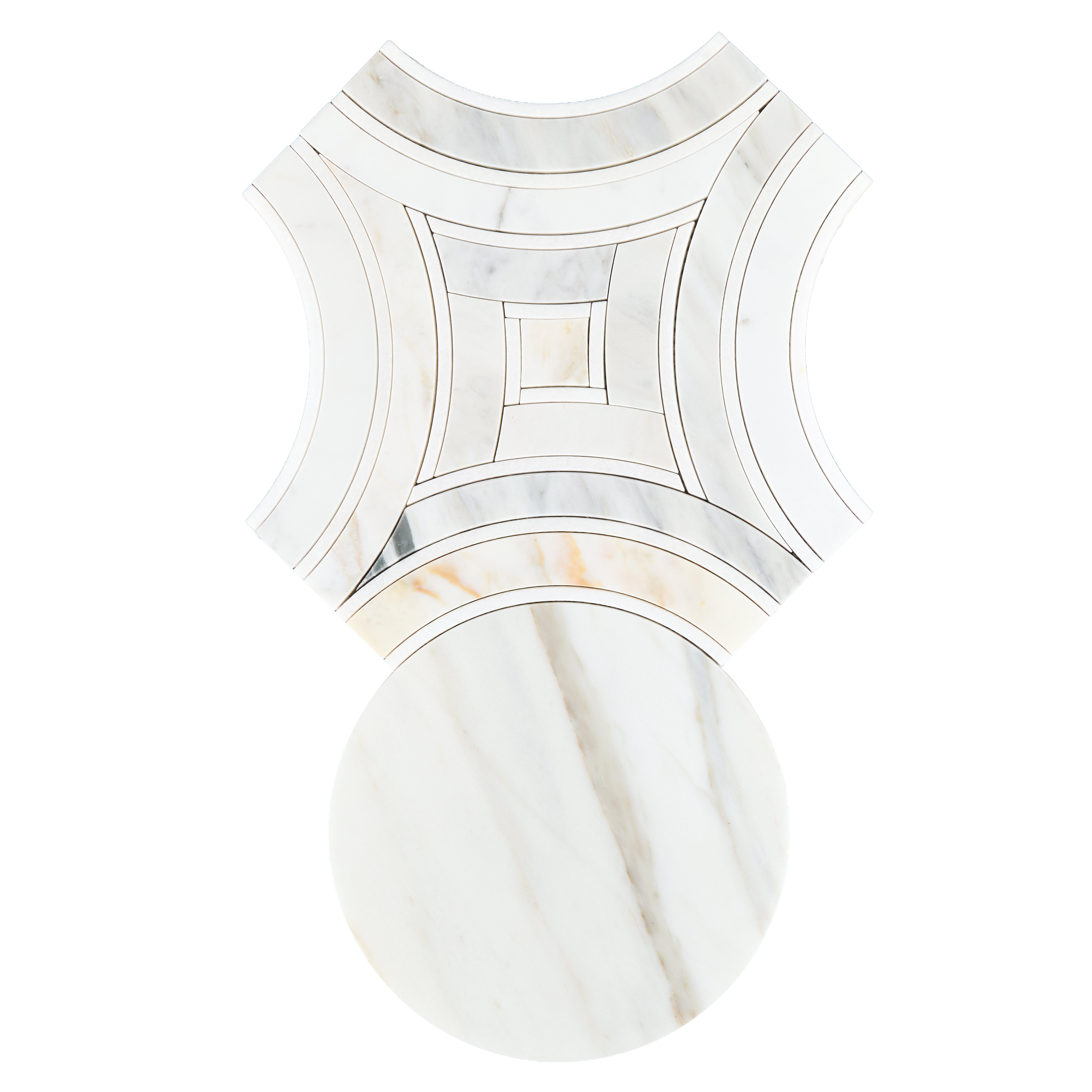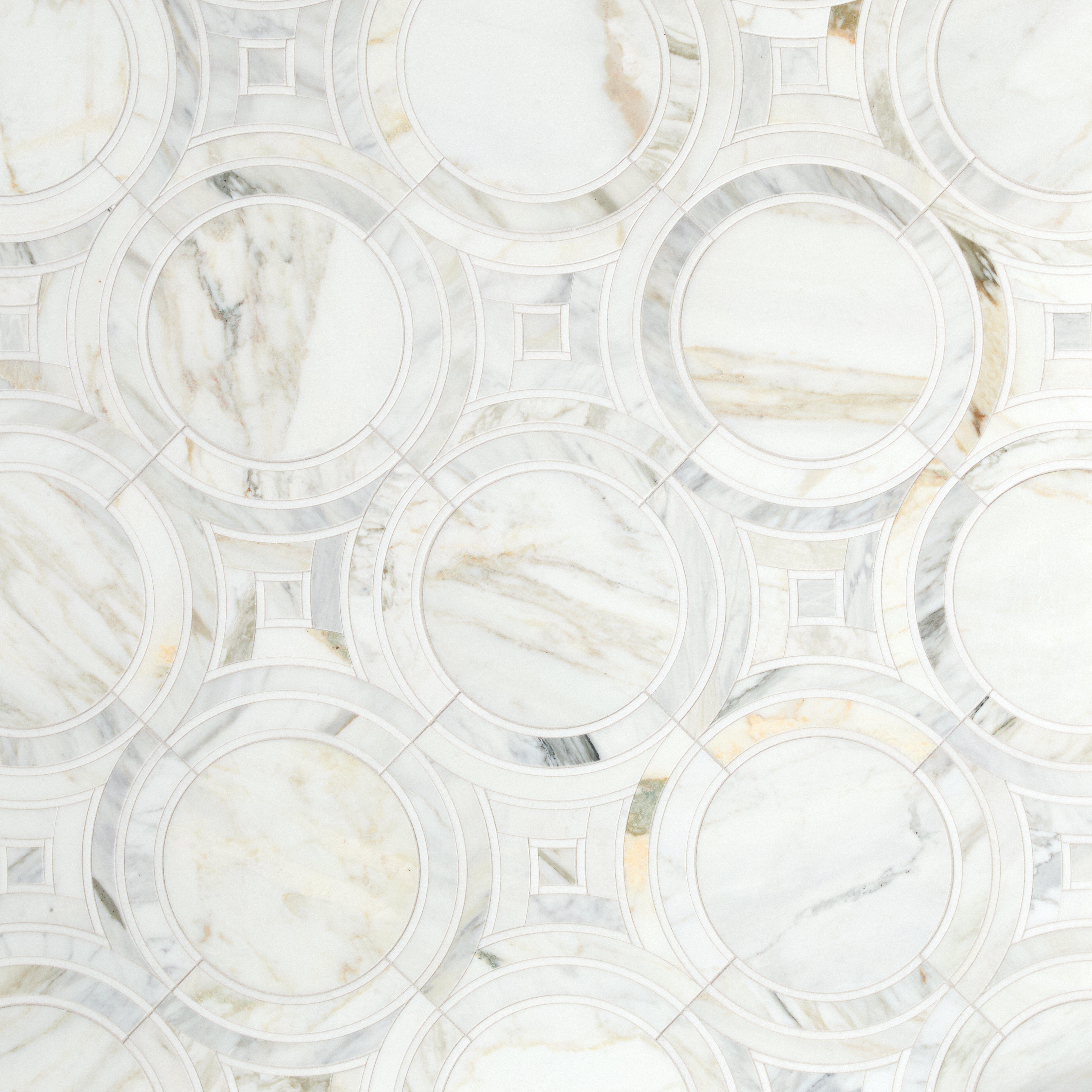 The Lago Calacatta Bluette Light Waterjet Honed Marble Mosaic by Viviano is a stunning addition to any home, featuring a unique waterjet shape that utilizes cutting edge technology to create striking new designs. The individual pieces are carefully selected, hand finished, and blended together to ensure the highest quality and a flawless final pattern.