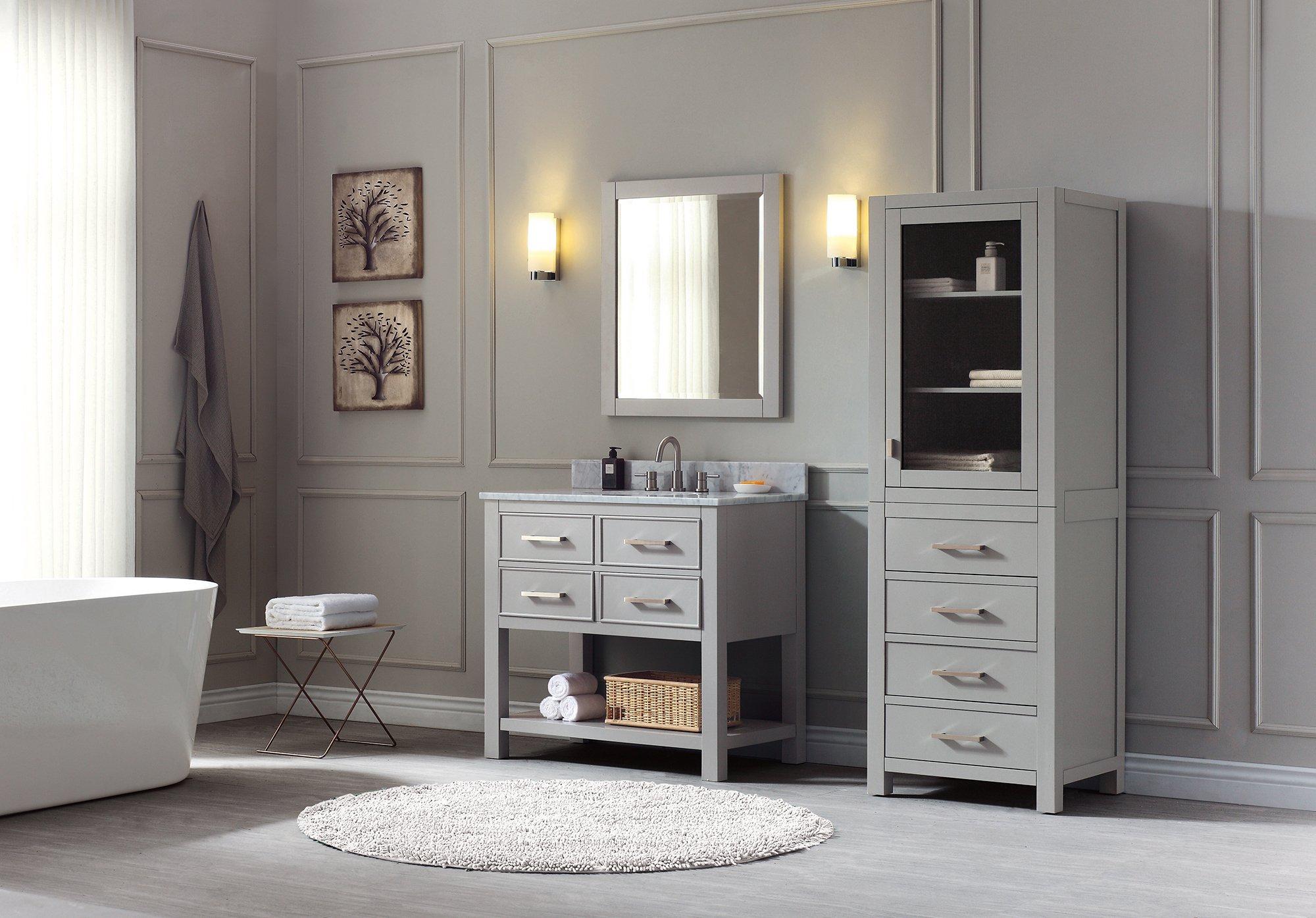 Lifetime LimitedThe Hampton 24 in. Chilled Gray Mirror features a contemporary Chilled Gray finish and a simple clean design. The mirror hangs horizontally and vertically.•24W x 1.3D x 30H inches•Chilled Gray finish•Beveled mirror•Cordinates with vanity collection•Wood cleat for easy hanging and leveling