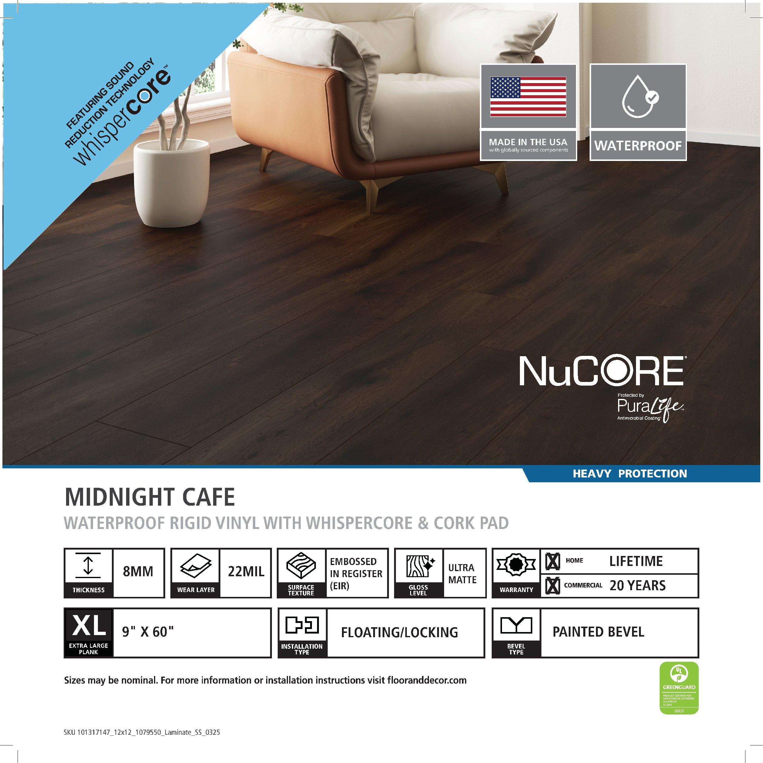 8mm x 9in x 60in NuCore Whispercore Midnight Cafe Waterproof Rigid Core Luxury Vinyl Plank - Cork Pad looks and feels like wood and tile, but can be installed where real wood cannot. With quick and easy installation, it's the perfect flooring option for any room! Even better, the anti-microbial coating on each plank makes it resistant to staining or odors caused by mold or mildew. With a lifetime res./ 20 yr comm. warranty, it's sure to be a long-lasting flooring option for any space.