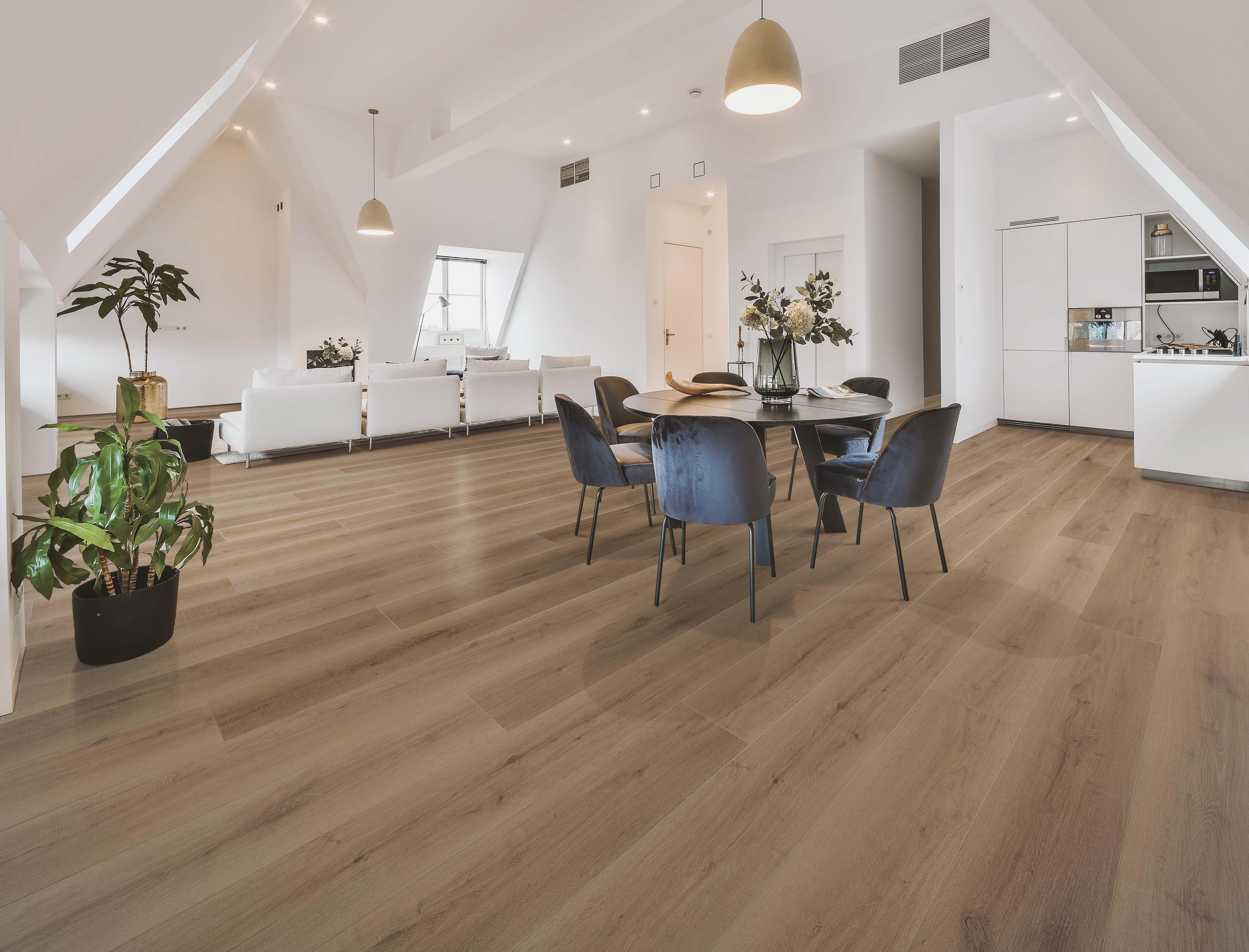 • Pre-attached hypoallergenic natural cork underlayment for a quieter, warmer floor.
