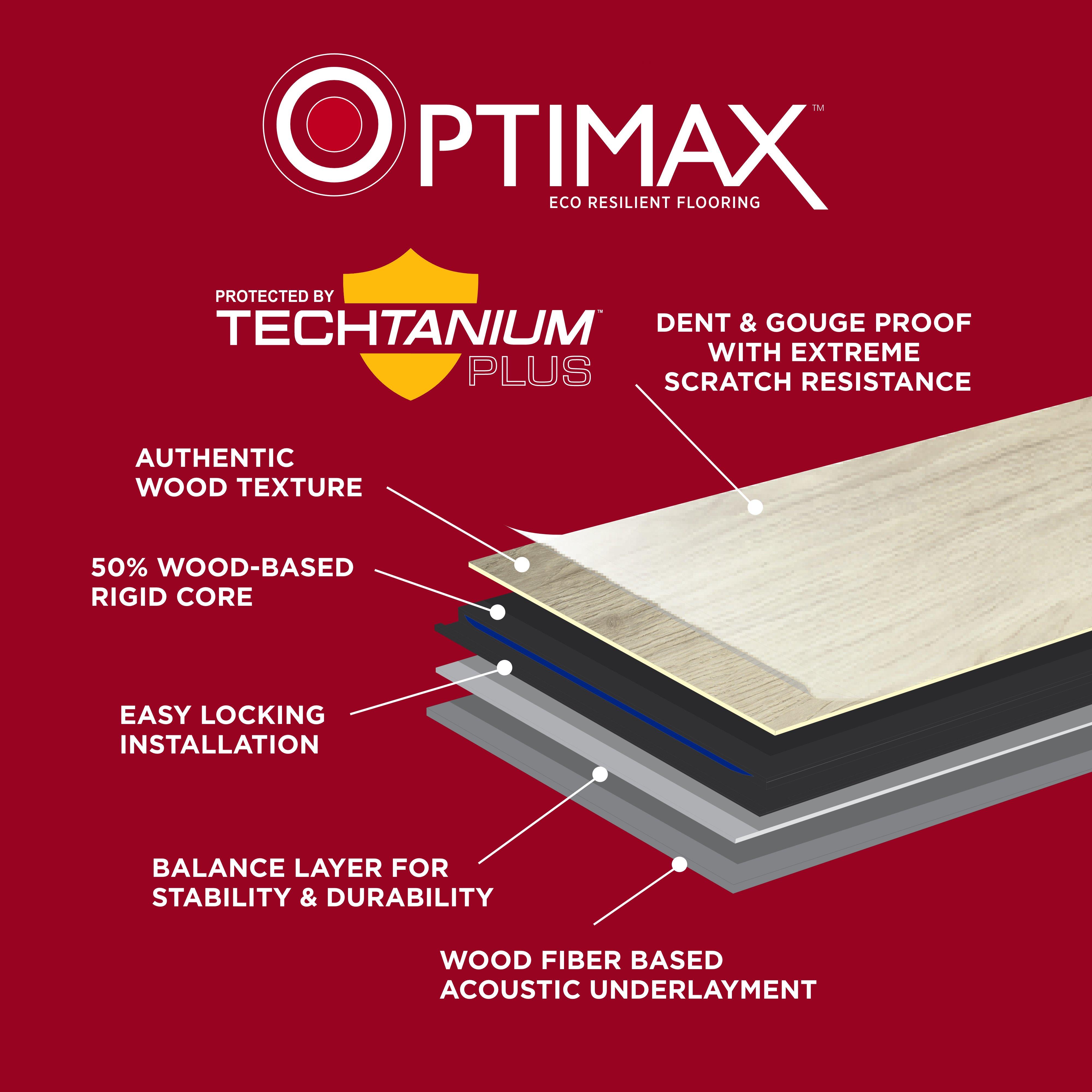 Hybrid resilient flooring is a wood-based, premium performance product that combines the best features of laminate and vinyl flooring. This innovative flooring is 100% waterproof, dent and gouge proof, eco-friendly, and easy to install. Protected by Techtanium™ Plus coating, Optimax™ and Optimax™ Performance offers maximum scratch protection and is an exceptional choice for anyone seeking a pet proof, PVC free, and beautiful product that’s built to last.