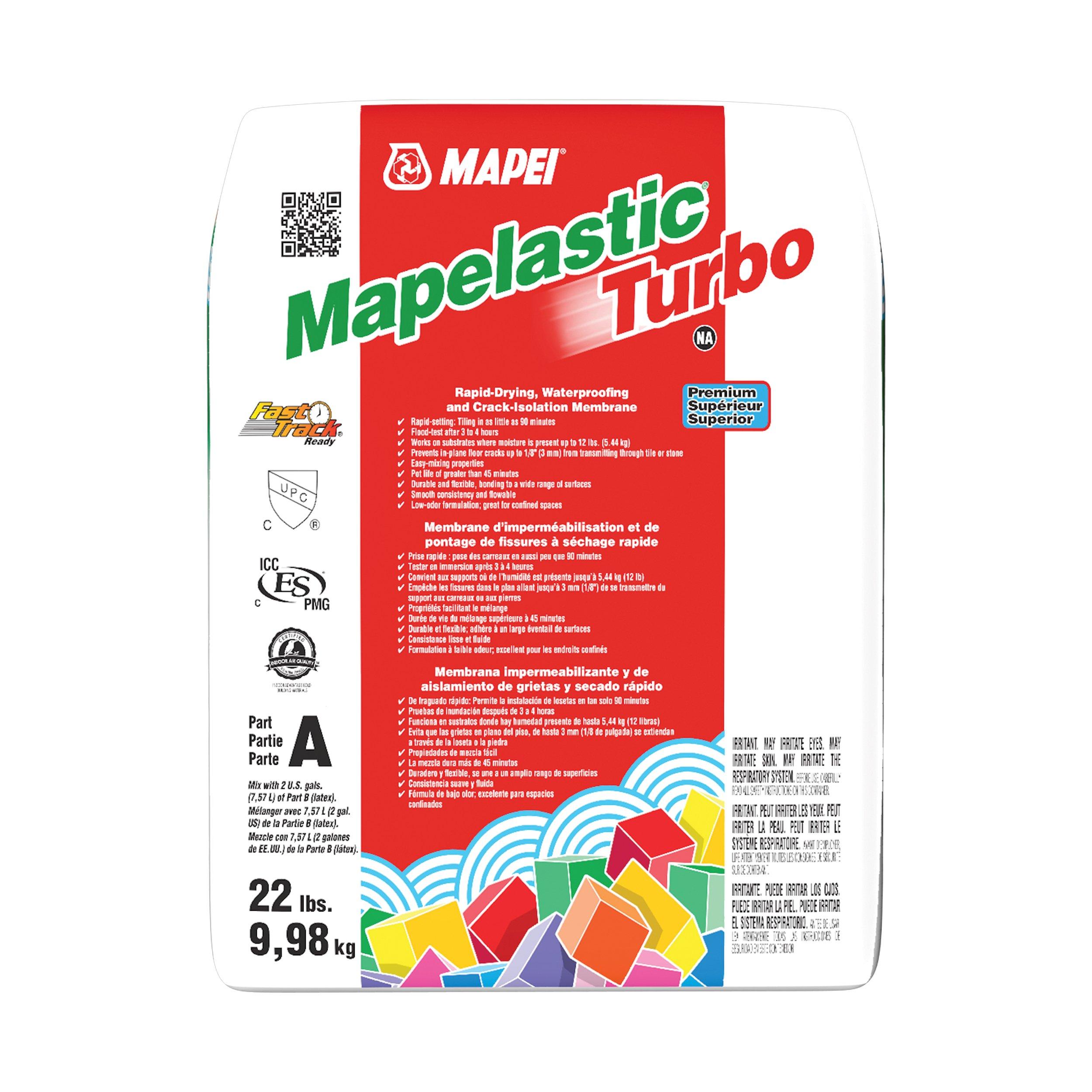 LifetimeMapei Mapelastic Turbo Part A is a rapiddrying, twocomponent waterproofing and crackisolation membrane designed for tile and stone installations in demanding environments. Its smooth, brush or rollerapplied formula creates a dependable barrier that helps protect adjacent rooms and lower levels from water damage. Engineered for both interior and exterior use, it meets high industry standards for performance, flexibility, and durability.