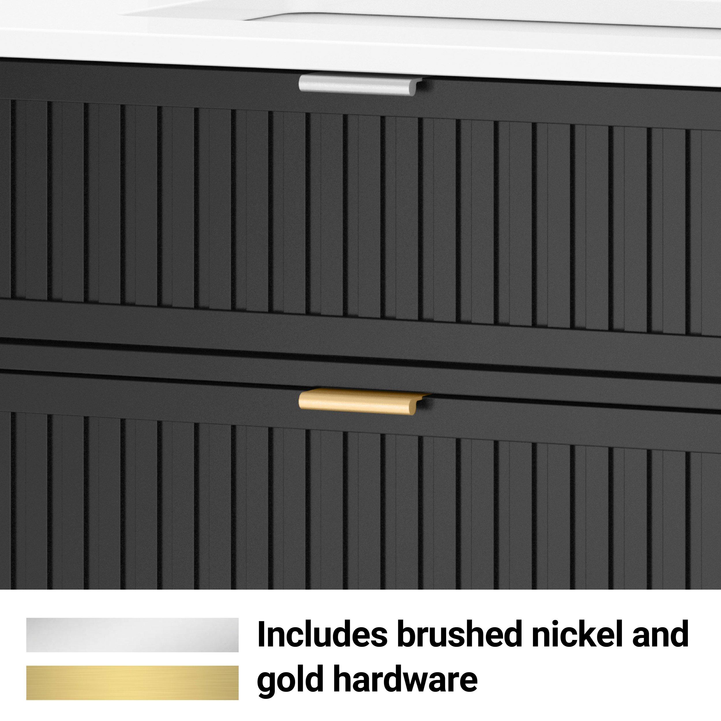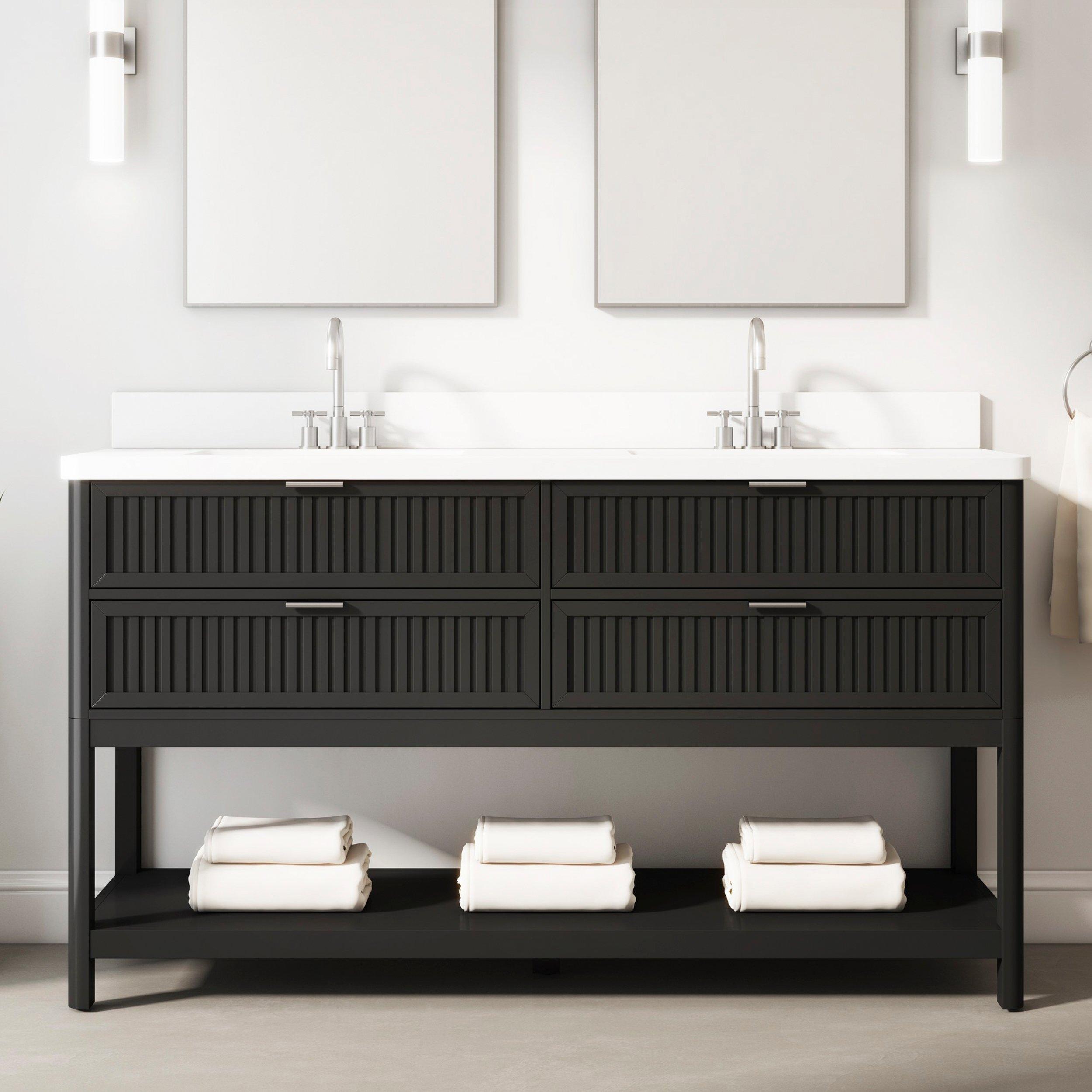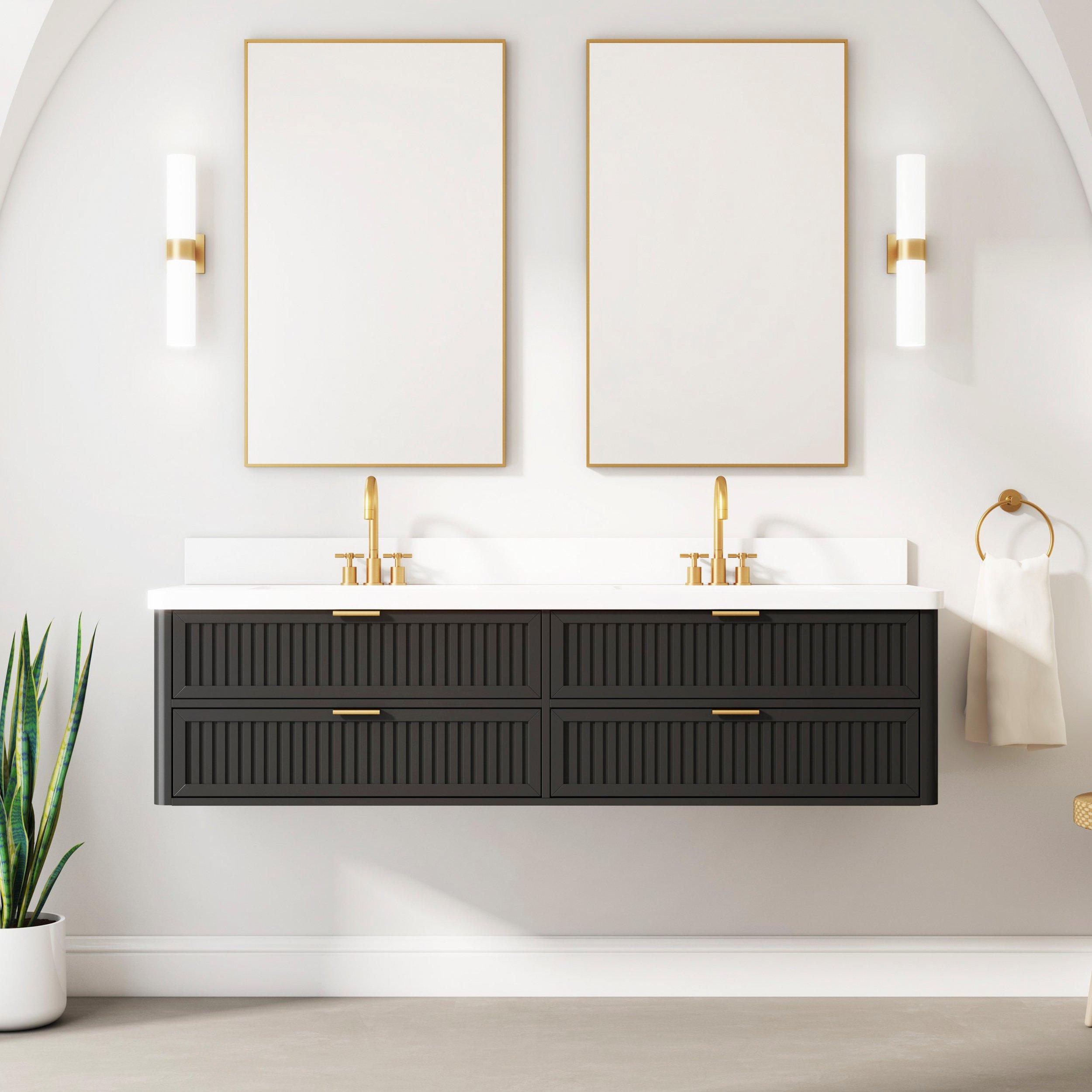 Complete your bathroom with the beautiful Palma 61 in. Black Vanity with Enginnered Stone Top. This wall mounted or freestanding features durable solid wood, mdf cabinets in stunning black with a white composite vanity top and brushed multi hardware. A charming double undermount sink in brilliant white is included. The Palma 61 in. Black Vanity with Enginnered Stone Top is a versatile choice to customize multiple bathroom settings.
