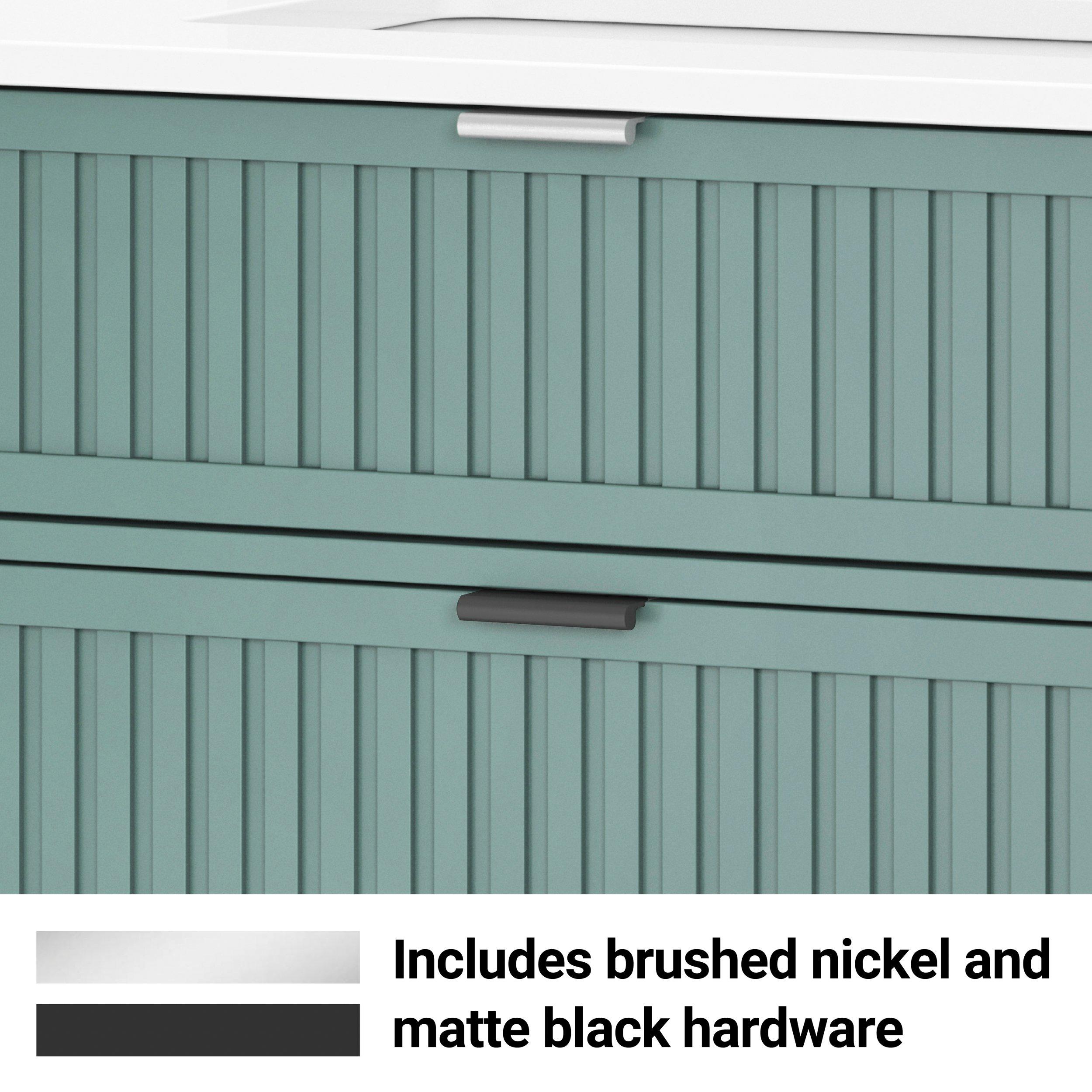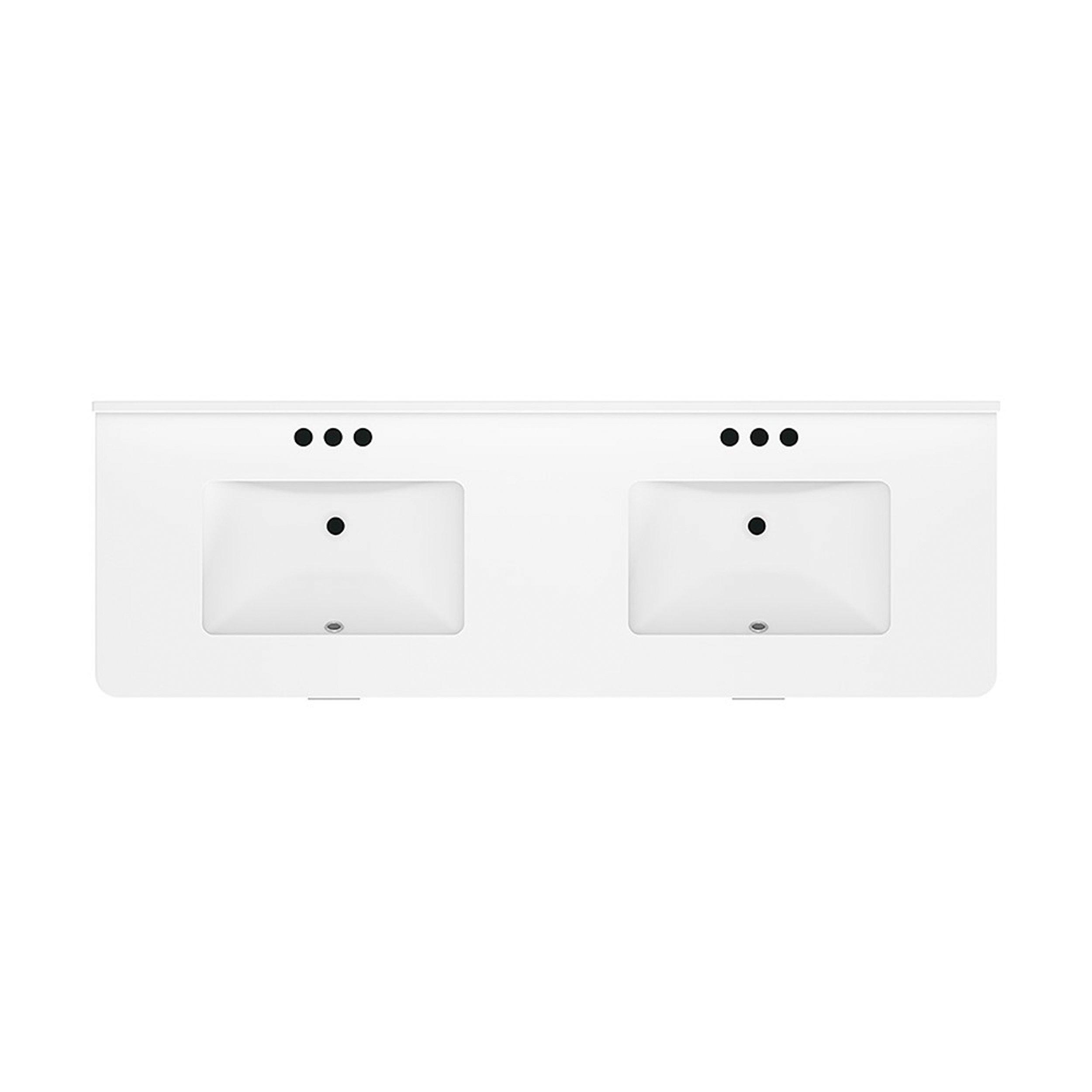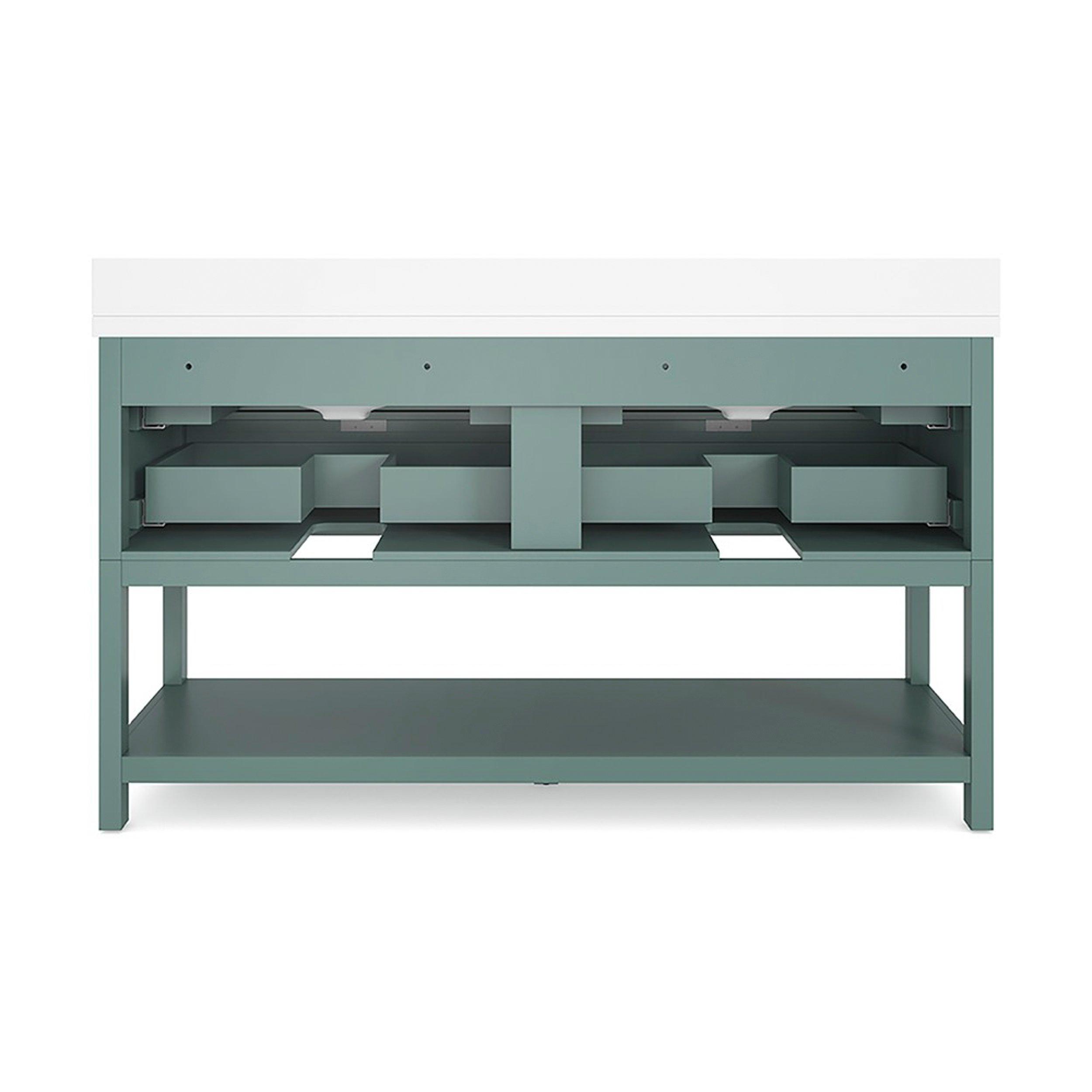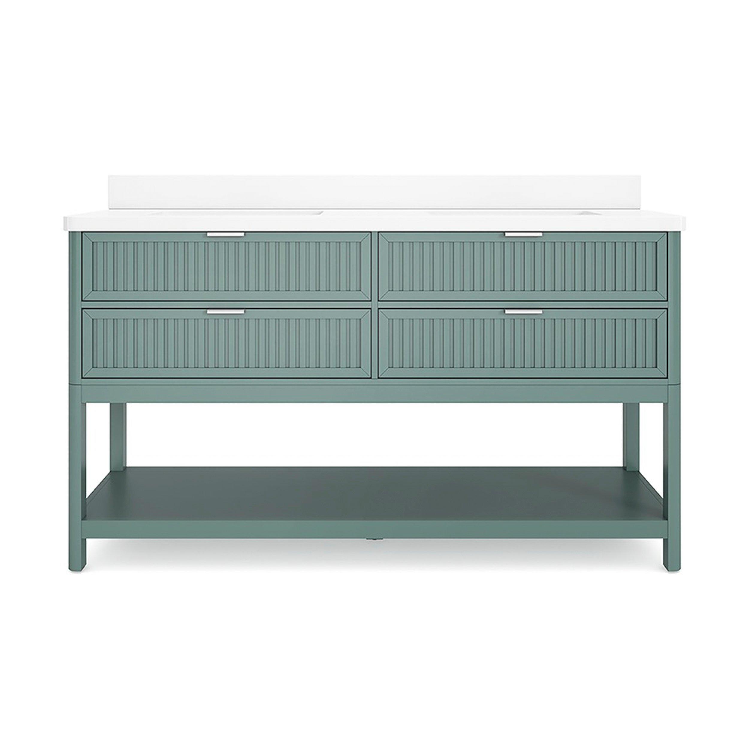 Complete your bathroom with the beautiful Palma 61 in. Blue Vanity with Engineered Stone Top. This wall mounted or freestanding features durable solid wood, mdf cabinets in stunning blue with a white composite vanity top and brushed multi hardware. A charming double undermount sink in brilliant white is included. The Palma 61 in. Blue Vanity with Engineered Stone Top is a versatile choice to customize multiple bathroom settings.