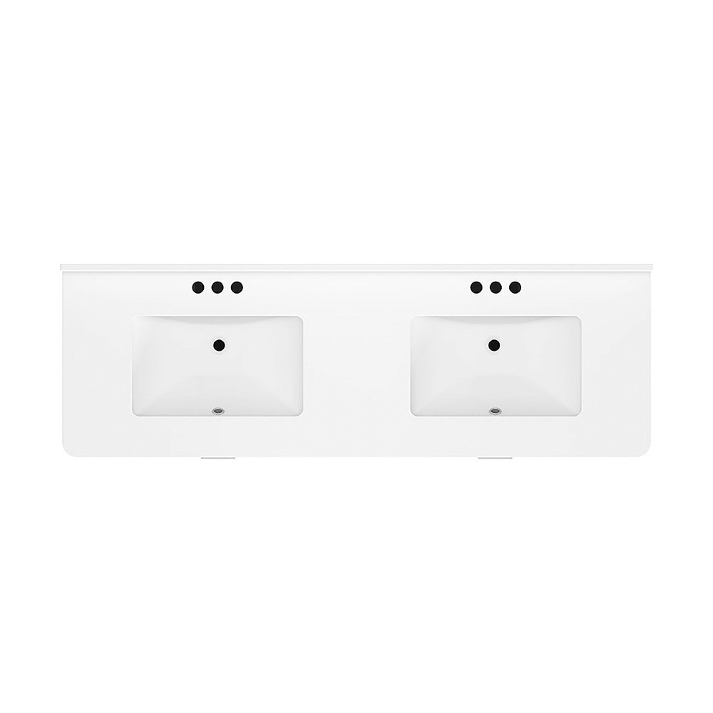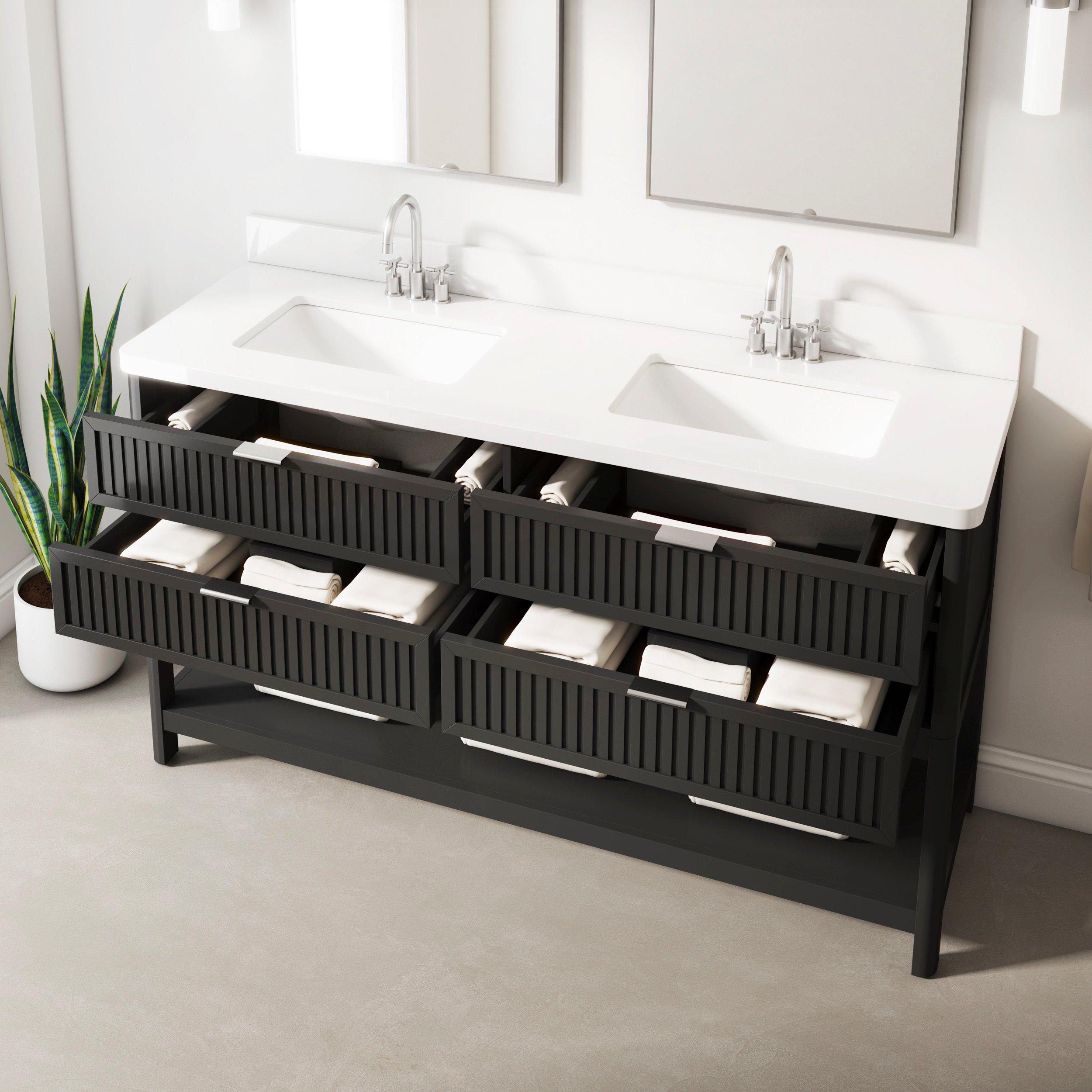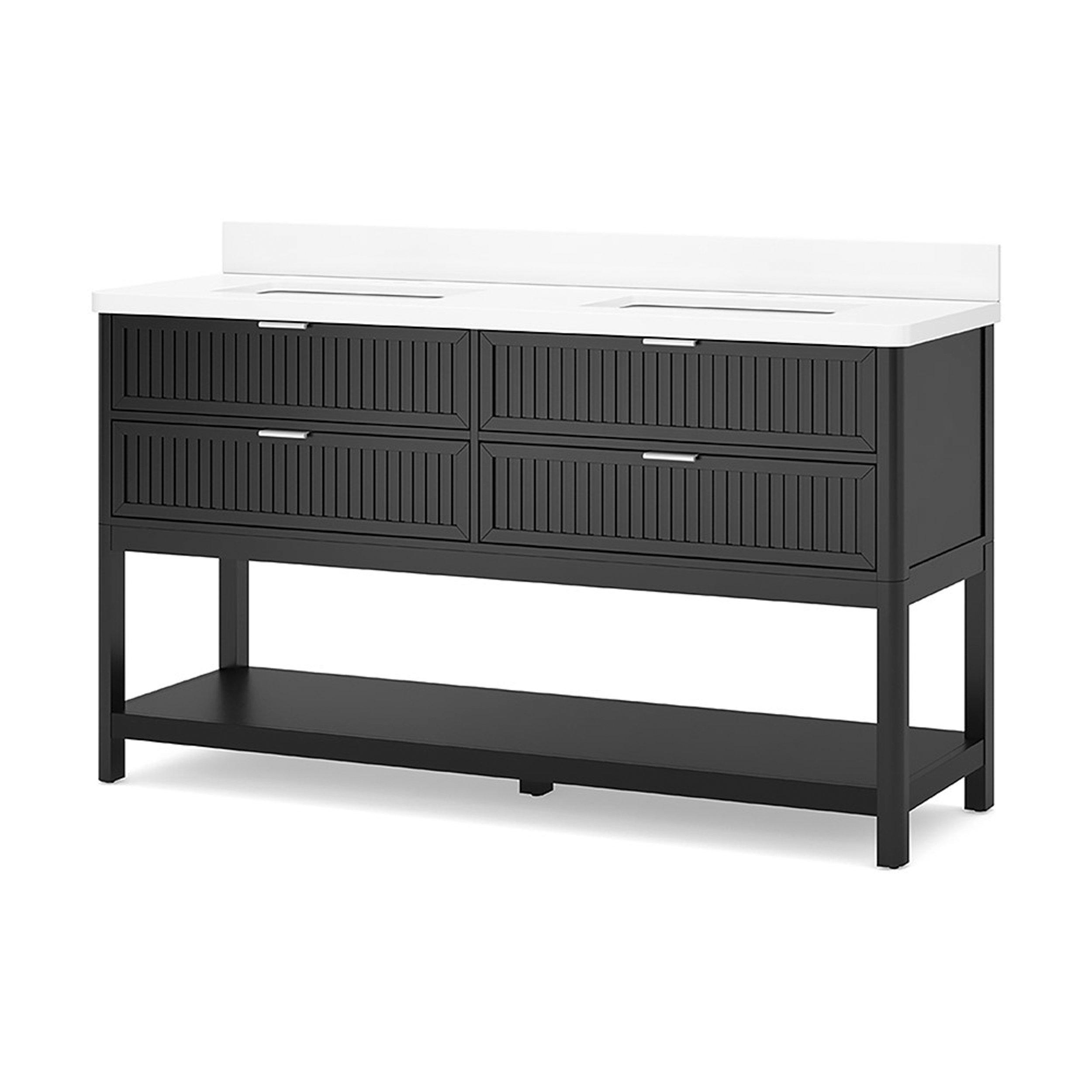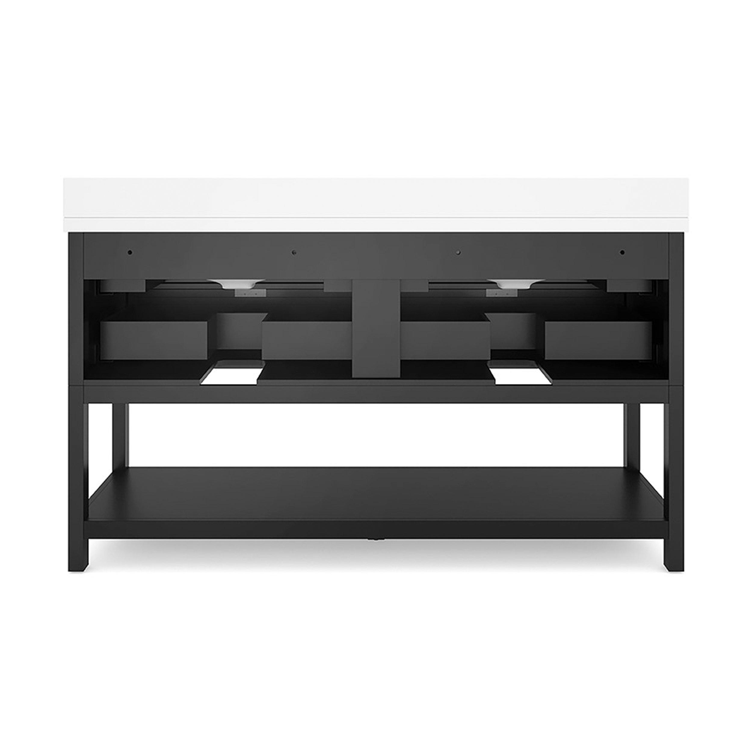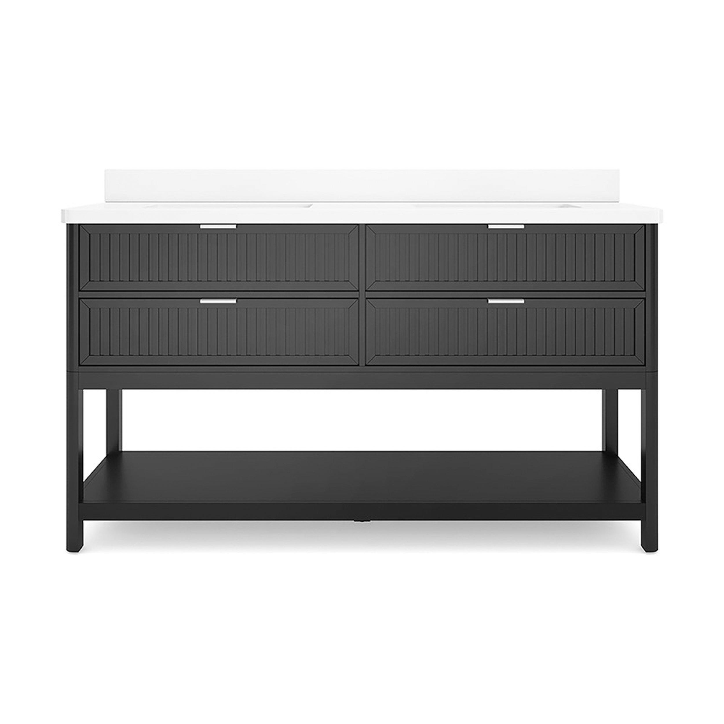 Complete your bathroom with the beautiful Palma 61 in. Black Vanity with Enginnered Stone Top. This wall mounted or freestanding features durable solid wood, mdf cabinets in stunning black with a white composite vanity top and brushed multi hardware. A charming double undermount sink in brilliant white is included. The Palma 61 in. Black Vanity with Enginnered Stone Top is a versatile choice to customize multiple bathroom settings.