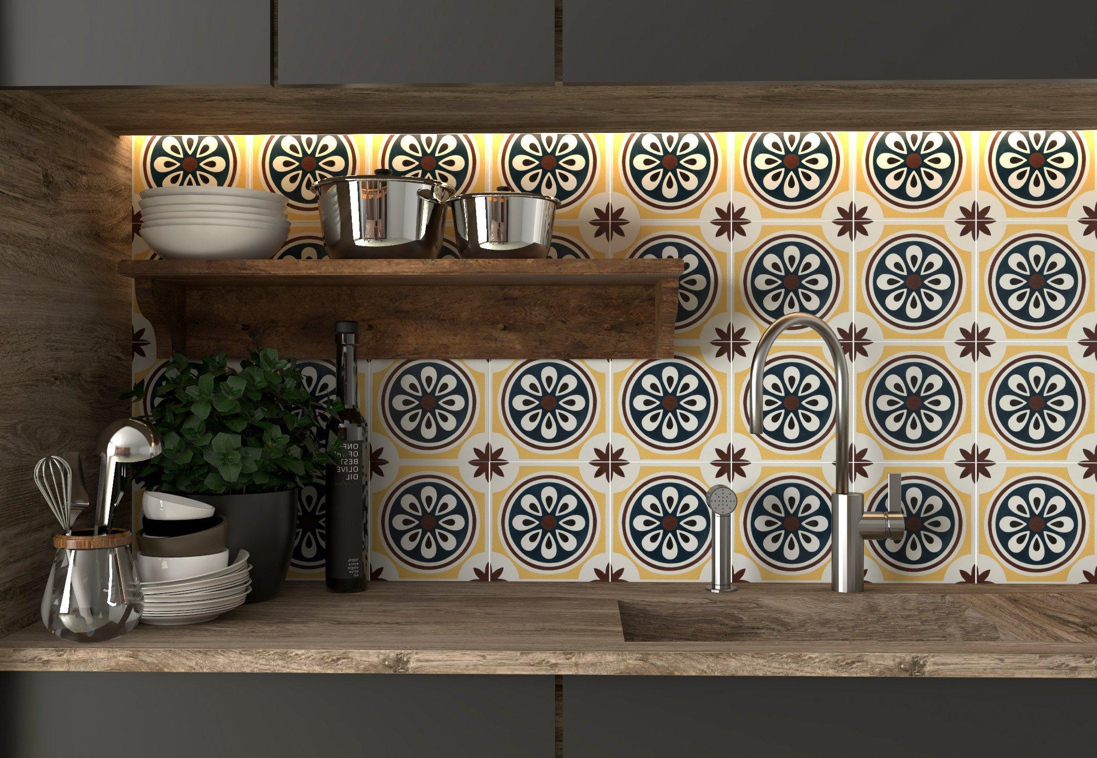 Personalize your space with the Clementina Encaustic Cement Tile. This multi color matte finish tile will make a great impact in small areas like the bathroom, den, or other overlooked spaces.