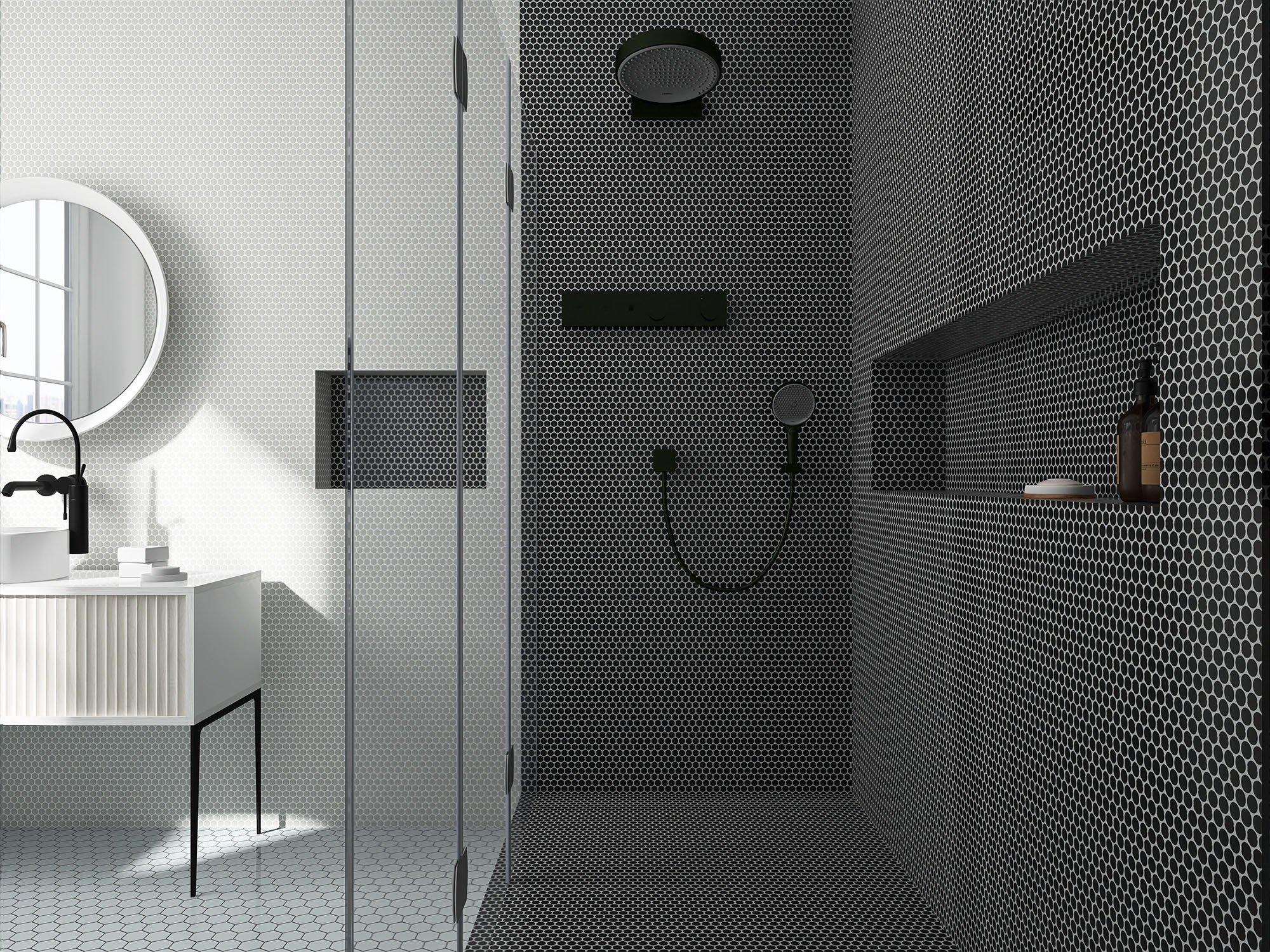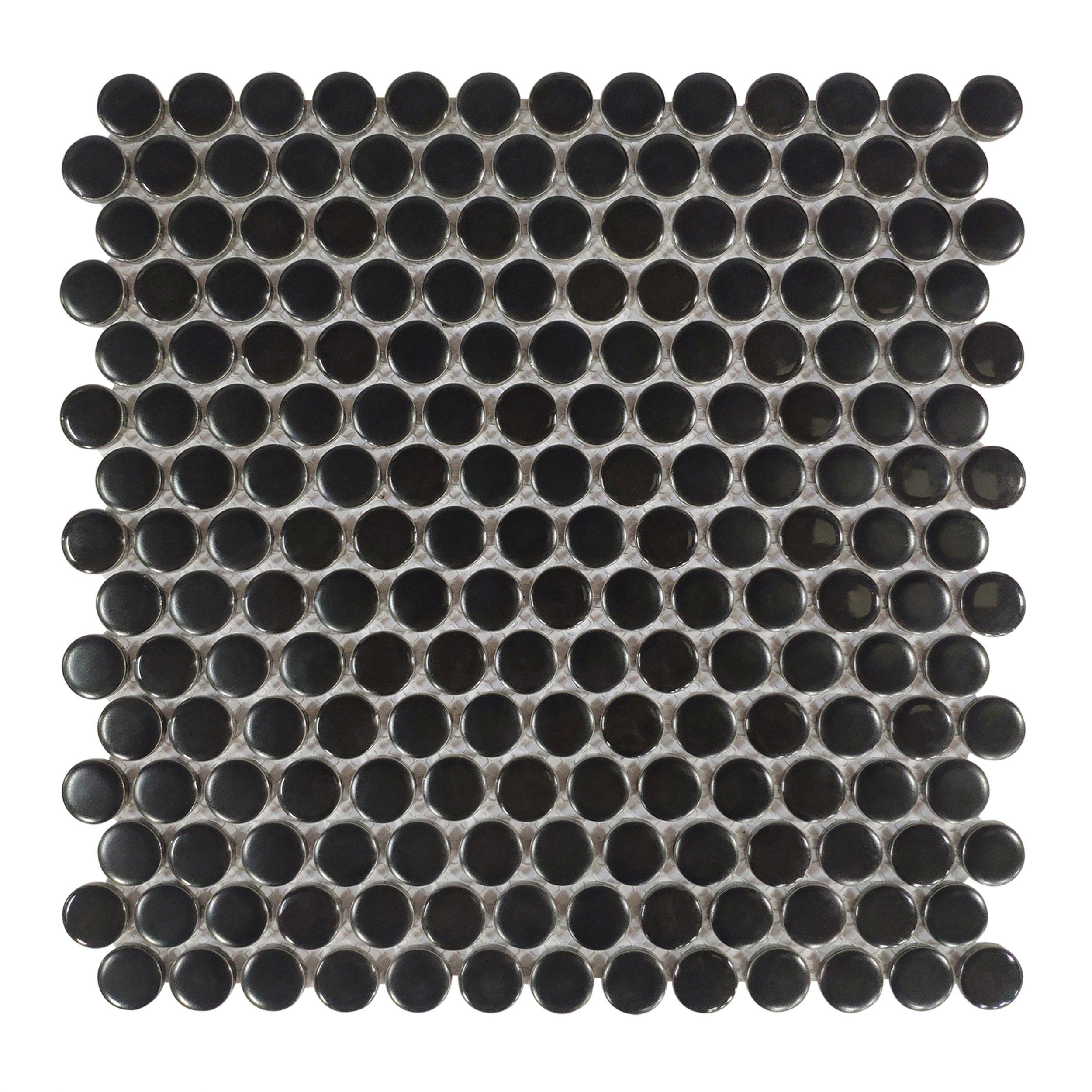For an elevated look to your design, choose the Raven Penny Mixed Finish Porcelain Mosaic with a multi finish finish. Use this black tile to add new visual interest in any space like the bathroom, kitchen, living room, and more.