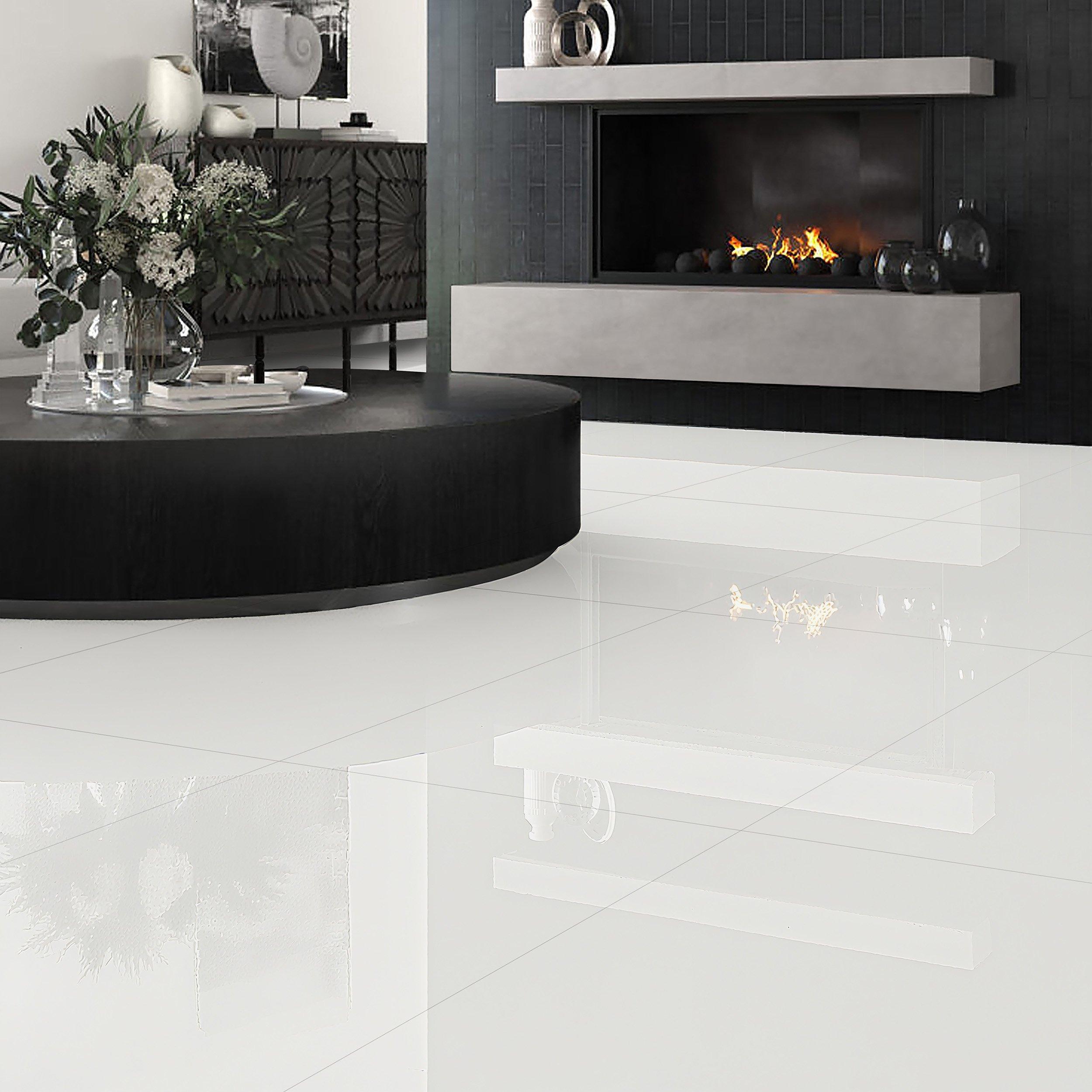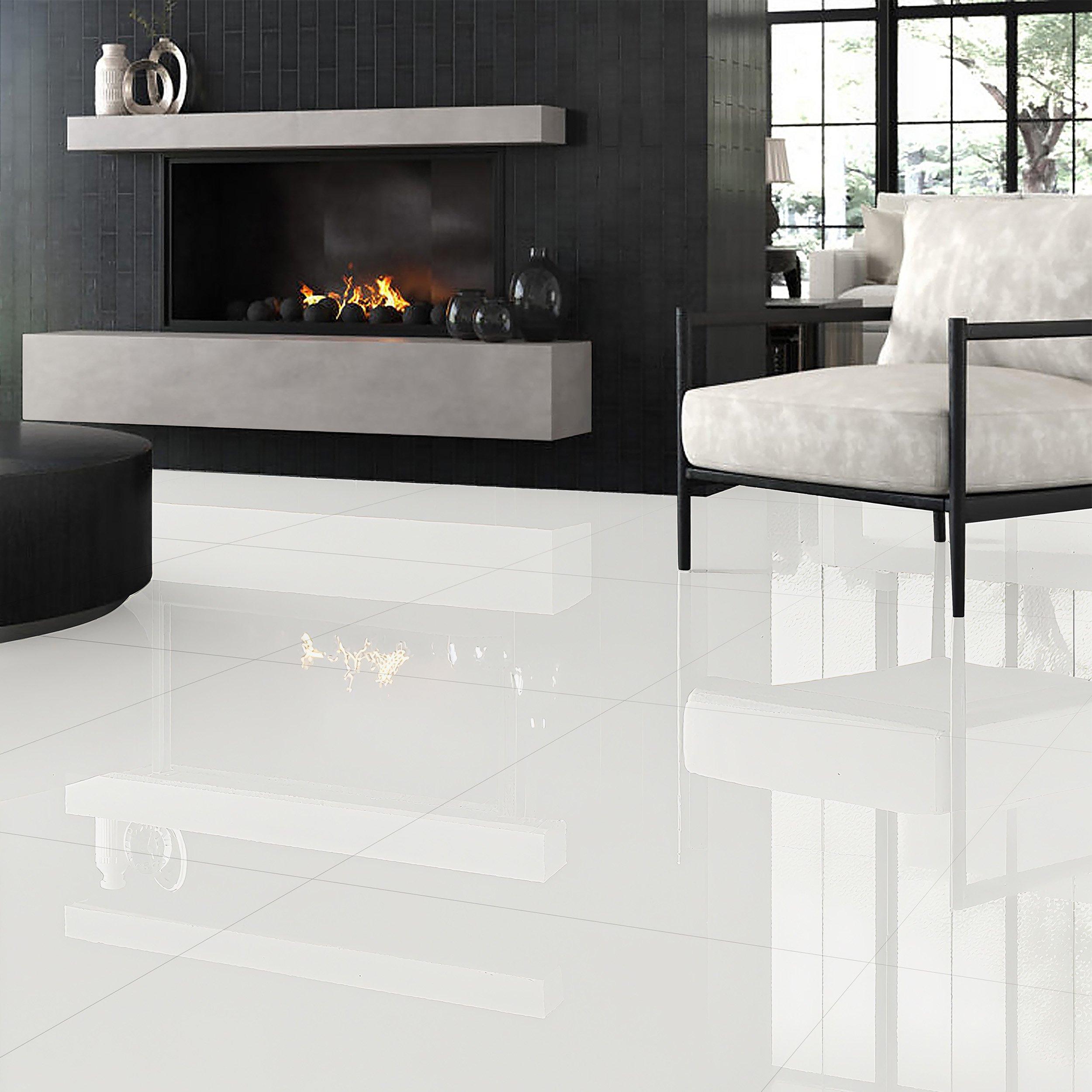 With a polished finish, this white Alaskan White Polished Porcelain Tile is 32 x 32.