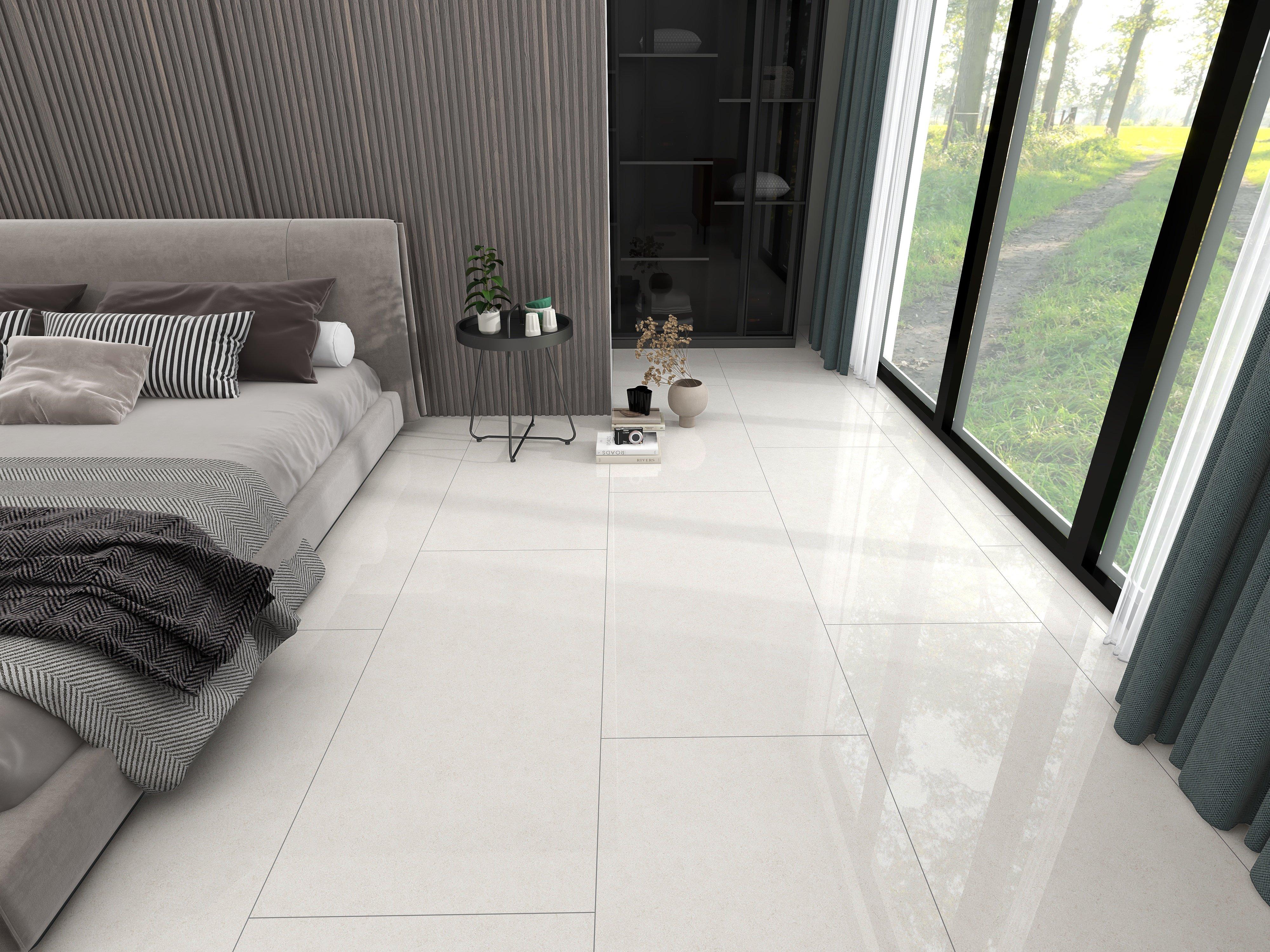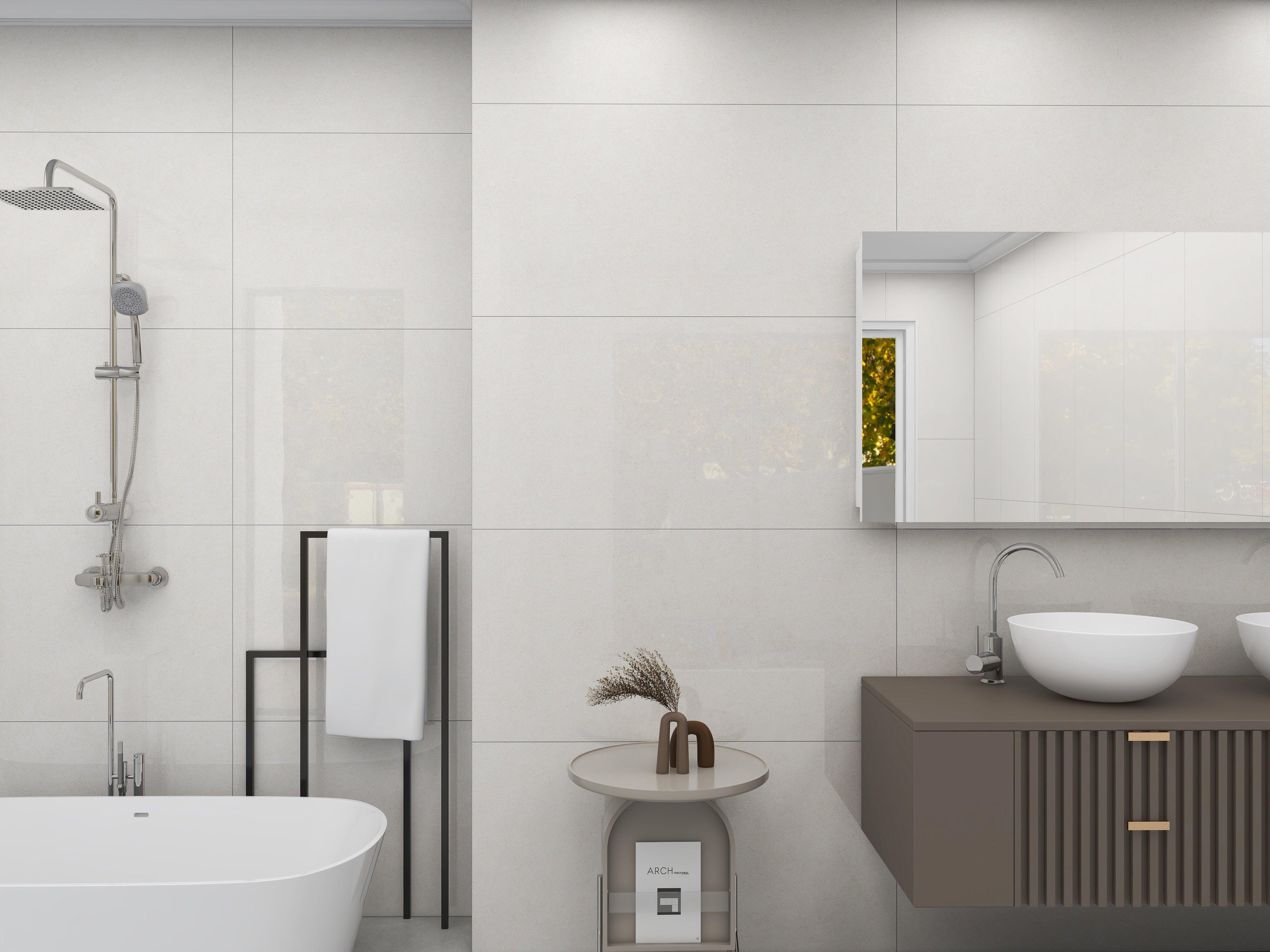 This white polished Athena Ice Polished Porcelain Tile is 24 x 48.