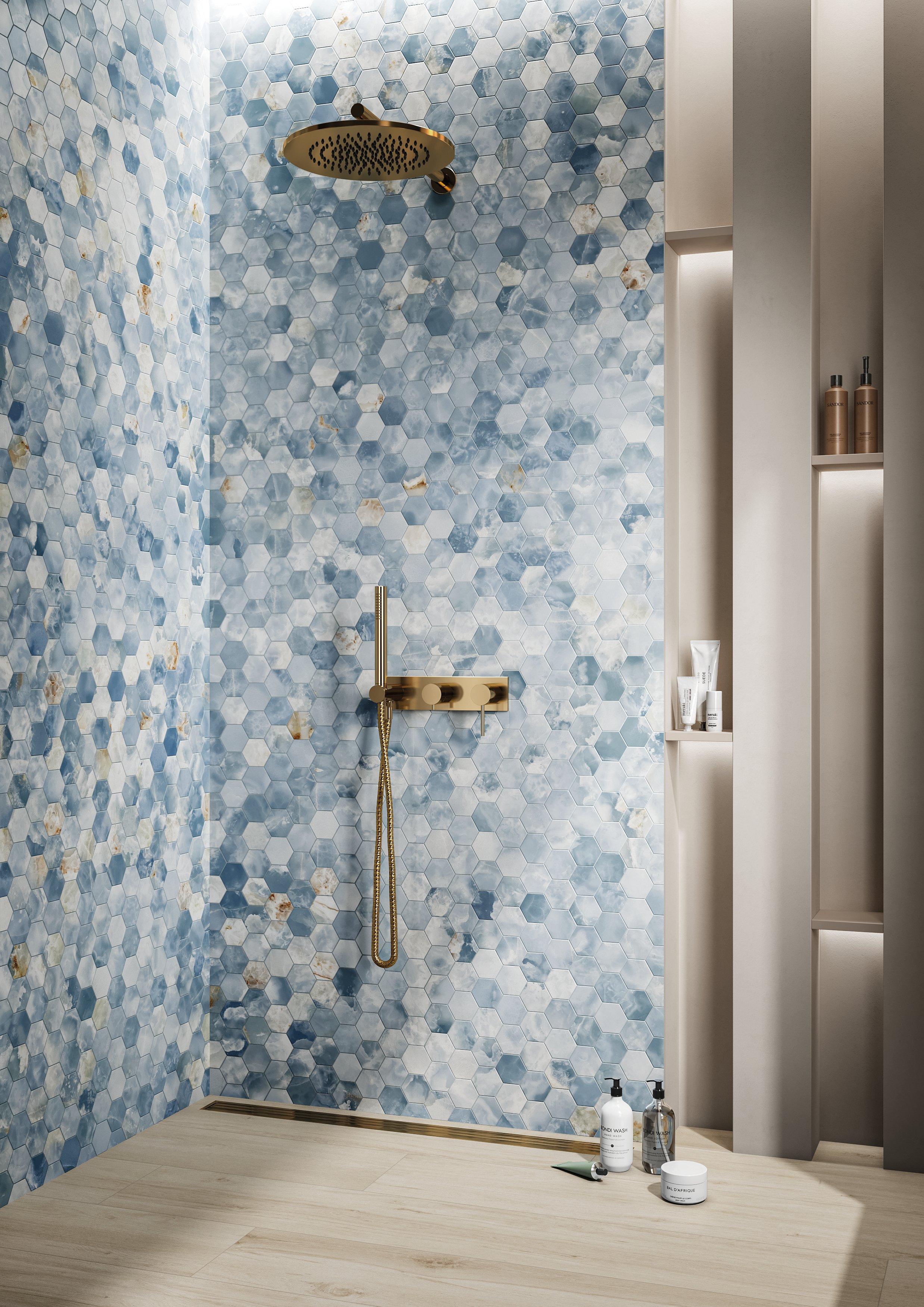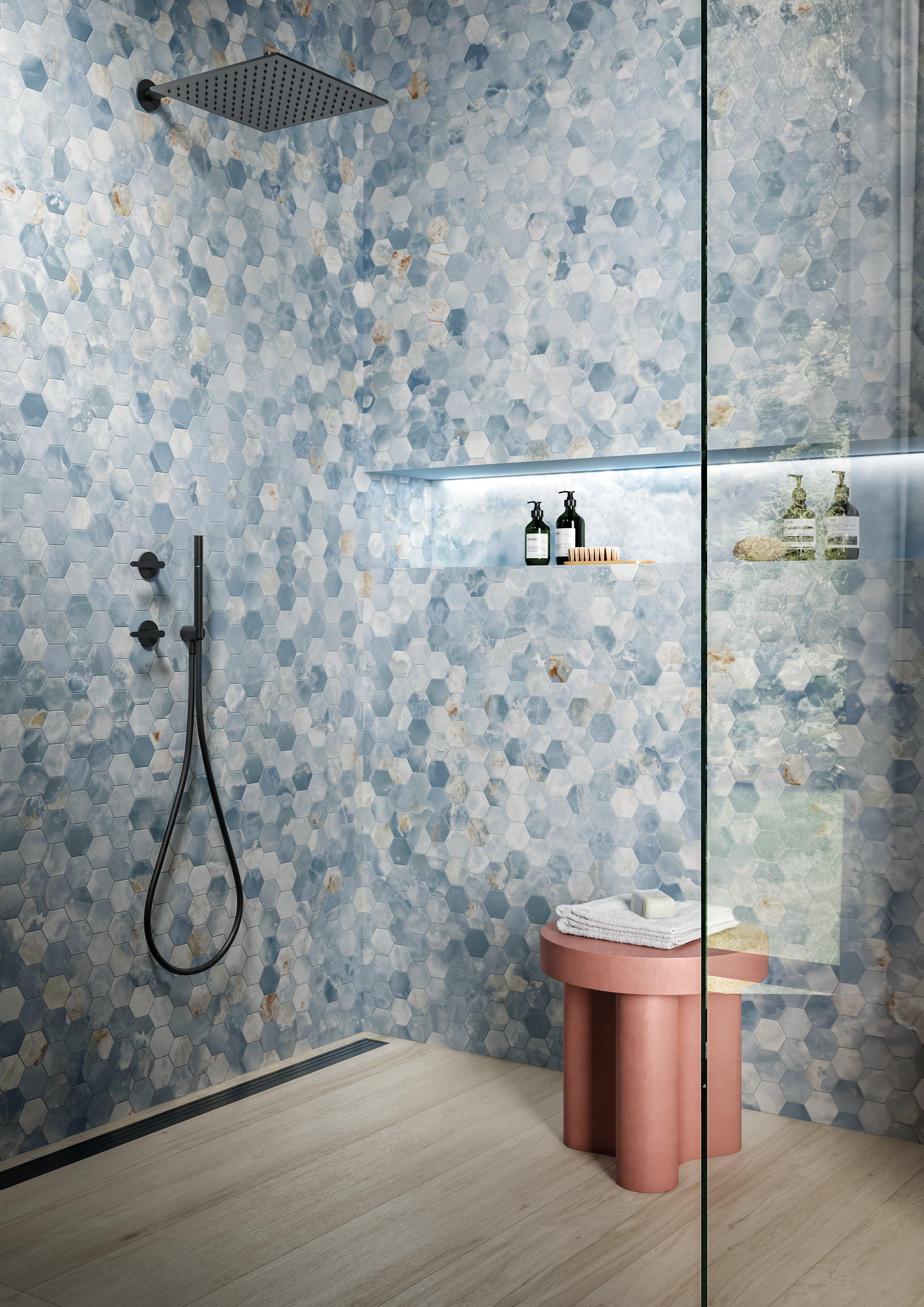 Create a whole new look or enhance your existing style with the easy-to-install Aurelio Azul Hexagon Porcelain Mosaic from Floor & Decor’s exclusive Maximo tile. There’s no need to demolish your old tile with this thin tile, you can save time, stress, and mess! Simply install this over your existing tile (or the existing subfloors, too) for a quick update. It’s easy to clean and perfect in areas like sunrooms, mudrooms, kitchens, or bathrooms!  Not only does it eliminate the time, stress, and mess of traditional tile installation, it offers a stylish and durable solution for any space.