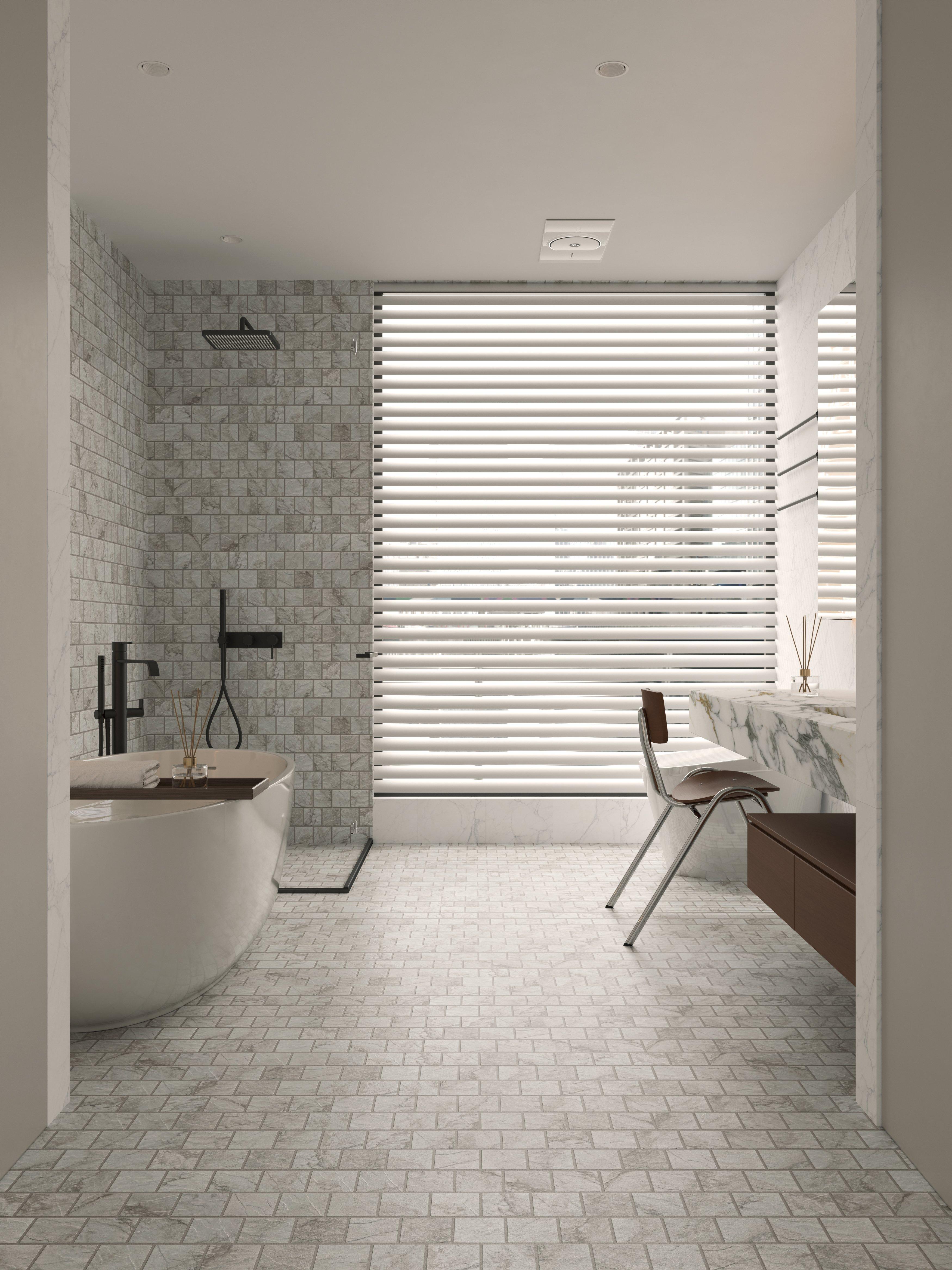 Personalize your space with the Calacatta Gold 3in. Square Matte Porcelain Mosaic. This brown matte finish tile will make a great impact in small areas like the bathroom, den, or other overlooked spaces.
