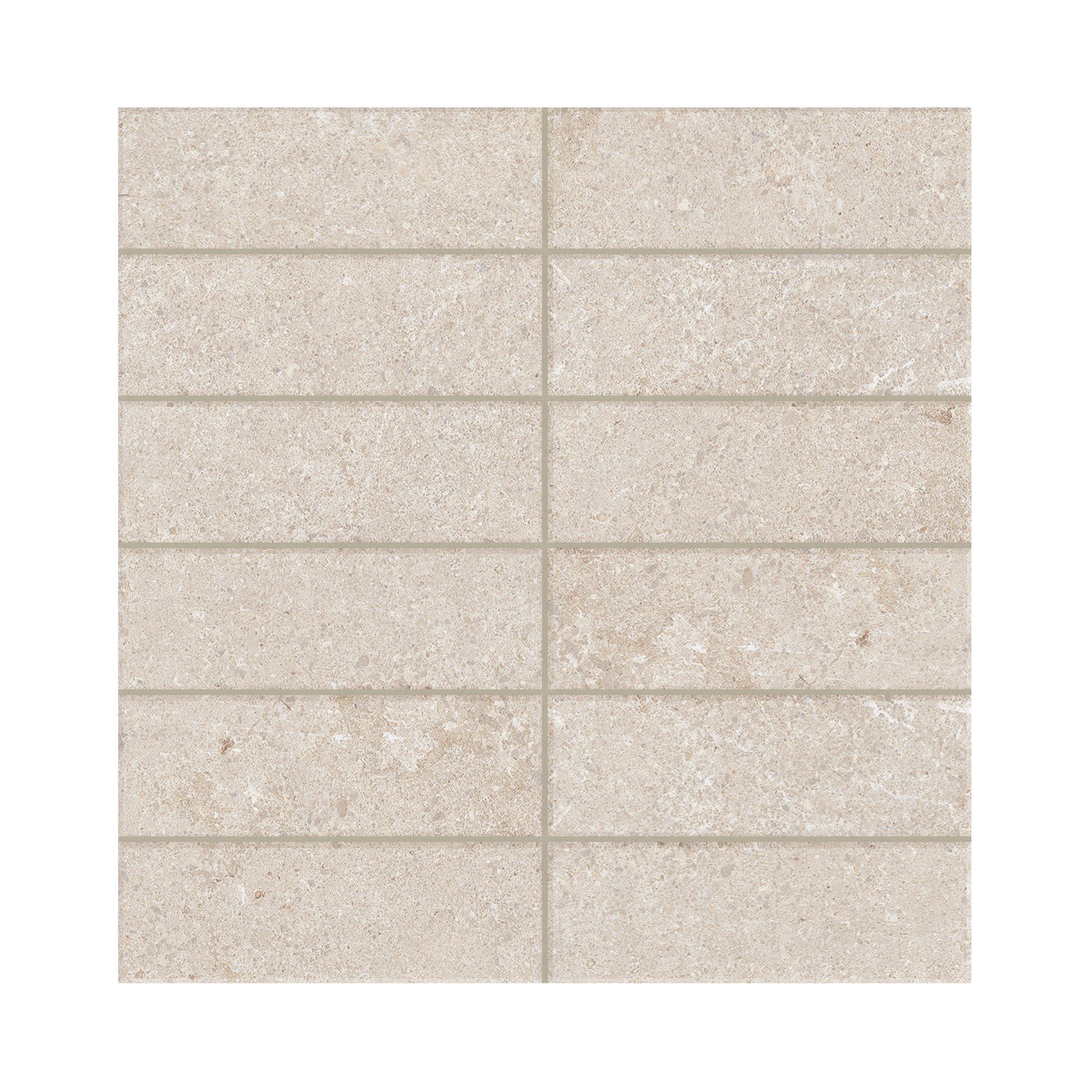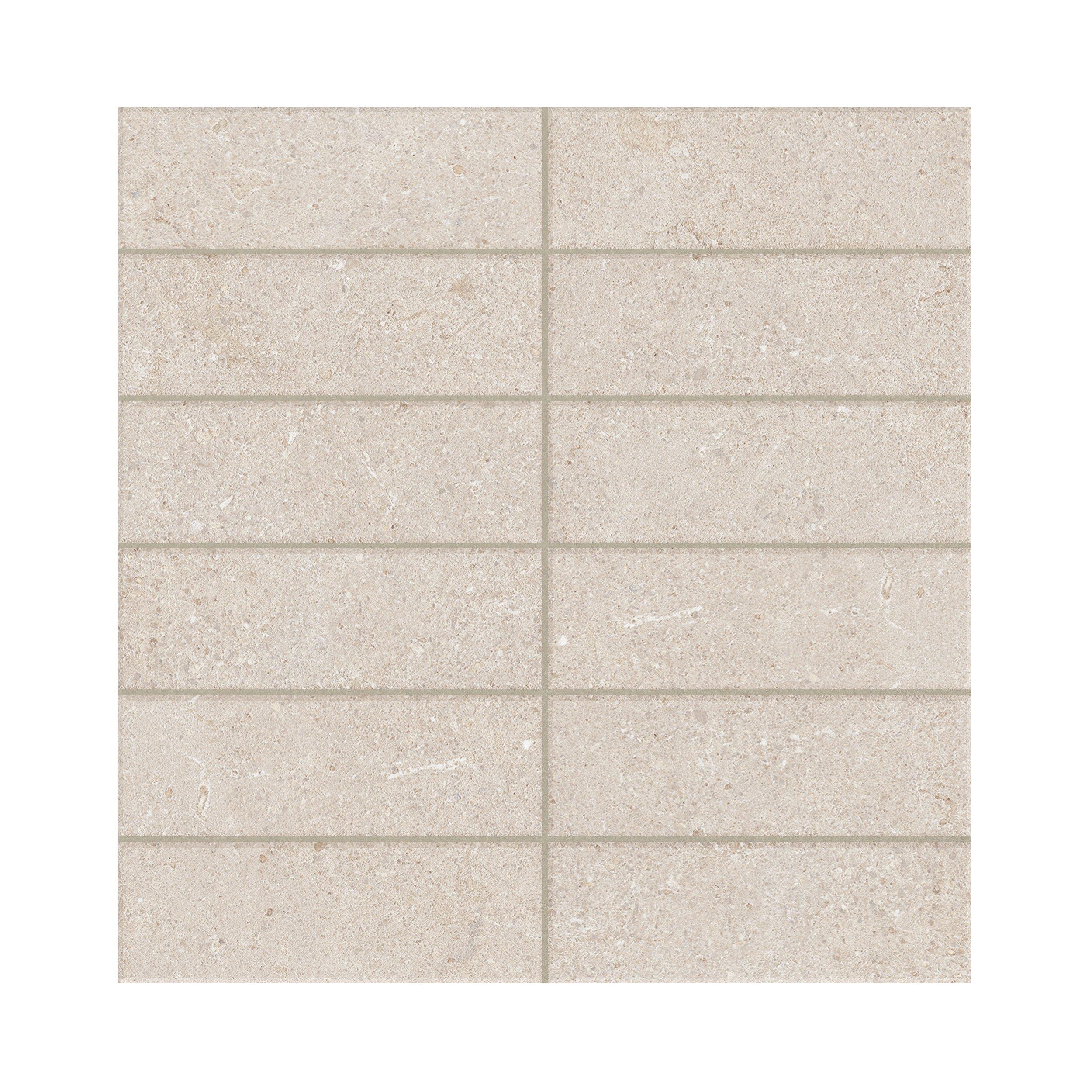 Capri Almond Stack Matte Porcelain Mosaic is available in a 12 x 12 nominal size, featuring a rectangle shape. Its limestone look and matte finish make it an excellent choice for any residential or commercial project.