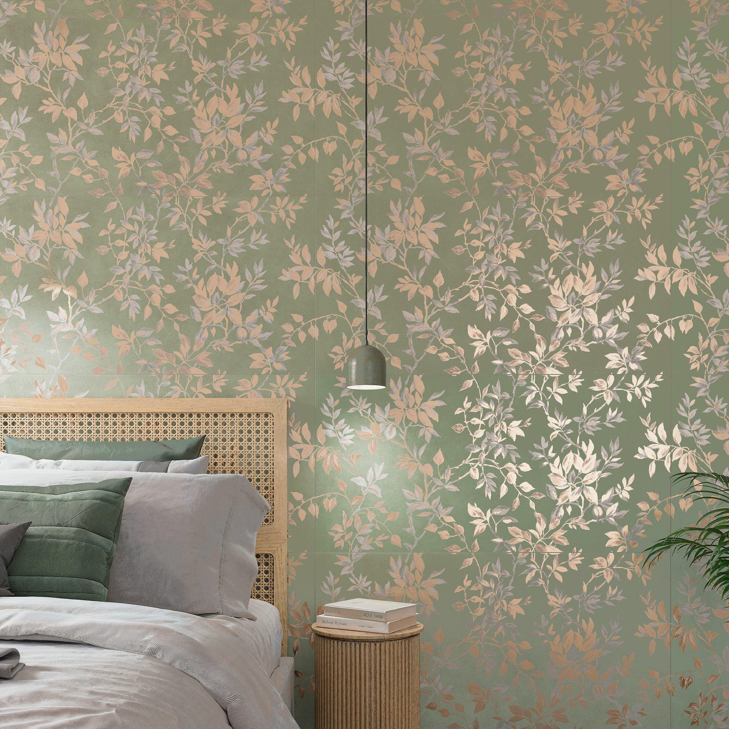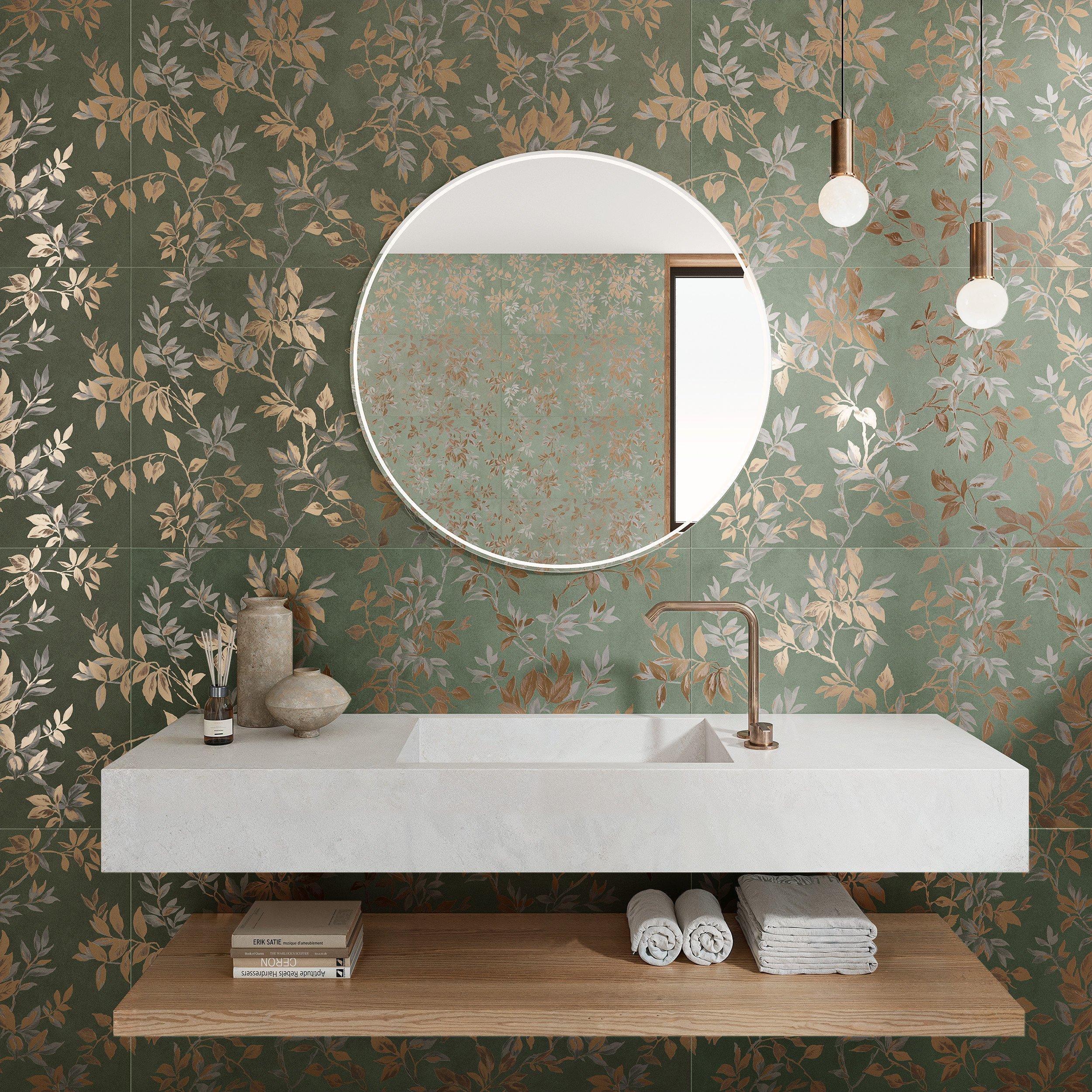 Elevate your space with this contemporary Celine Verde Floral Porcelain Tile. Featuring a gorgeous matte, it creates a grand piece perfect for walls in a living room, dining room, bathroom or backsplash.