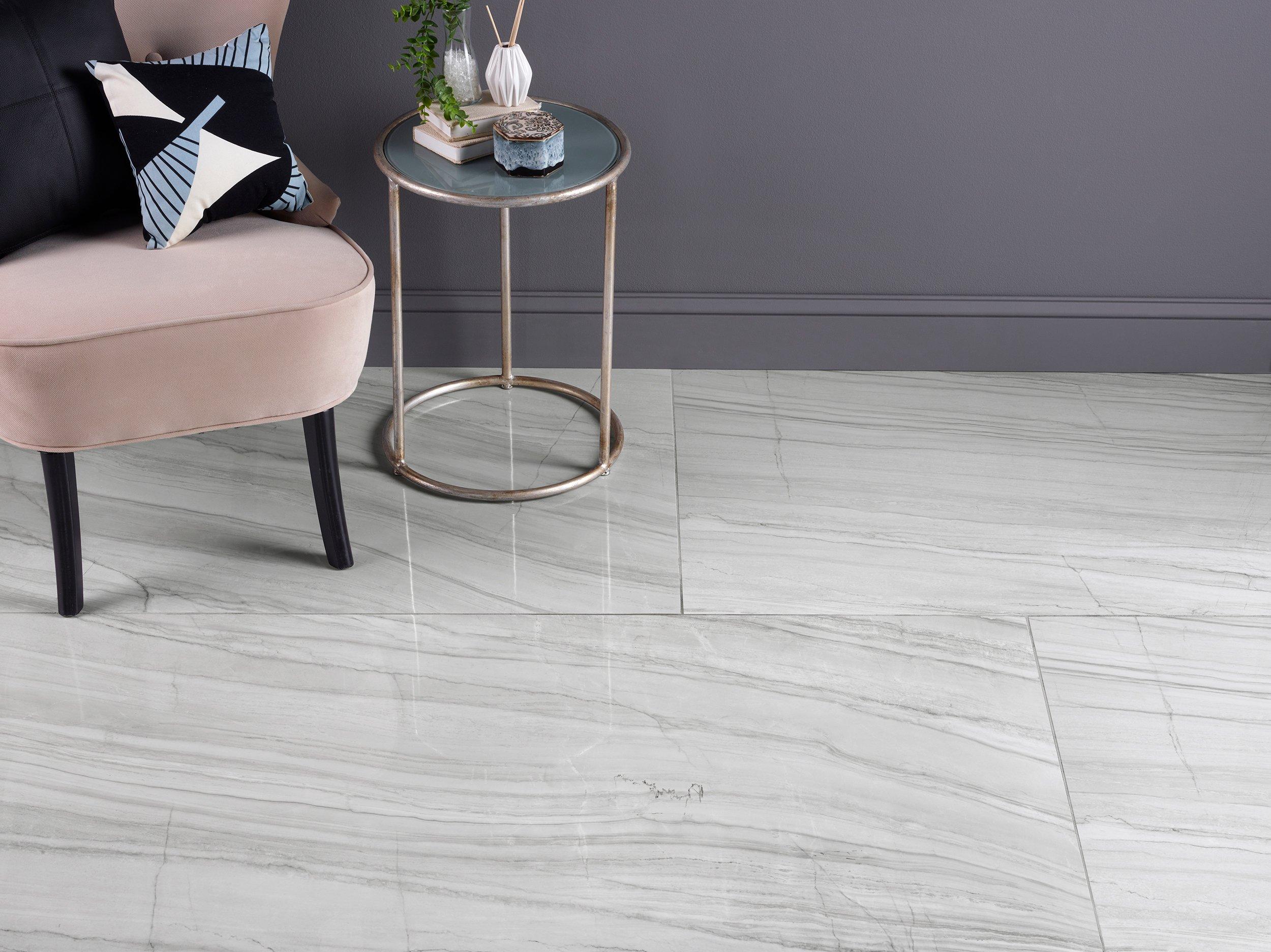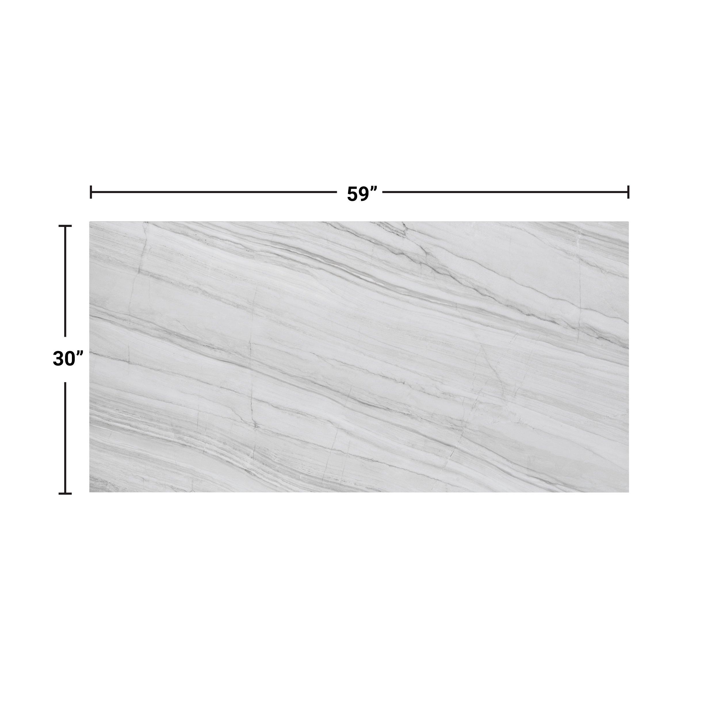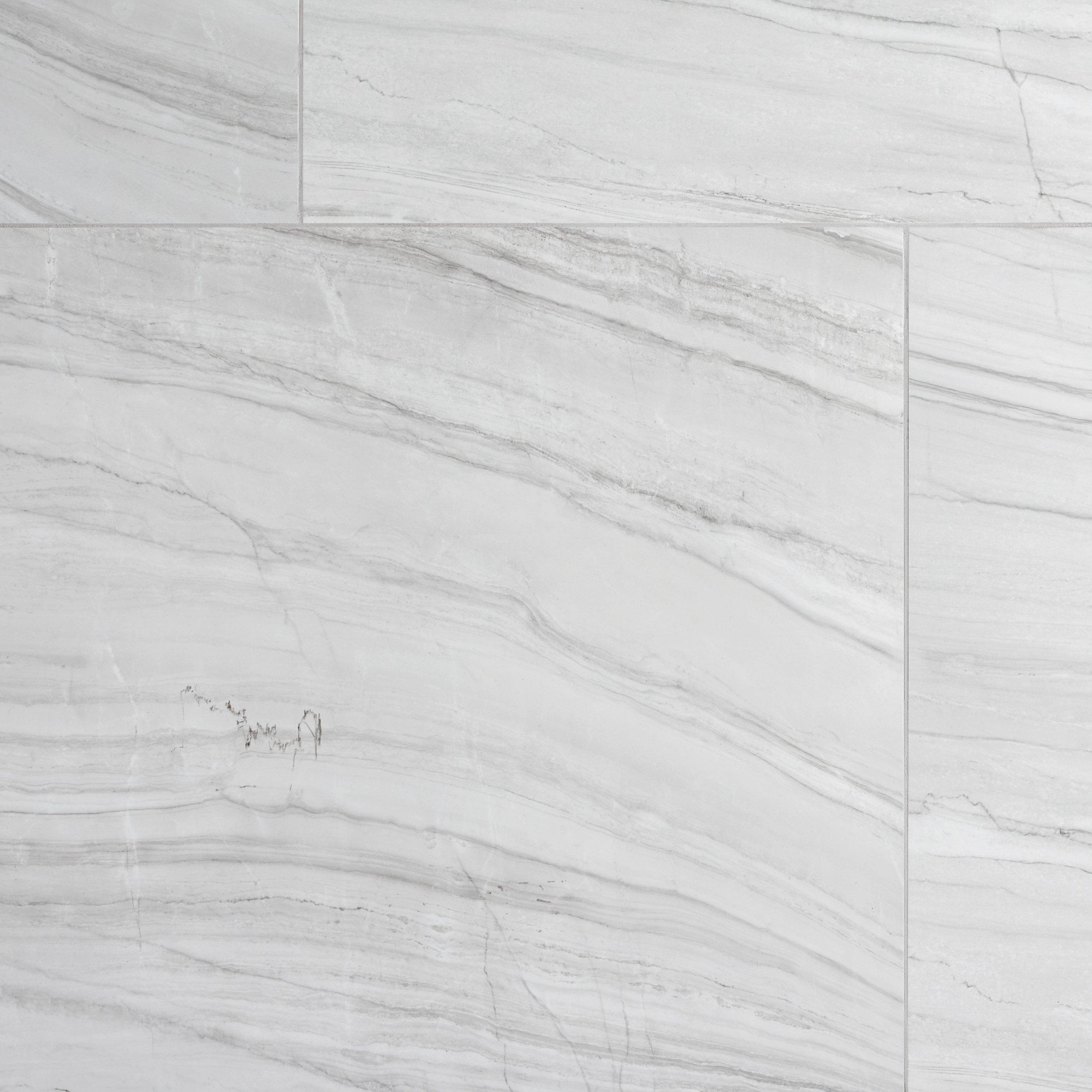 This white Cyrus Falls Polished Porcelain Tile is 30 x 59 with polished or high gloss finish.