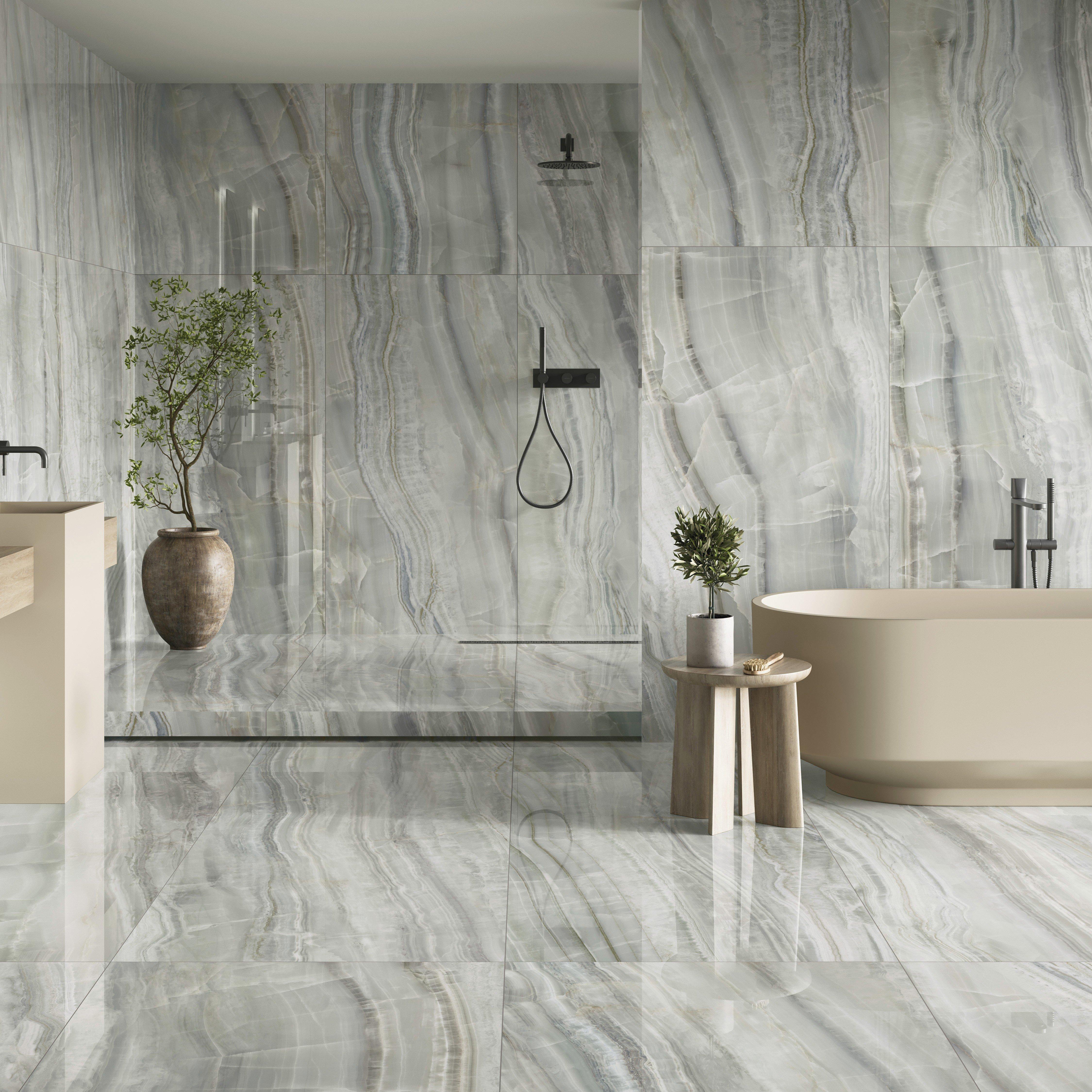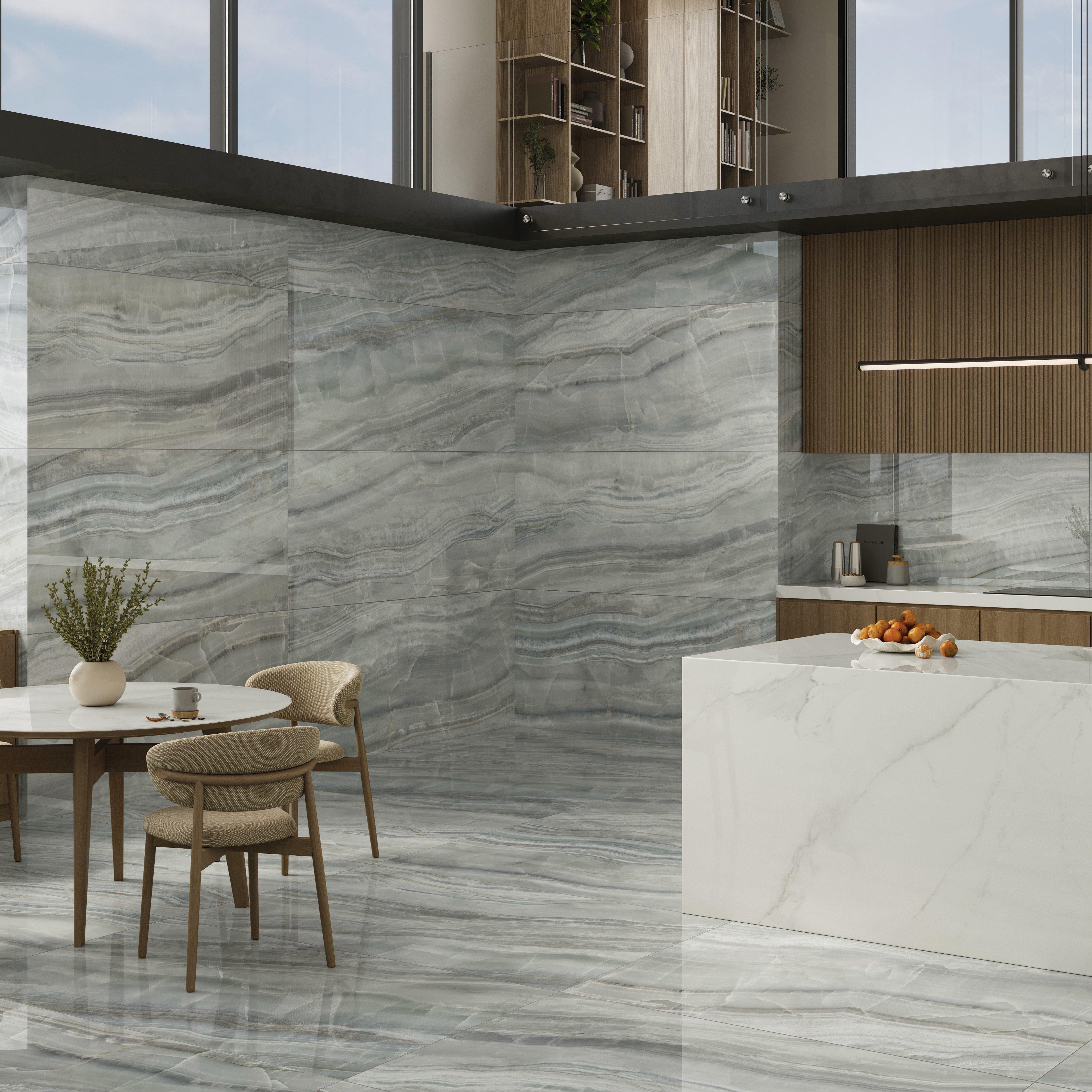 Gemma Onice Polished Porcelain Tile by Maximo is the epitome of elegance and durability, perfect for your bathroom or kitchen. This premium tile combines a polished finish with a straight edge, ensuring a sleek and sophisticated look that enhances any space.