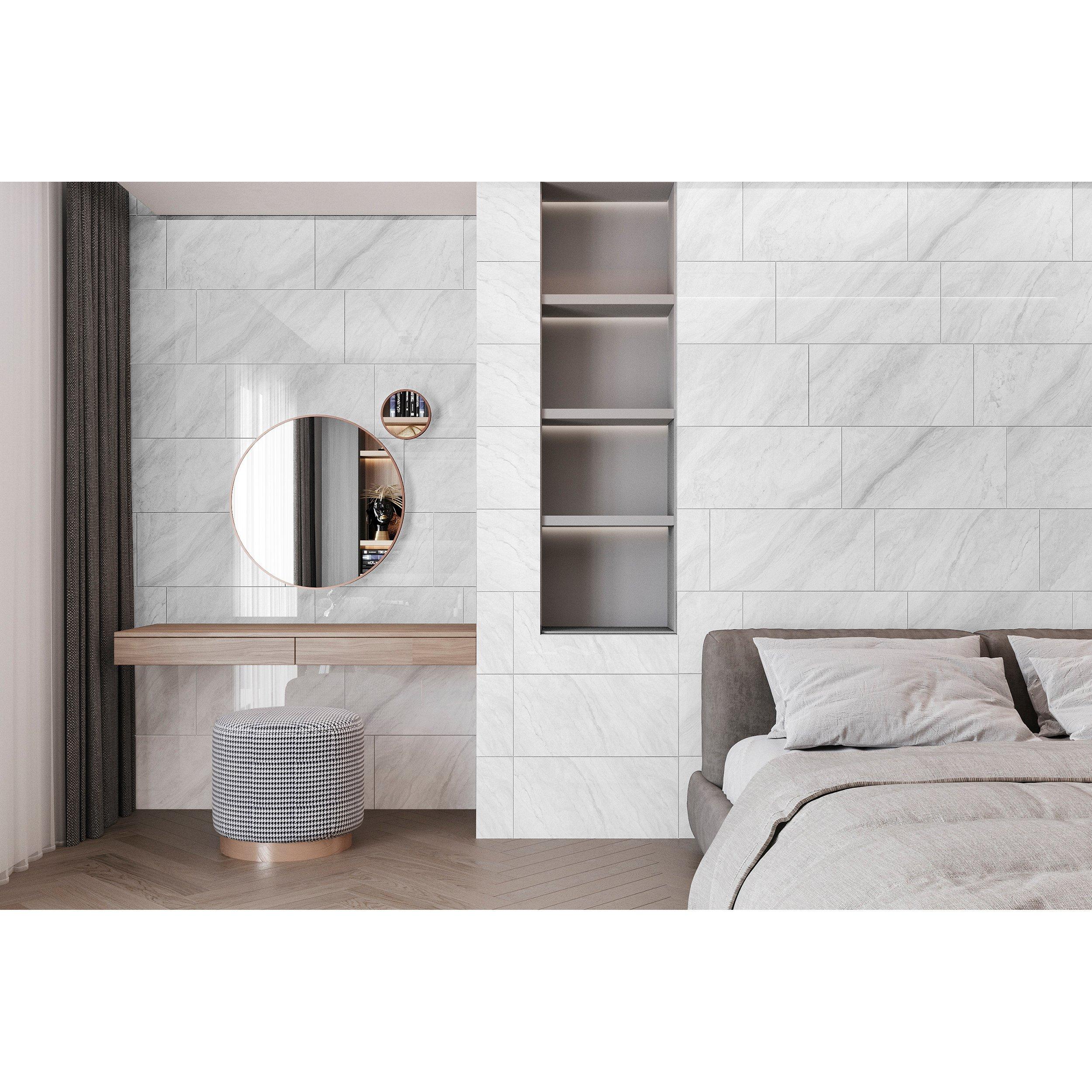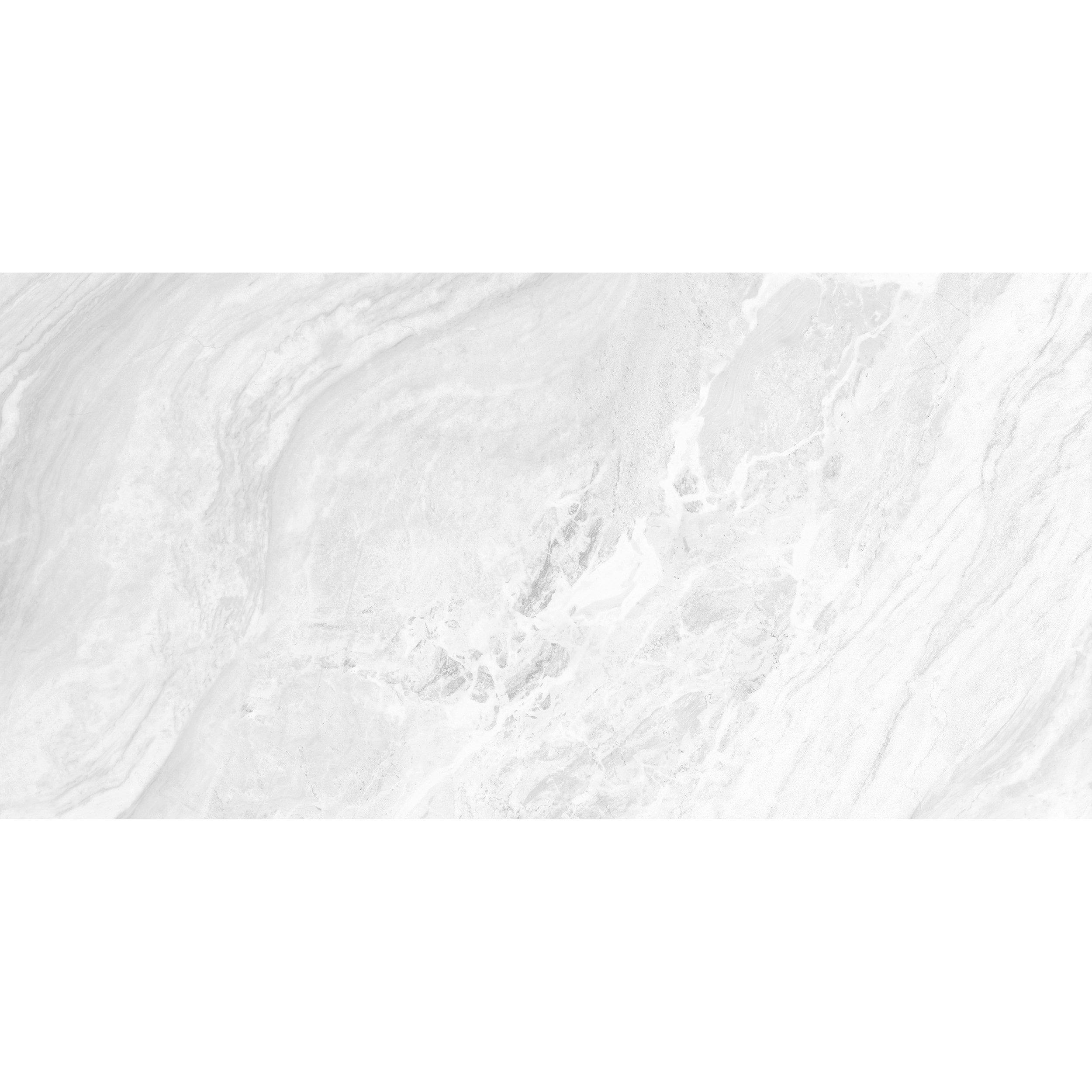 With a polished finish, this gray Harmony White Polished Porcelain Tile is 12 x 24.