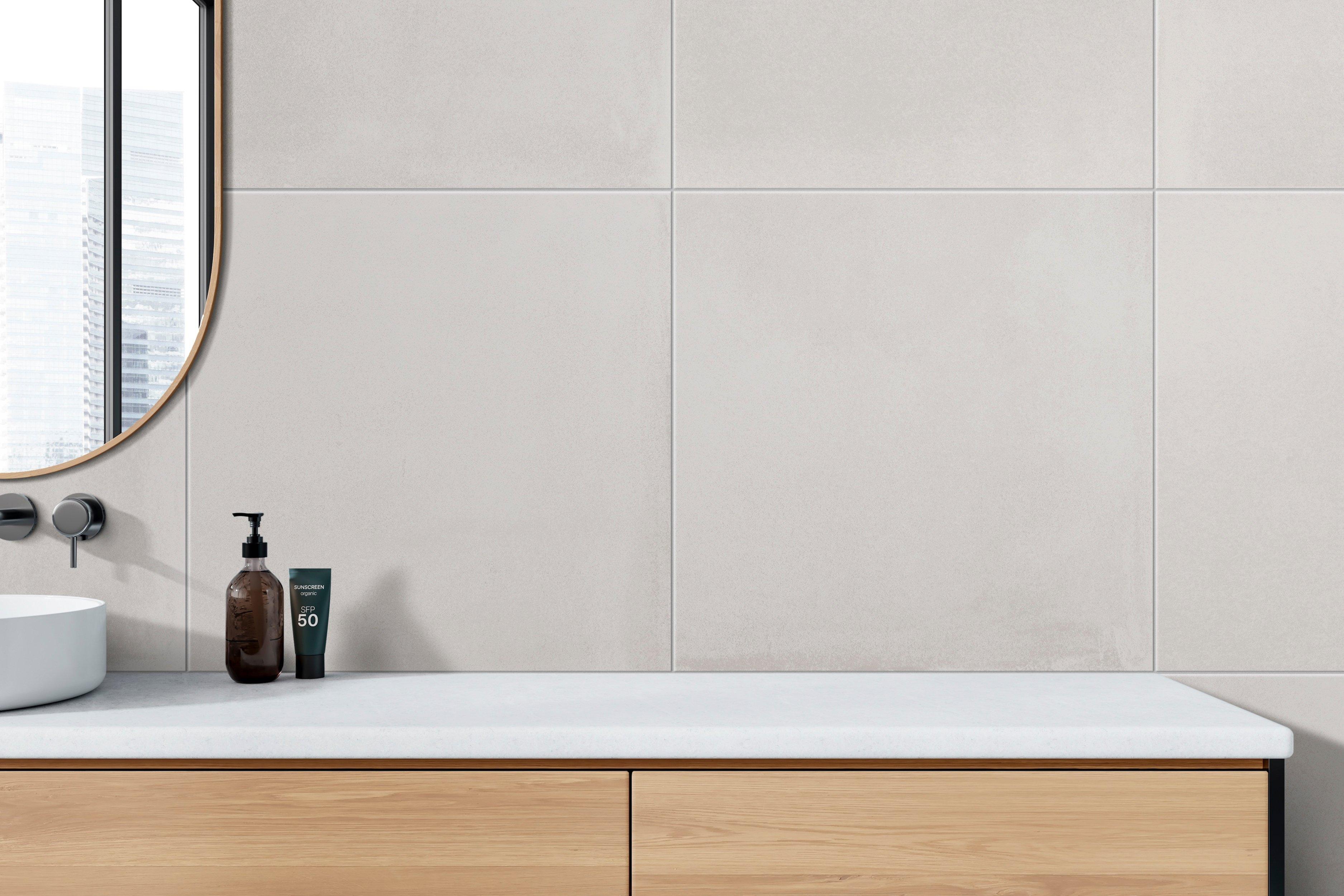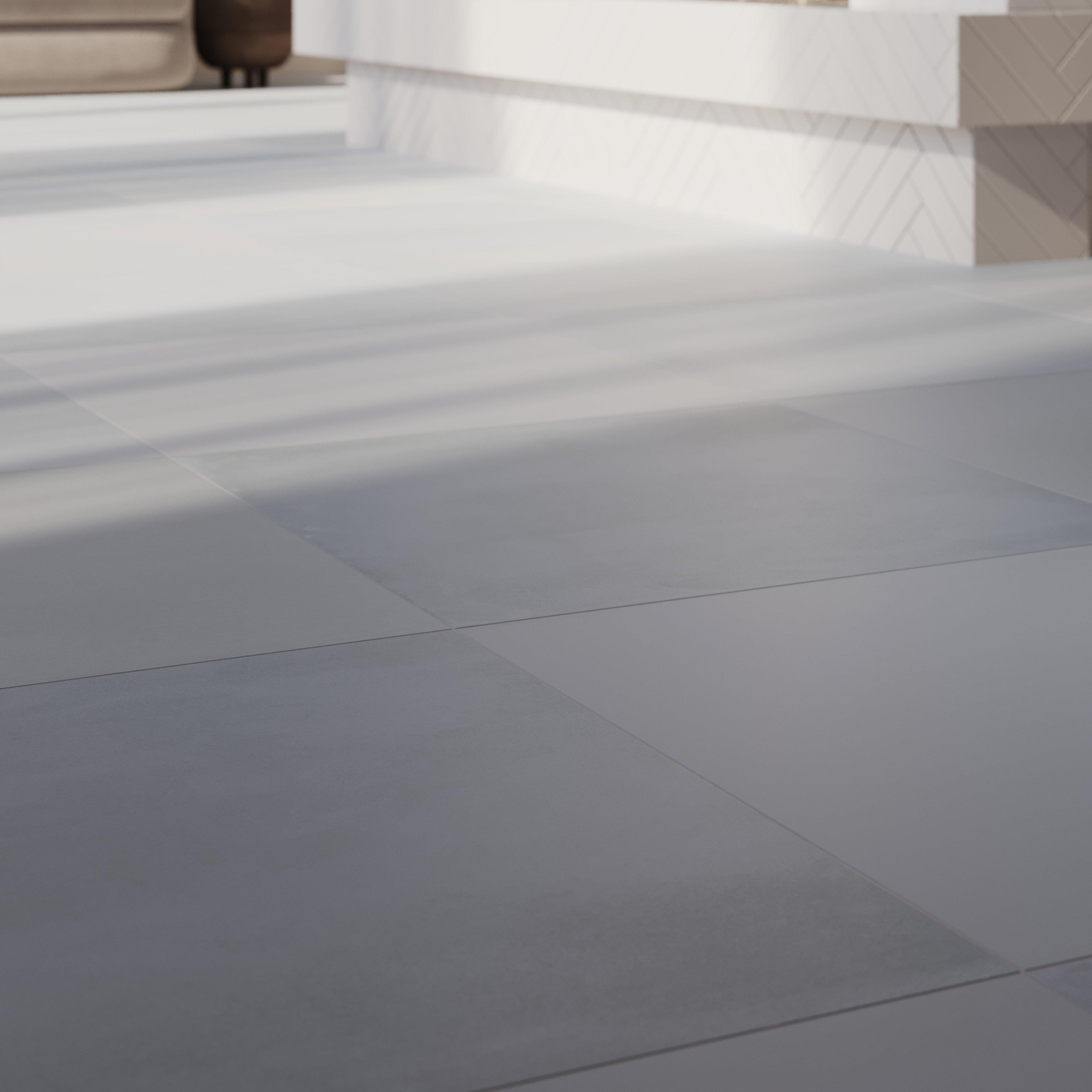 With a matte finish, this gray Luxe Fog Matte Porcelain Tile is 24 x 24.