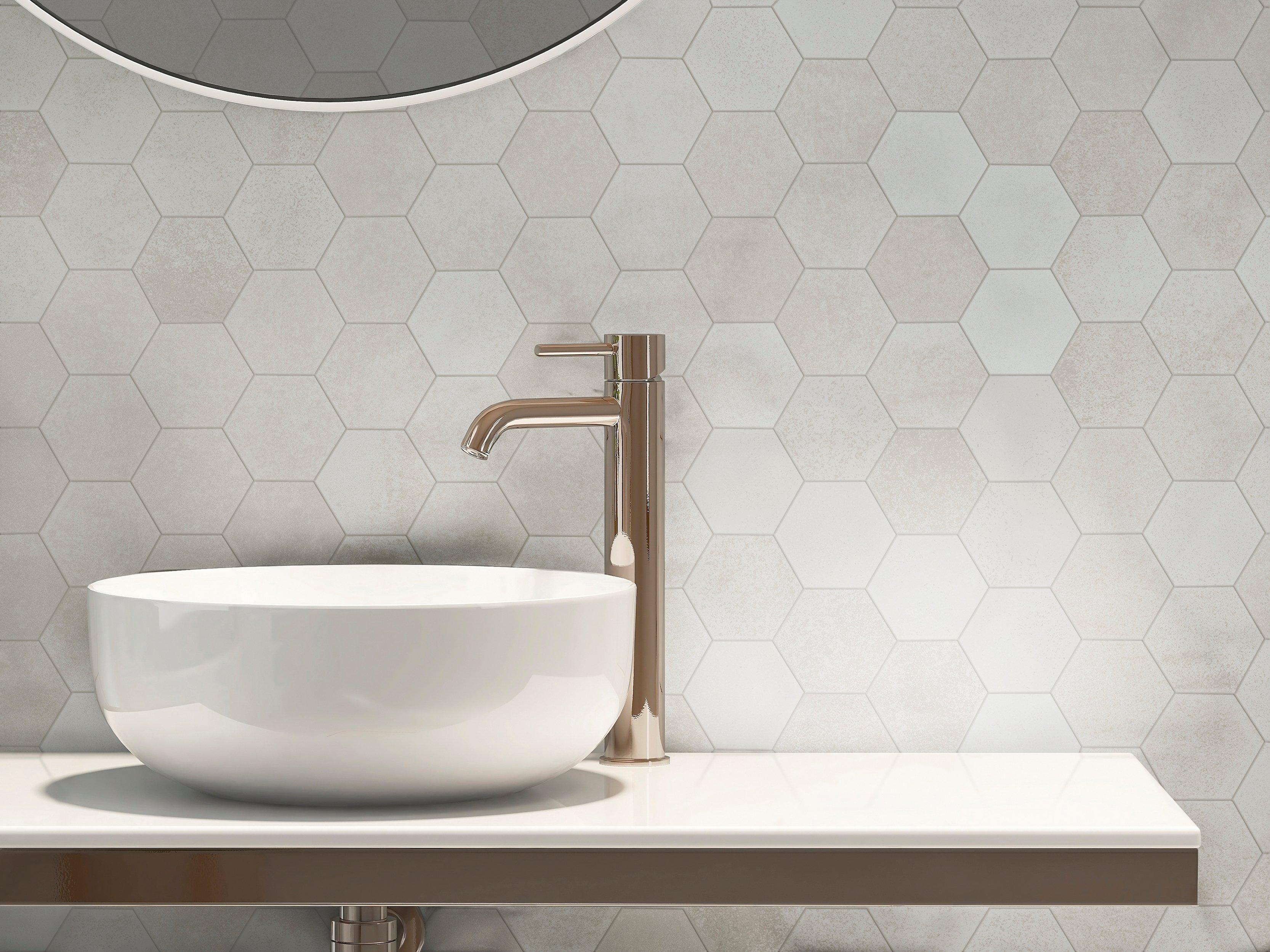 This white matte Luxe Sand Hexagon Matte Porcelain Mosaic is 12 x 12.