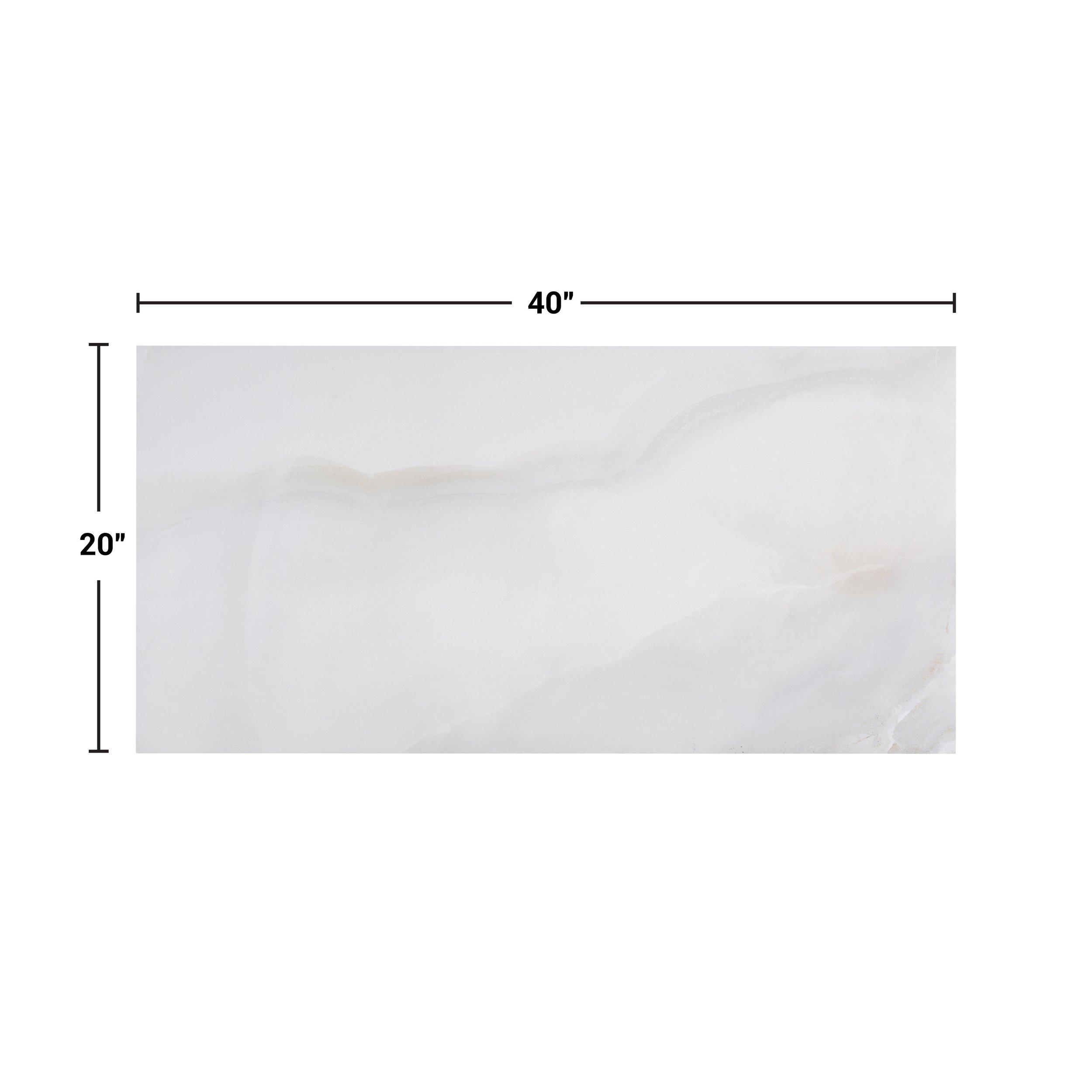 With a polished or high gloss finish, this white Montevino Onyx Polished Porcelain Tile is 19 x 39.