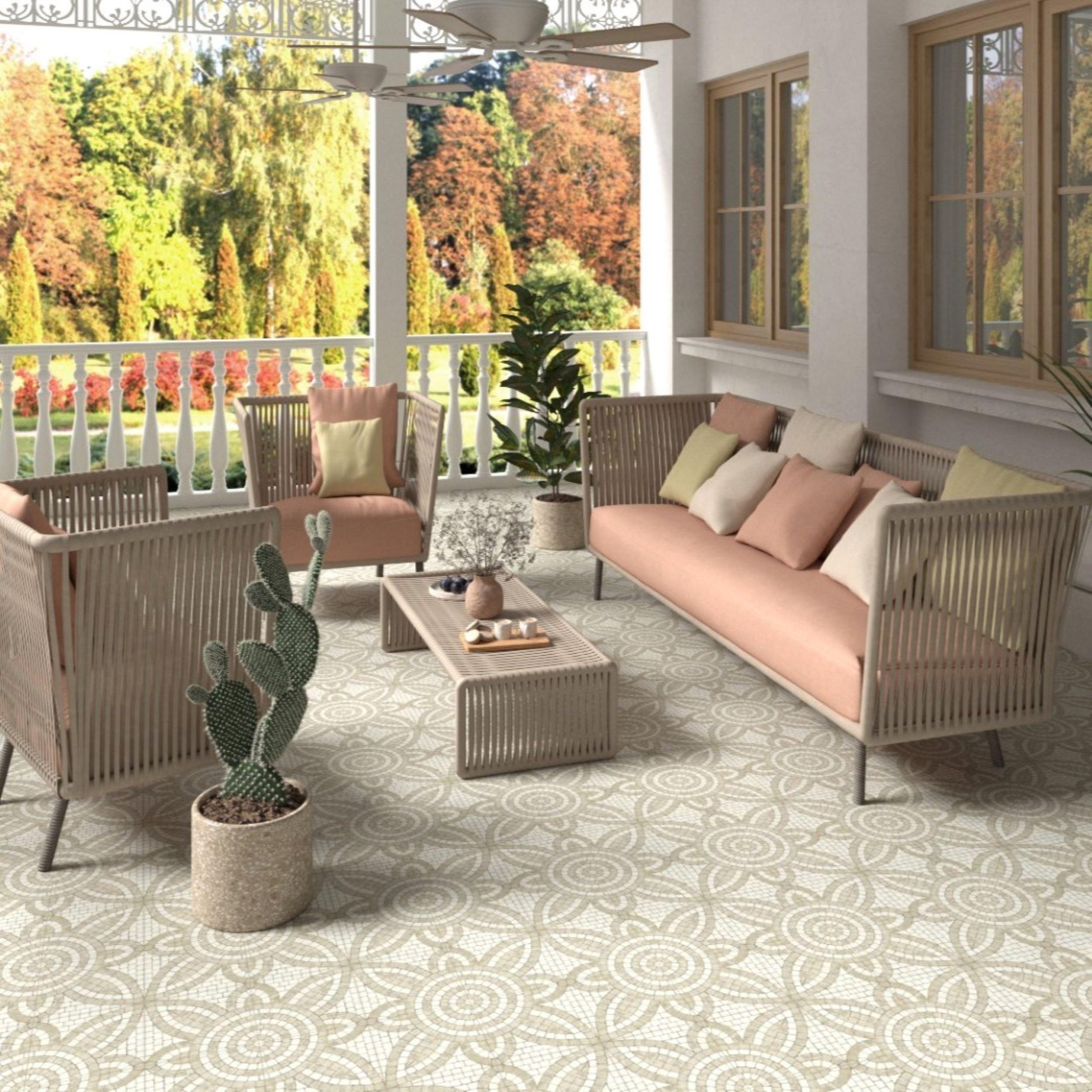 Available in a beautiful beige color, the Mosaico Fiore Matte Porcelain Tile is 8.3mm thick and measures 8 x 8 inches. Perfect for indoor and outdoor use, this tile is also suitable for fireplace surrounds.