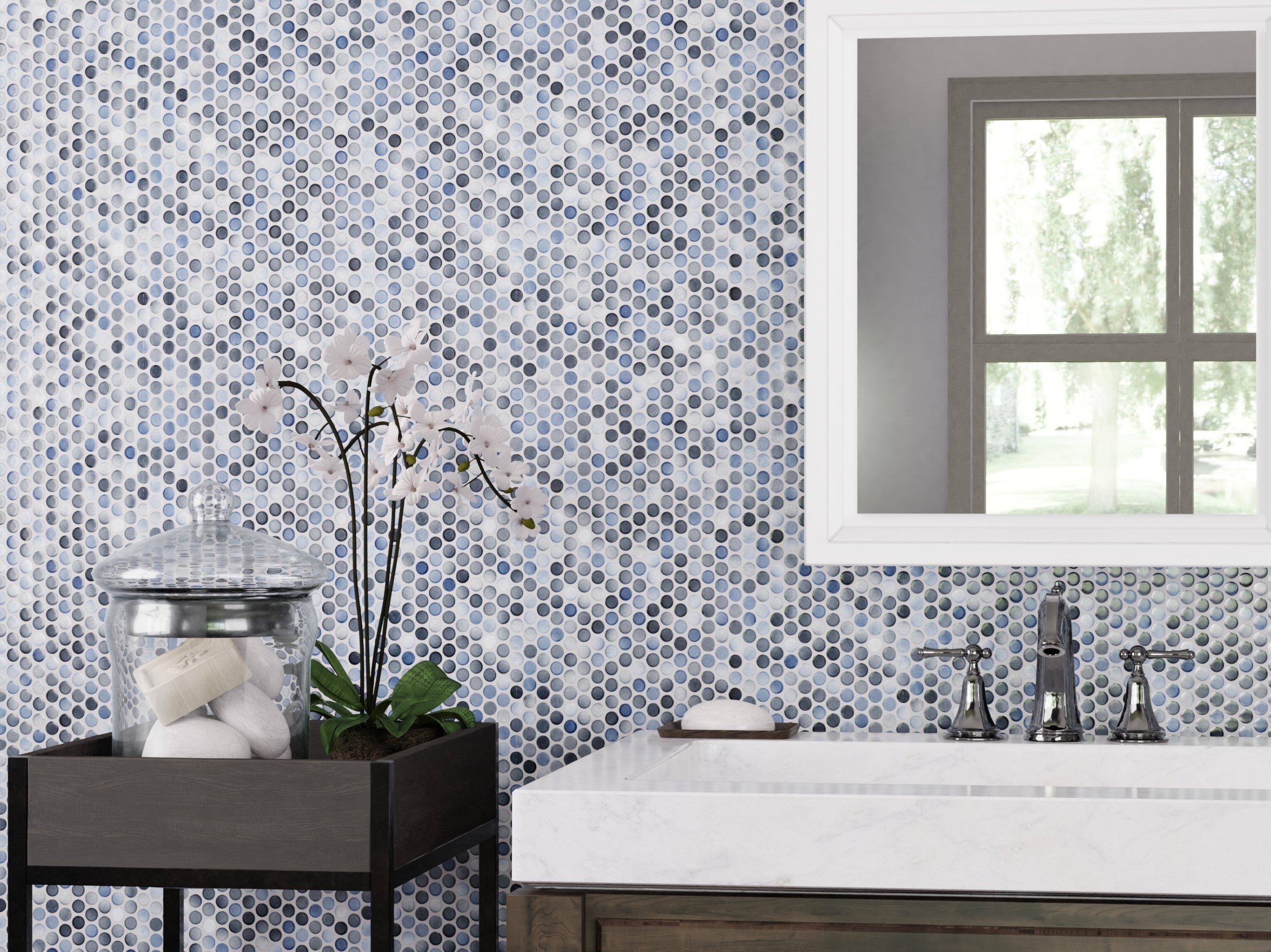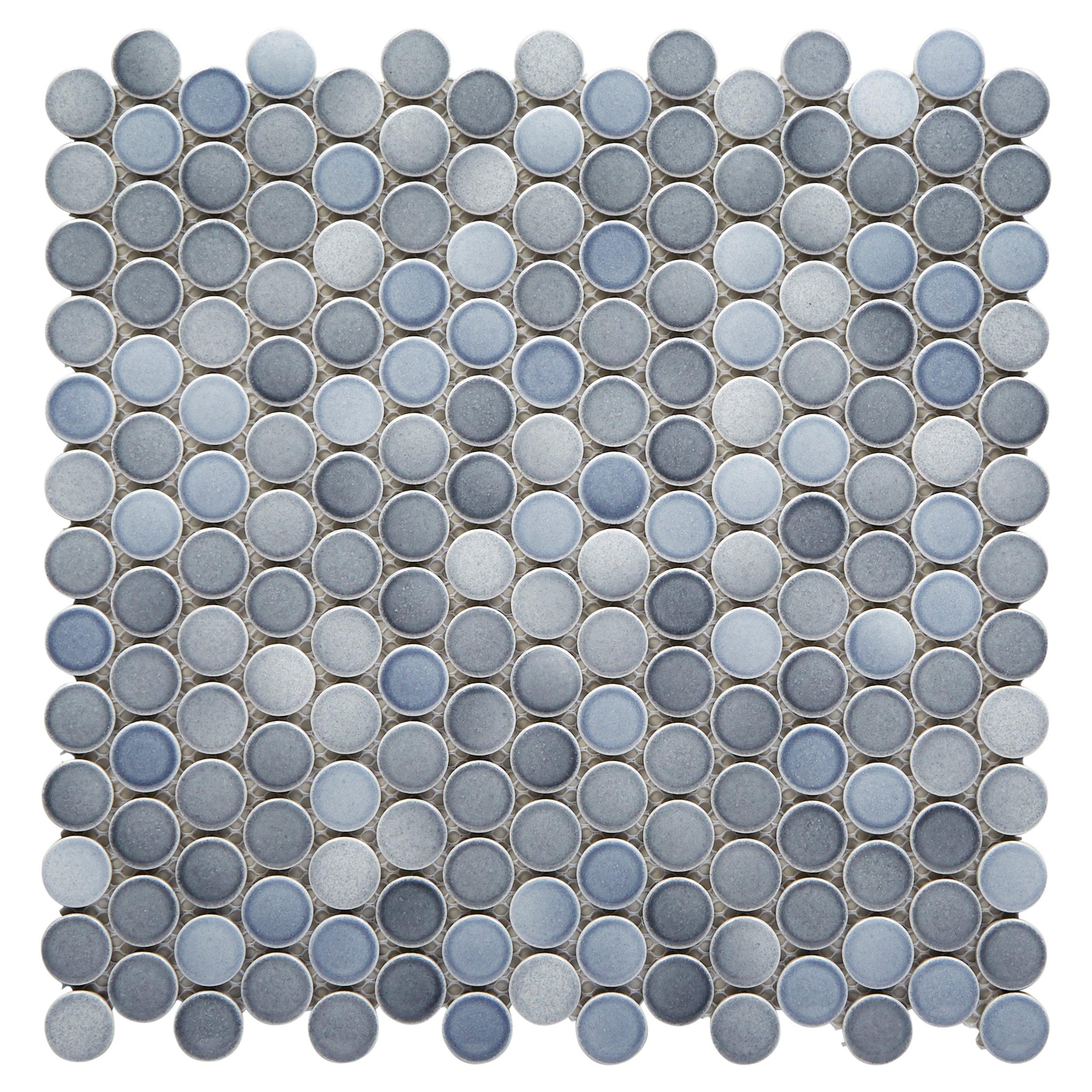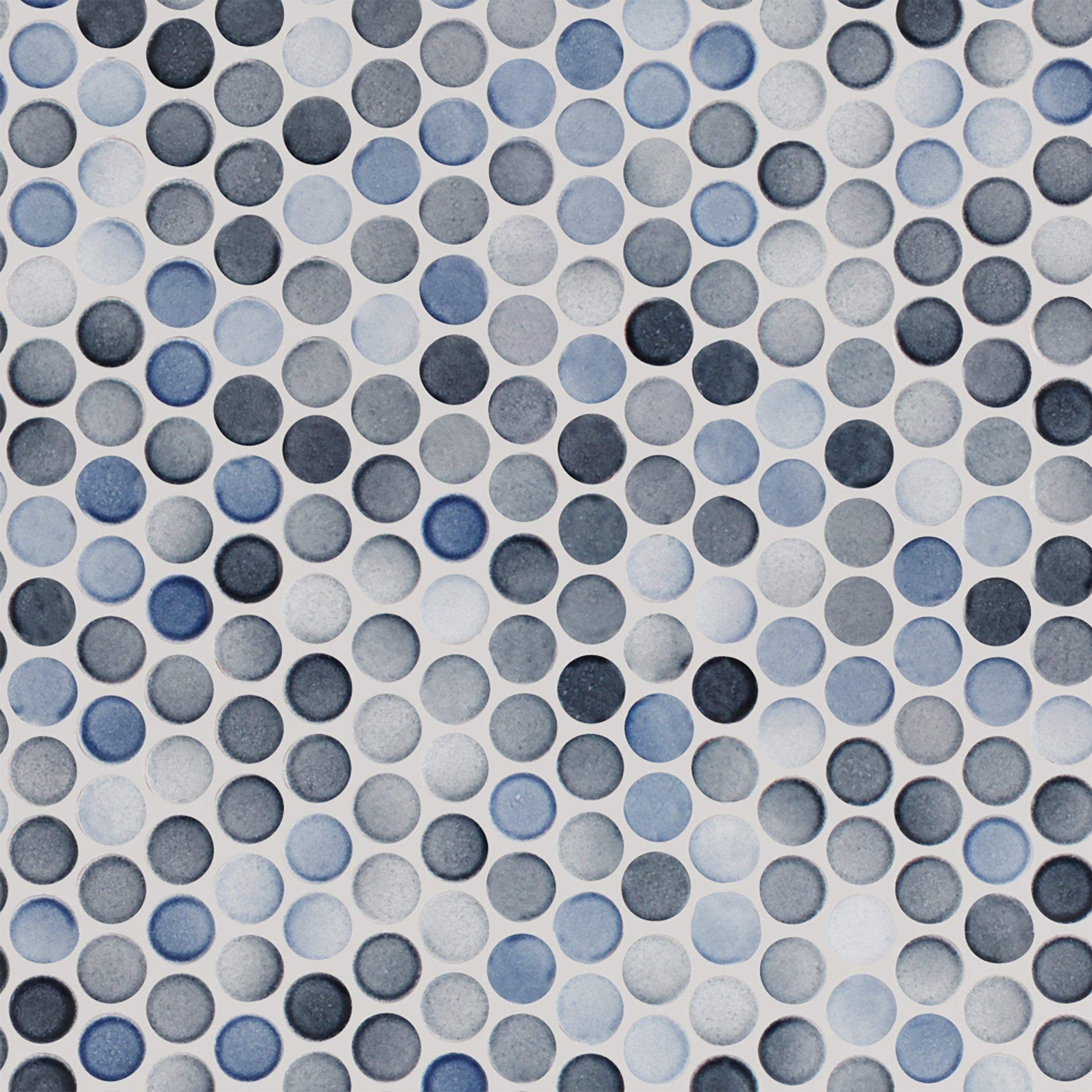Personalize your space with the Multi Gray Polished Porcelain Penny Mosaic. This blue high gloss finish tile will make a great impact in small areas like the bathroom, den, or other overlooked spaces.