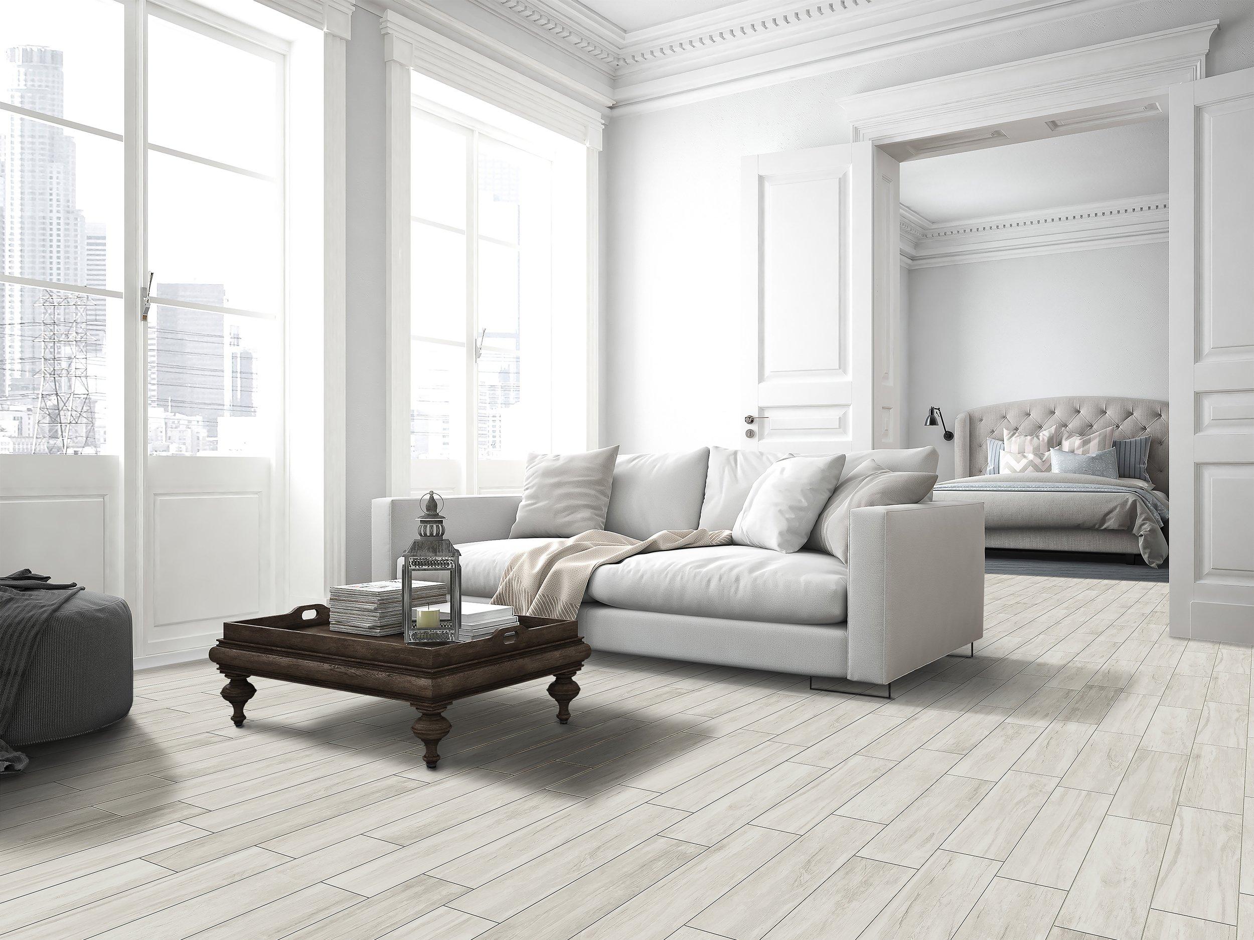 This white Providence Bianco Wood Plank Porcelain Tile is 8 x 32 with a matte finish.