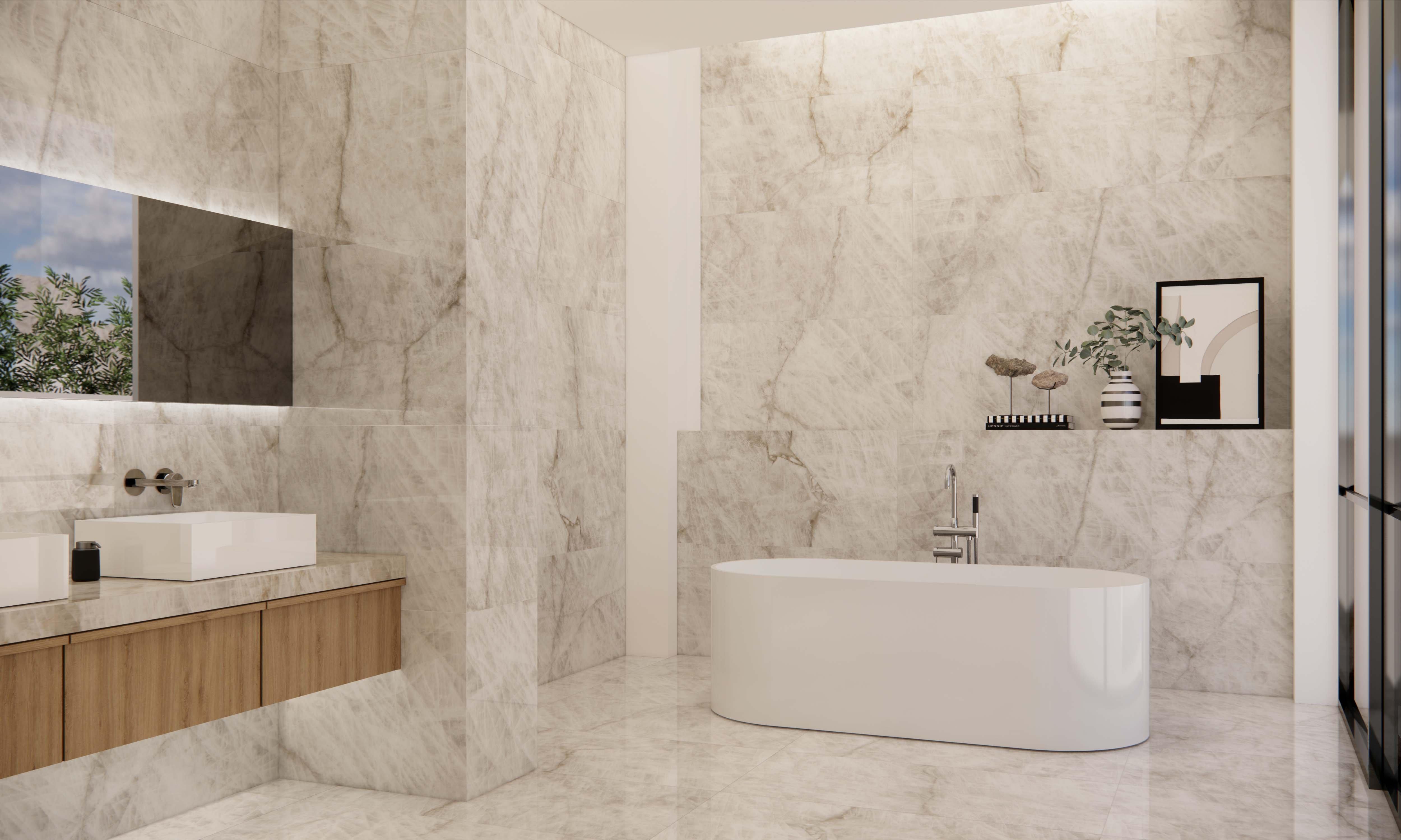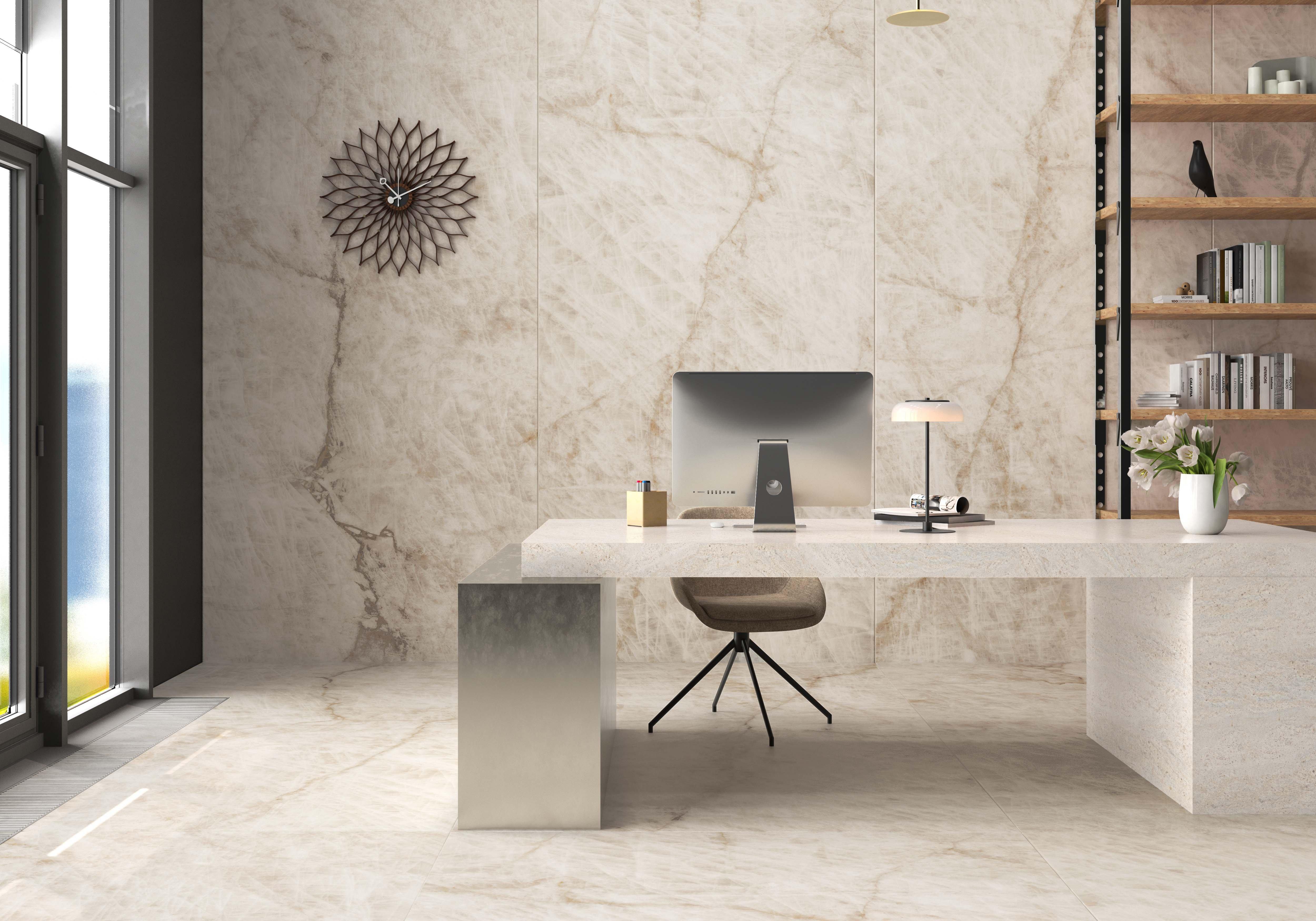 The Desert Jasmine Polished Porcelain Tile provides stunning opulence for any focal point in your next indoor or outdoor project. Minimal grout lines create a luxurious and seamless appearance, and the porcelain material offers optimal durability. Luxury and performance create endless possibilities for an elevated design in a variety of spaces.