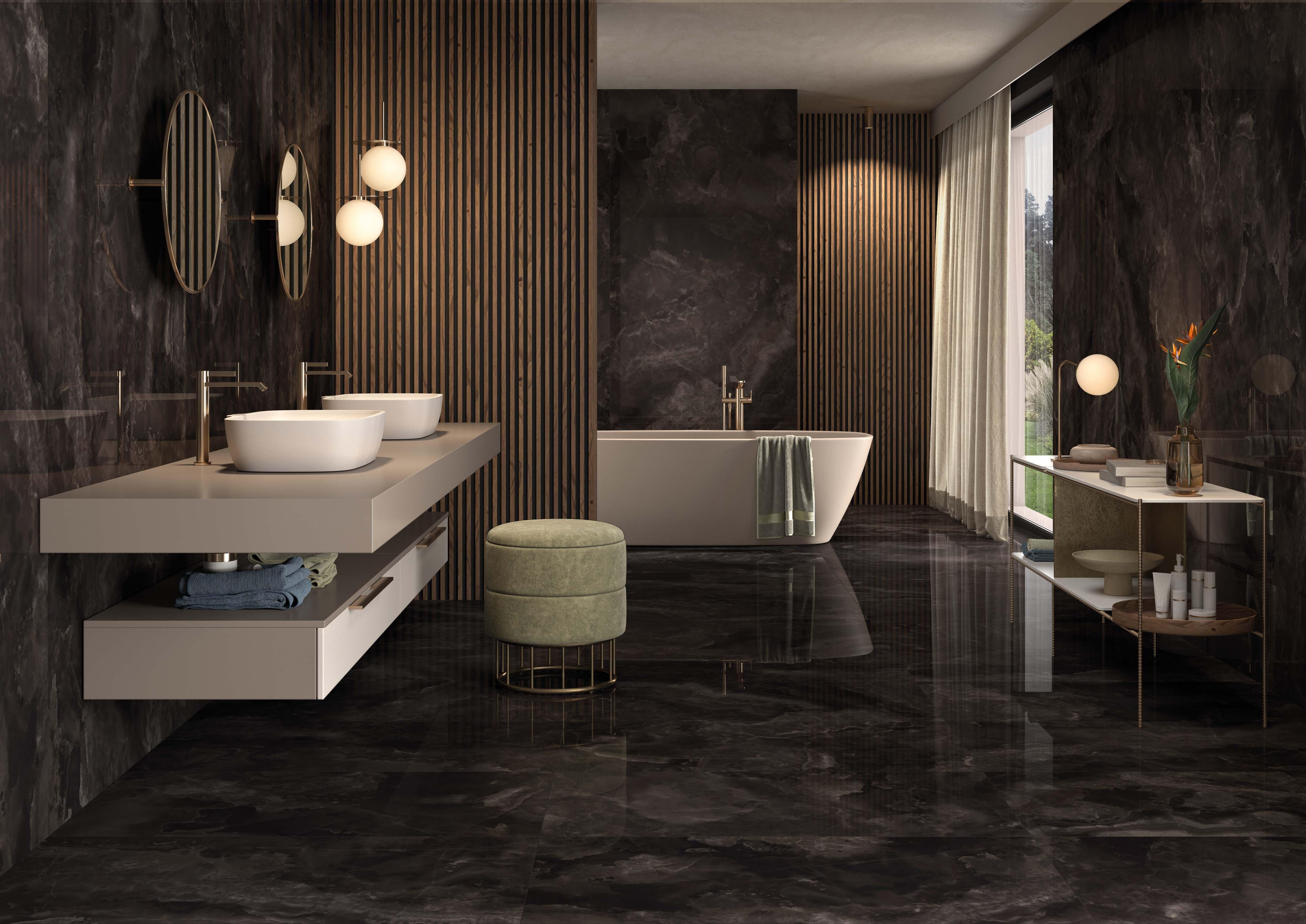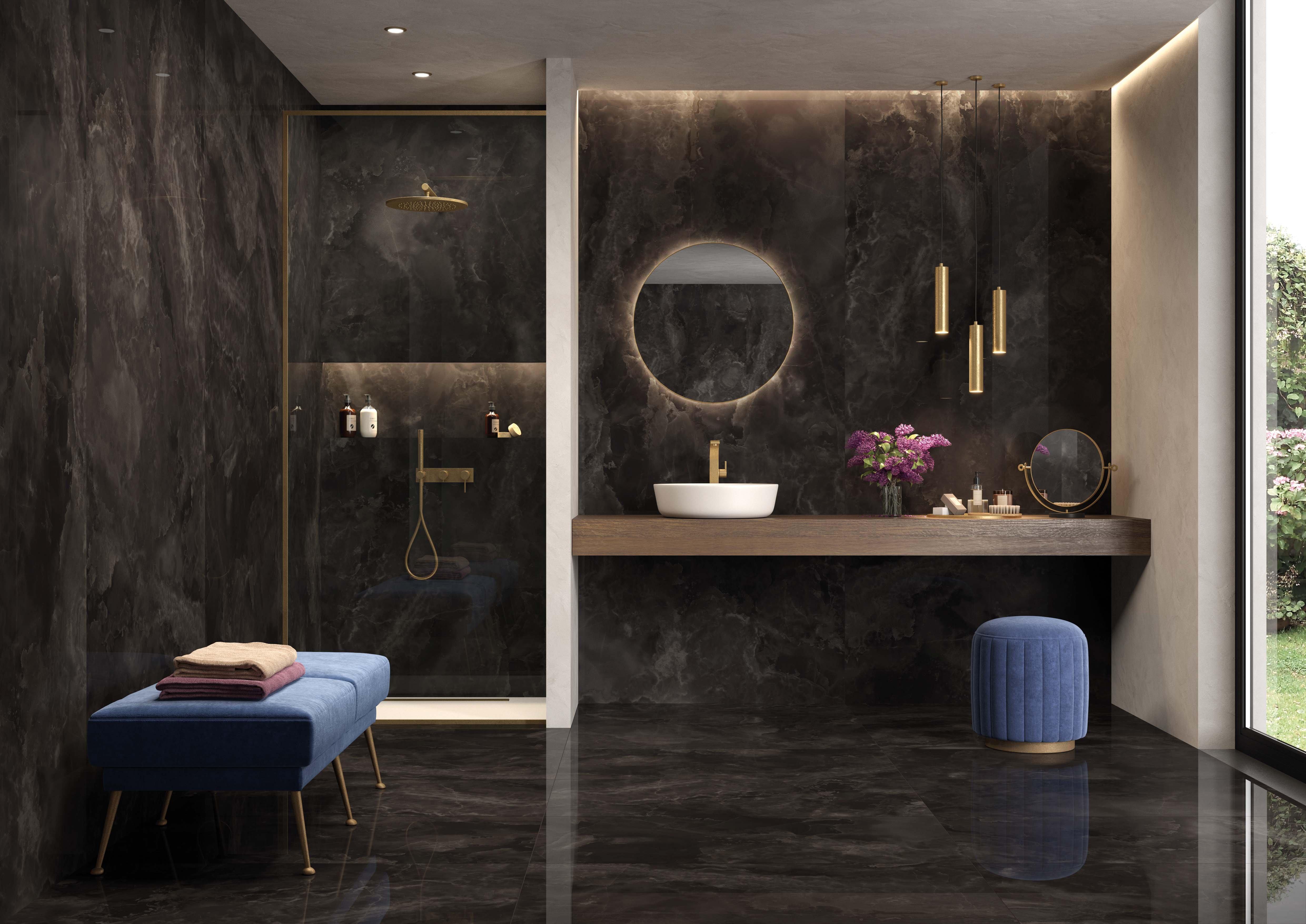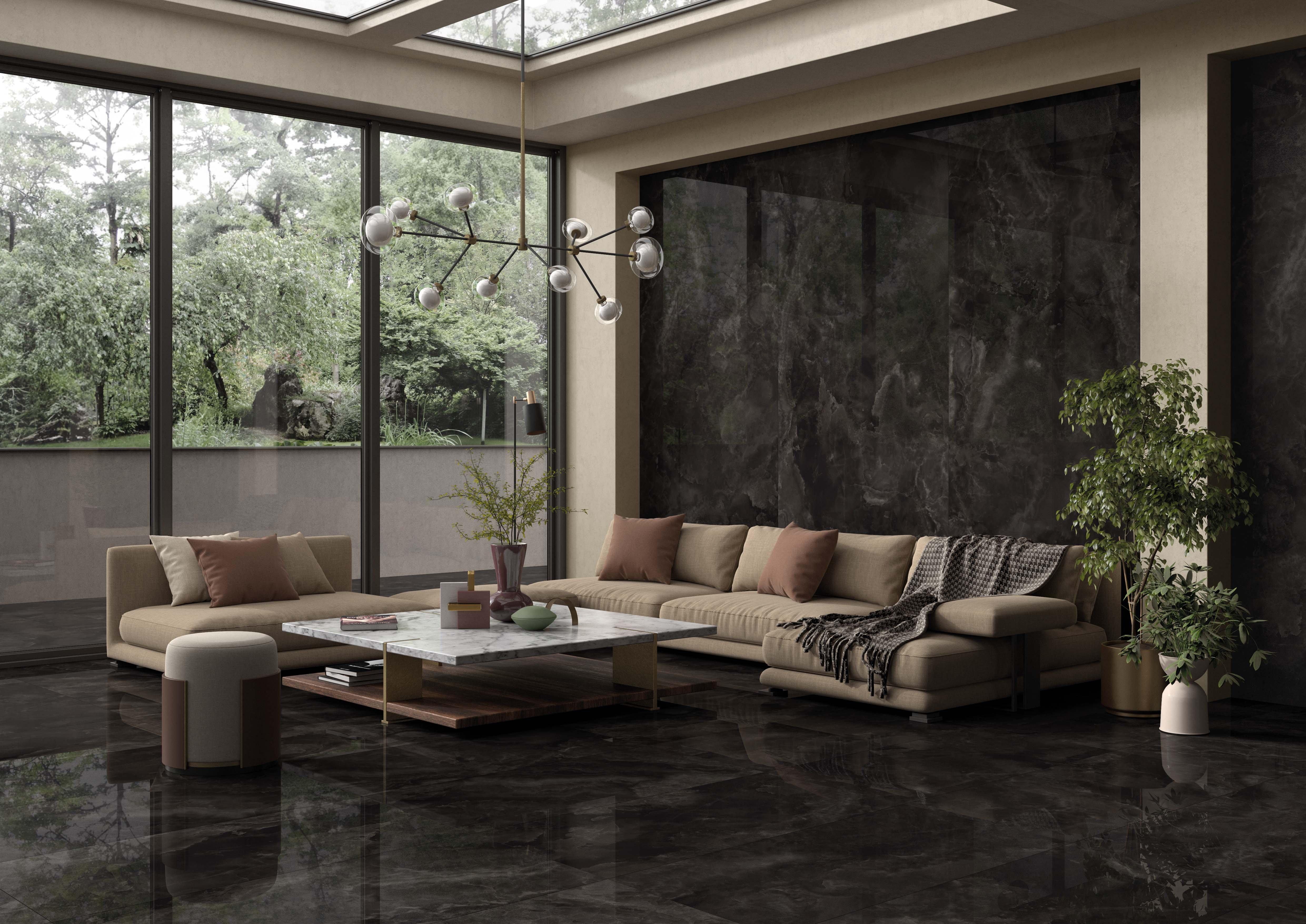 The Sample - Onyx Noir Polished Porcelain Slab provides stunning opulence for any focal point in your next indoor or outdoor project. Minimal grout lines create a luxurious and seamless appearance, and the porcelain material offers optimal durability. Luxury and performance create endless possibilities for an elevated design in a variety of spaces.