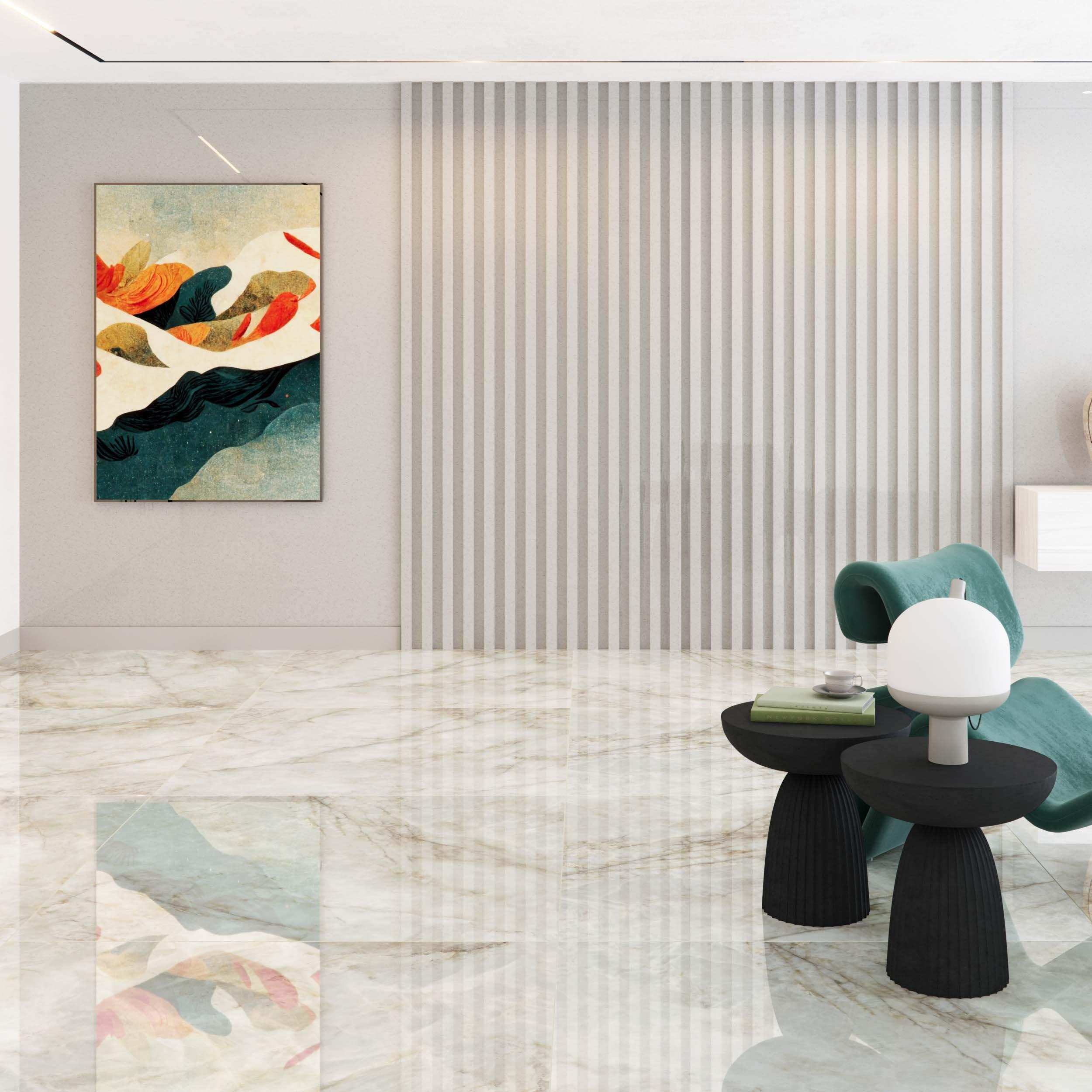 With a polished finish, this white Solara Onyx Polished Porcelain Tile is 48 x 48.