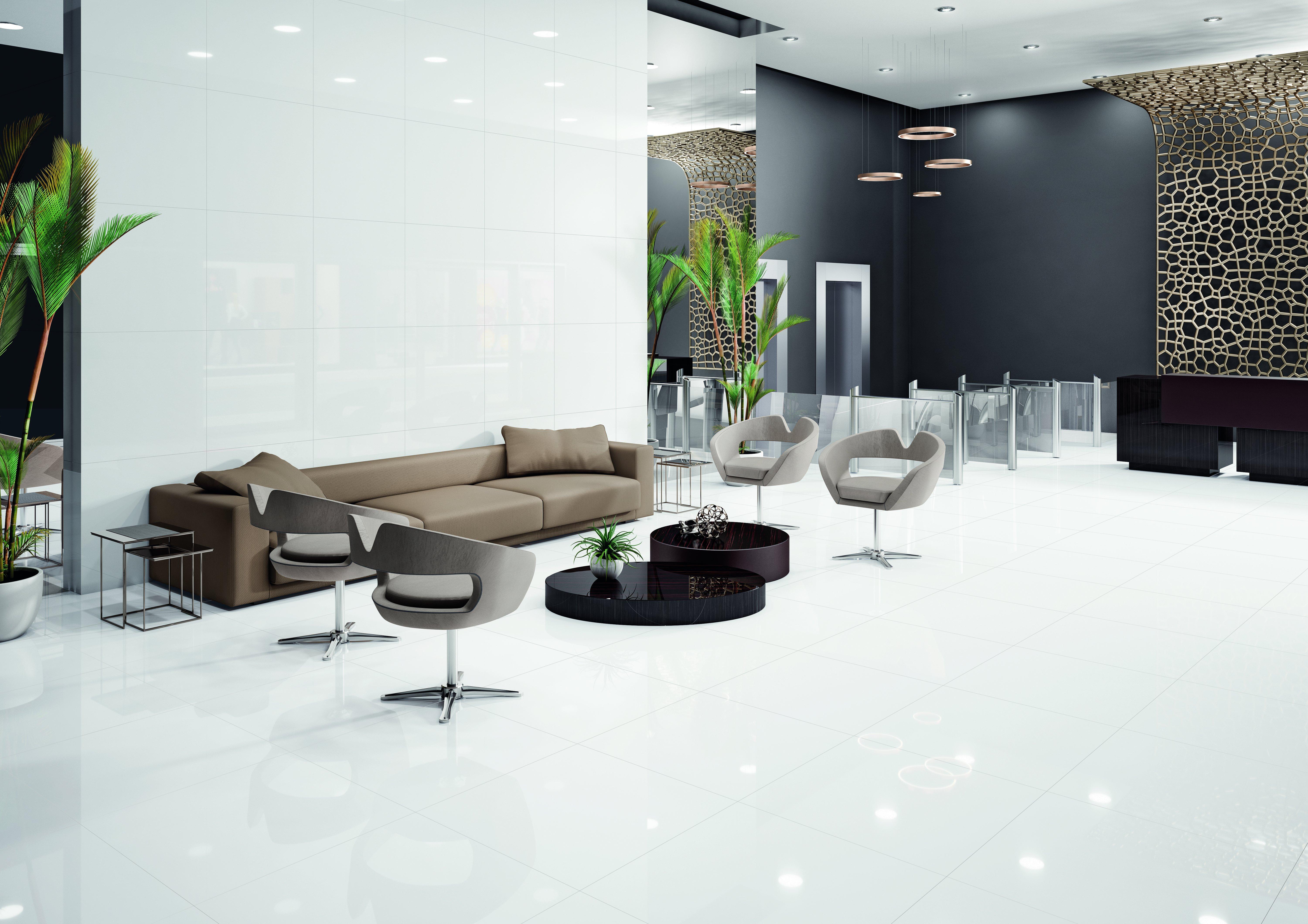 This white polished Yukon White Polished Porcelain Tile is 35 x 35.