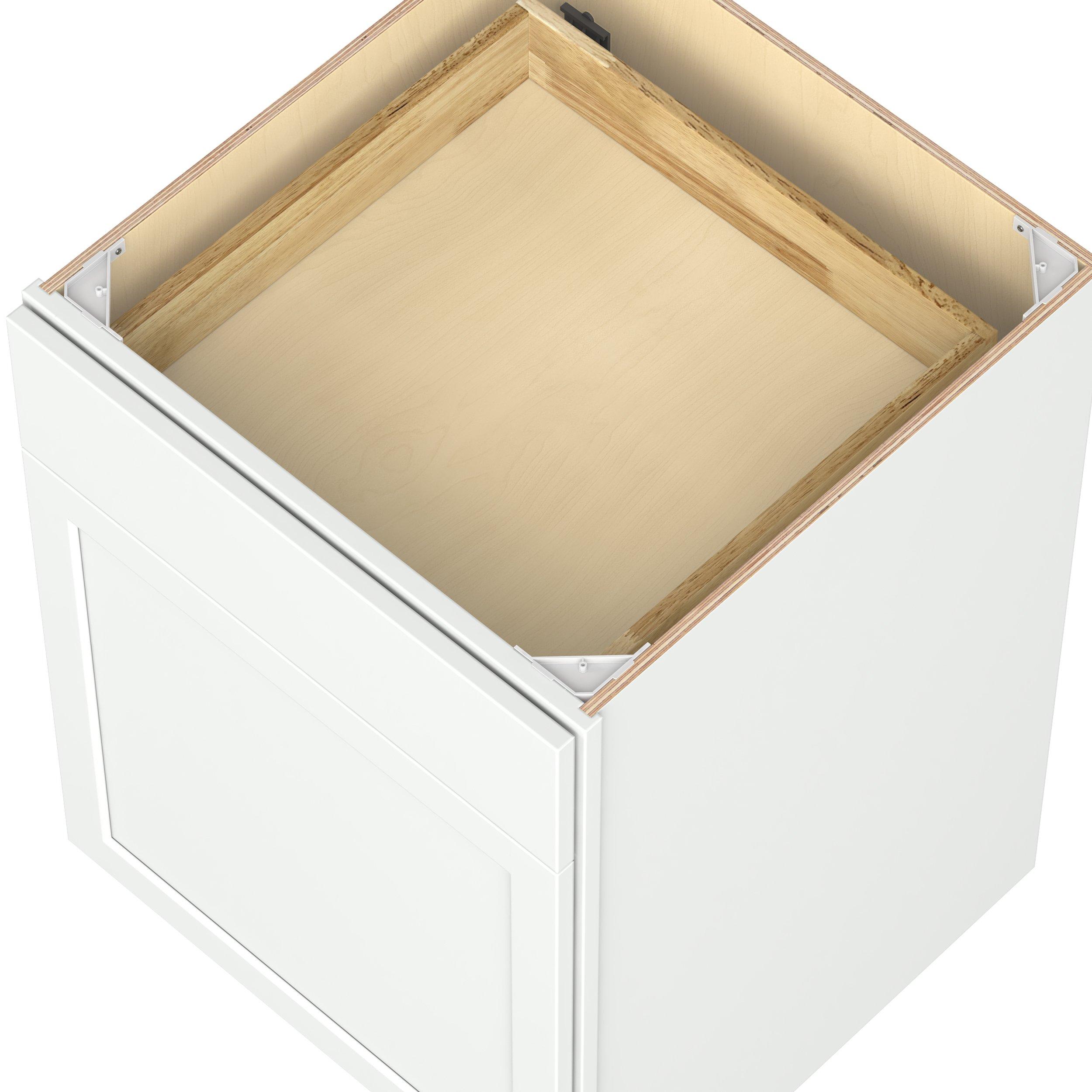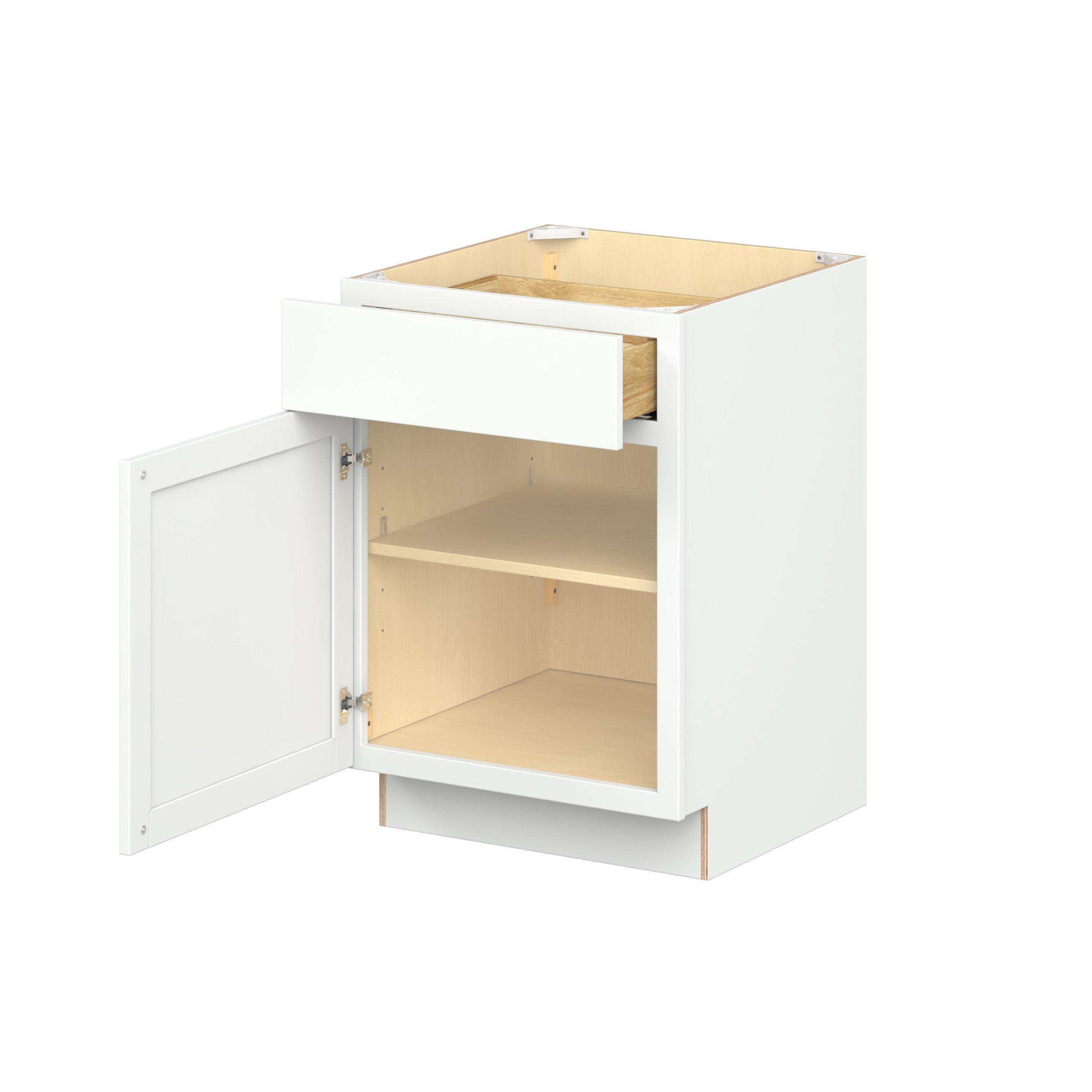 Embrace the timeless charm of the Baxley classic shaker door style. Studio Design Collection Baxley 24 in. Painted Pure White Door and Drawer Base Cabinet - Left Door Hinge features all plywood construction, offering both superior strength and sophistication to your space. Featuring 5-piece MDF doors and dovetail drawer joints, these cabinets offer durability and elegance. Baxley classic shaker door style is designed to retain its stunning appearance and withstand the test of time.