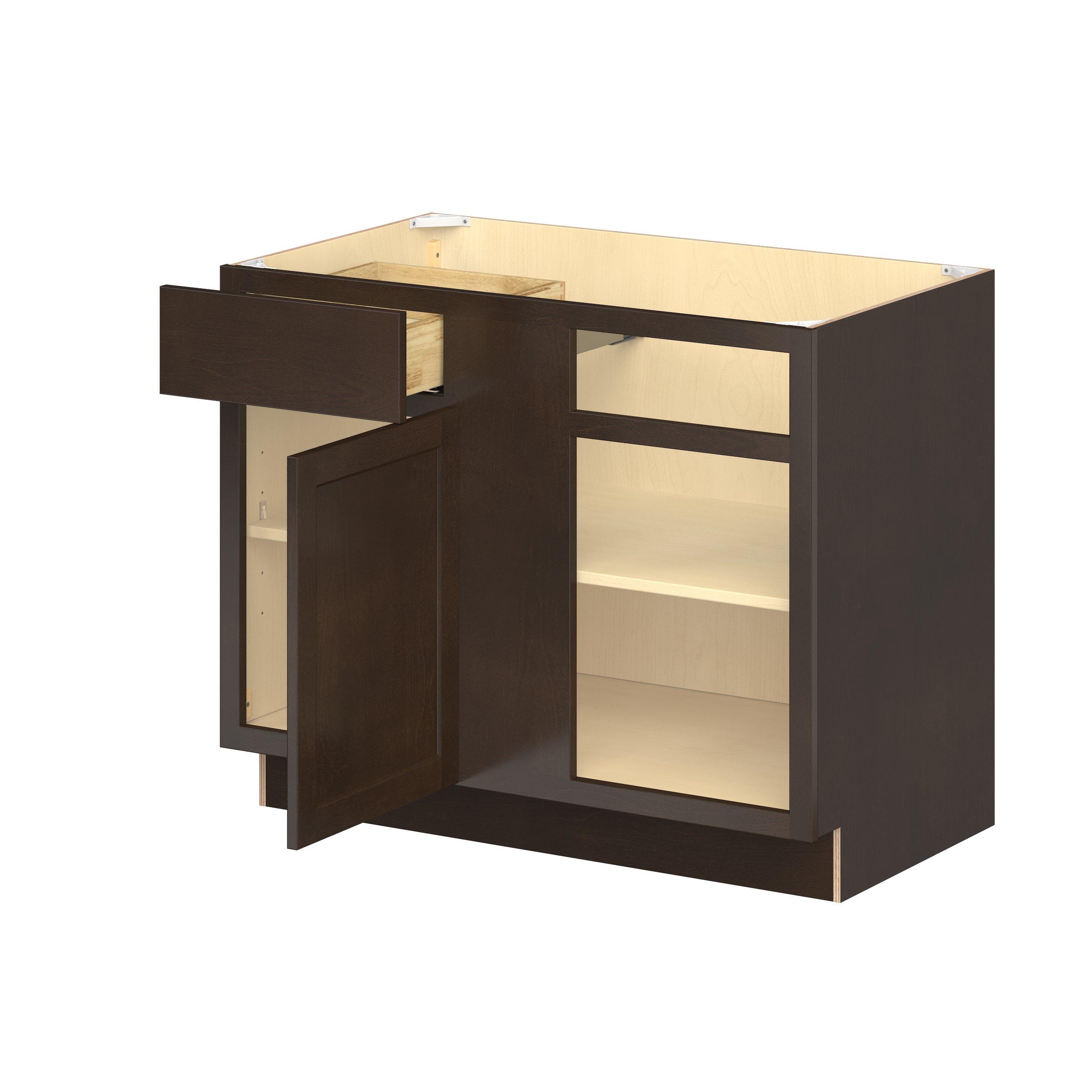 Embrace the timeless charm of the Baxley classic shaker door style. Studio Design Collection Baxley 42 in. Stained Cocoa Blind Corner Base Cabinet features all plywood construction, offering both superior strength and sophistication to your space. Featuring 5-piece solid wood doors and dovetail drawer joints, these cabinets offer durability and elegance. Baxley classic shaker door style is designed to retain its stunning appearance and withstand the test of time.