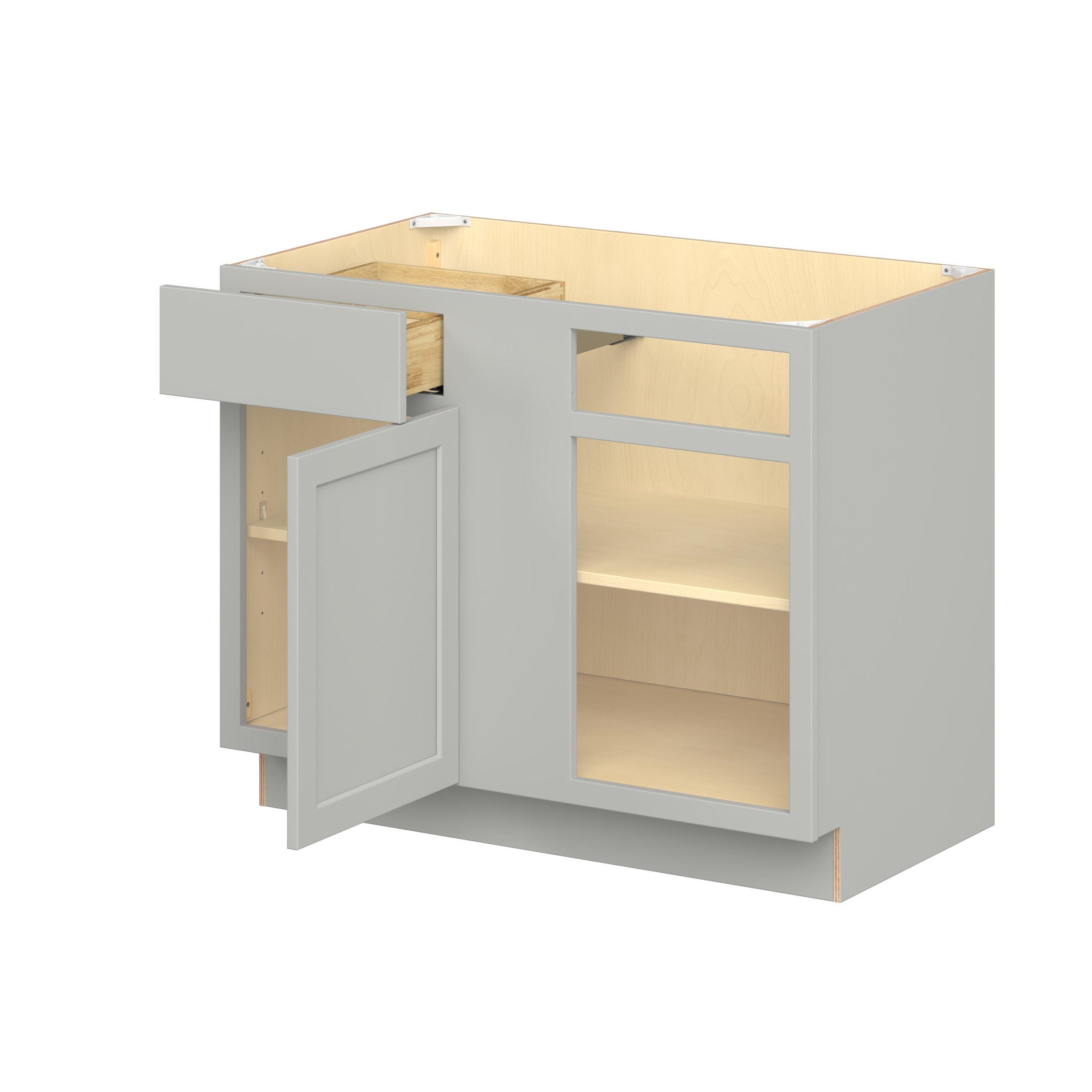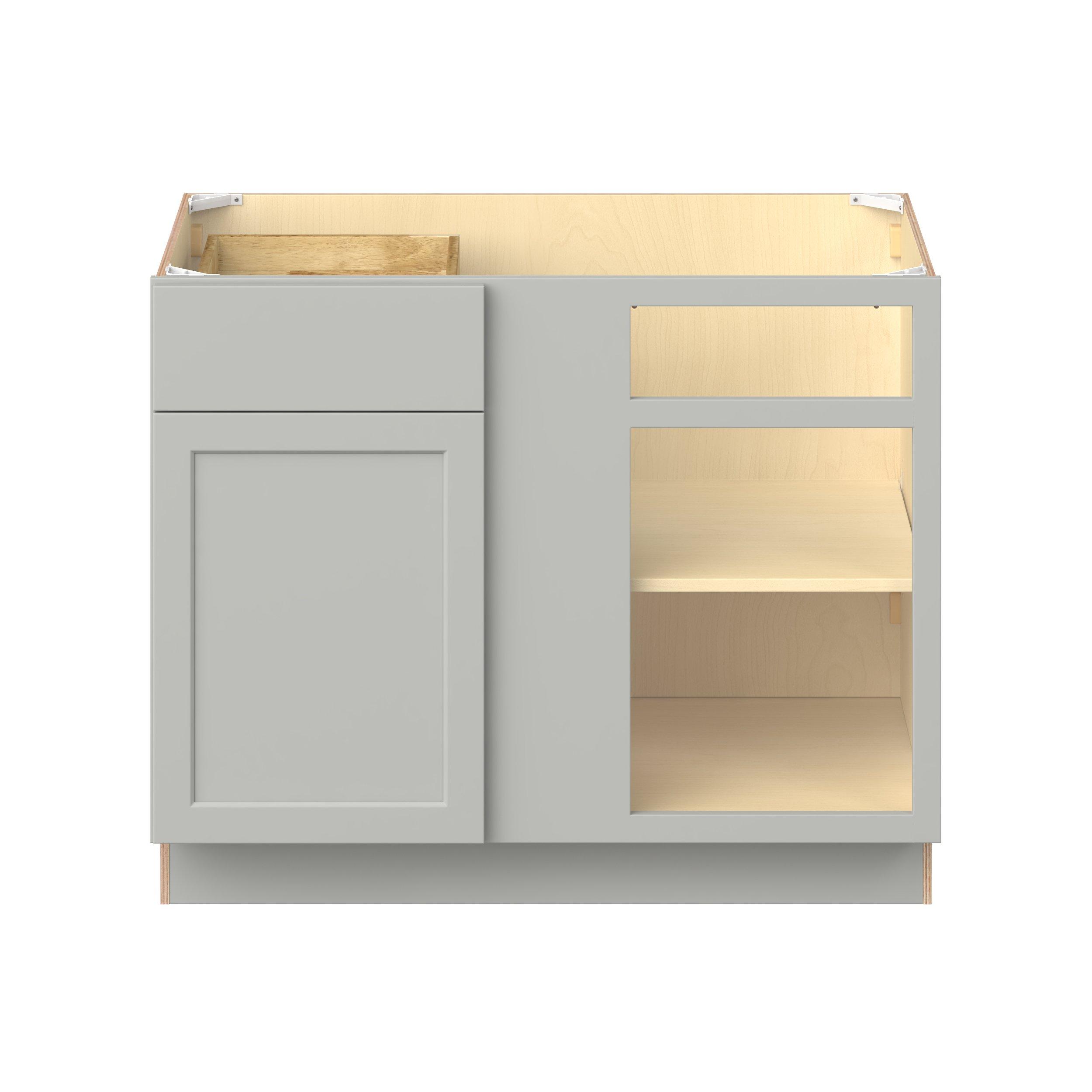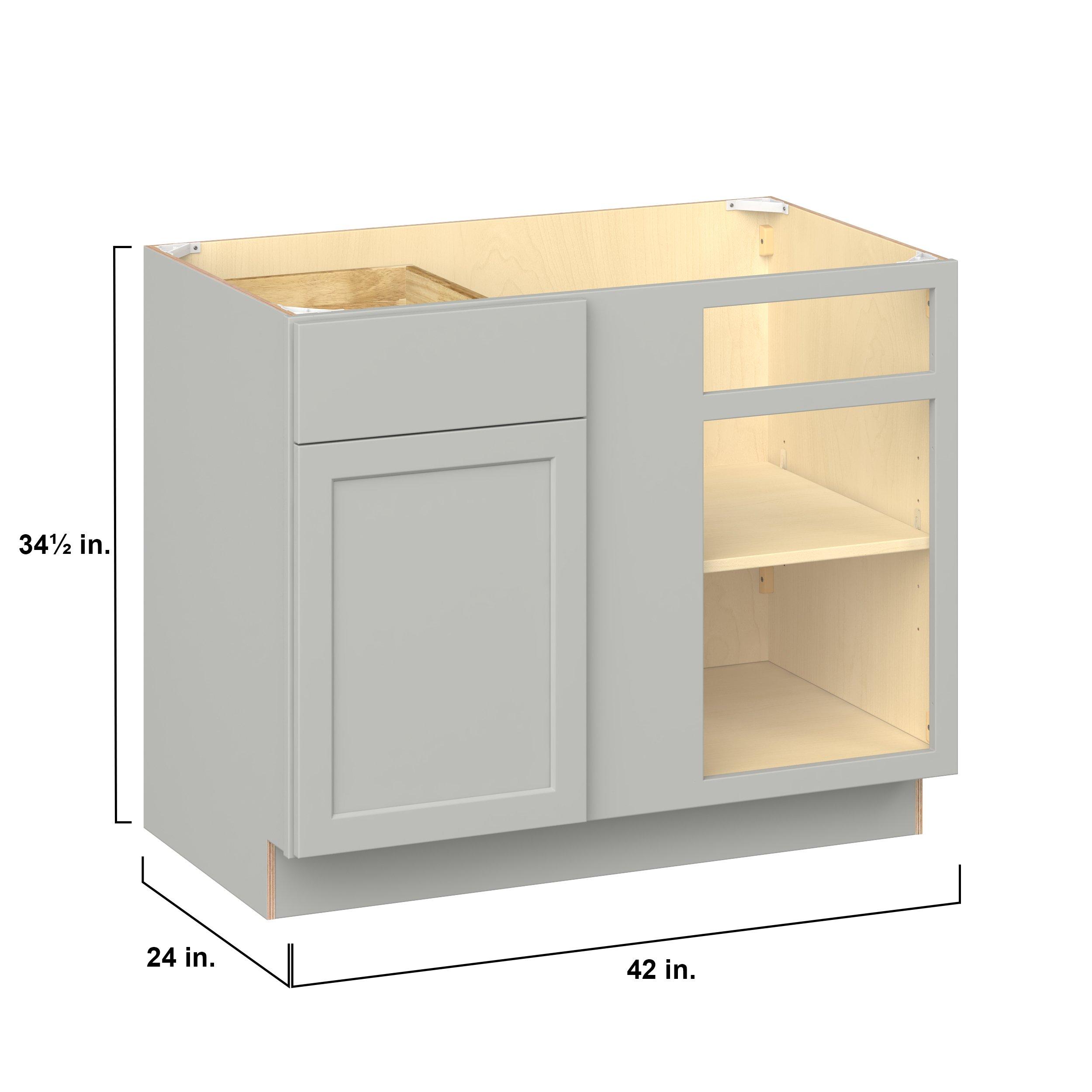 Embrace the timeless charm of the Baxley classic shaker door style. Studio Design Collection Baxley 42 in. Painted Whisper Gray Blind Corner Base Cabinet features all plywood construction, offering both superior strength and sophistication to your space. Featuring 5-piece MDF doors and dovetail drawer joints, these cabinets offer durability and elegance. Baxley classic shaker door style is designed to retain its stunning appearance and withstand the test of time.