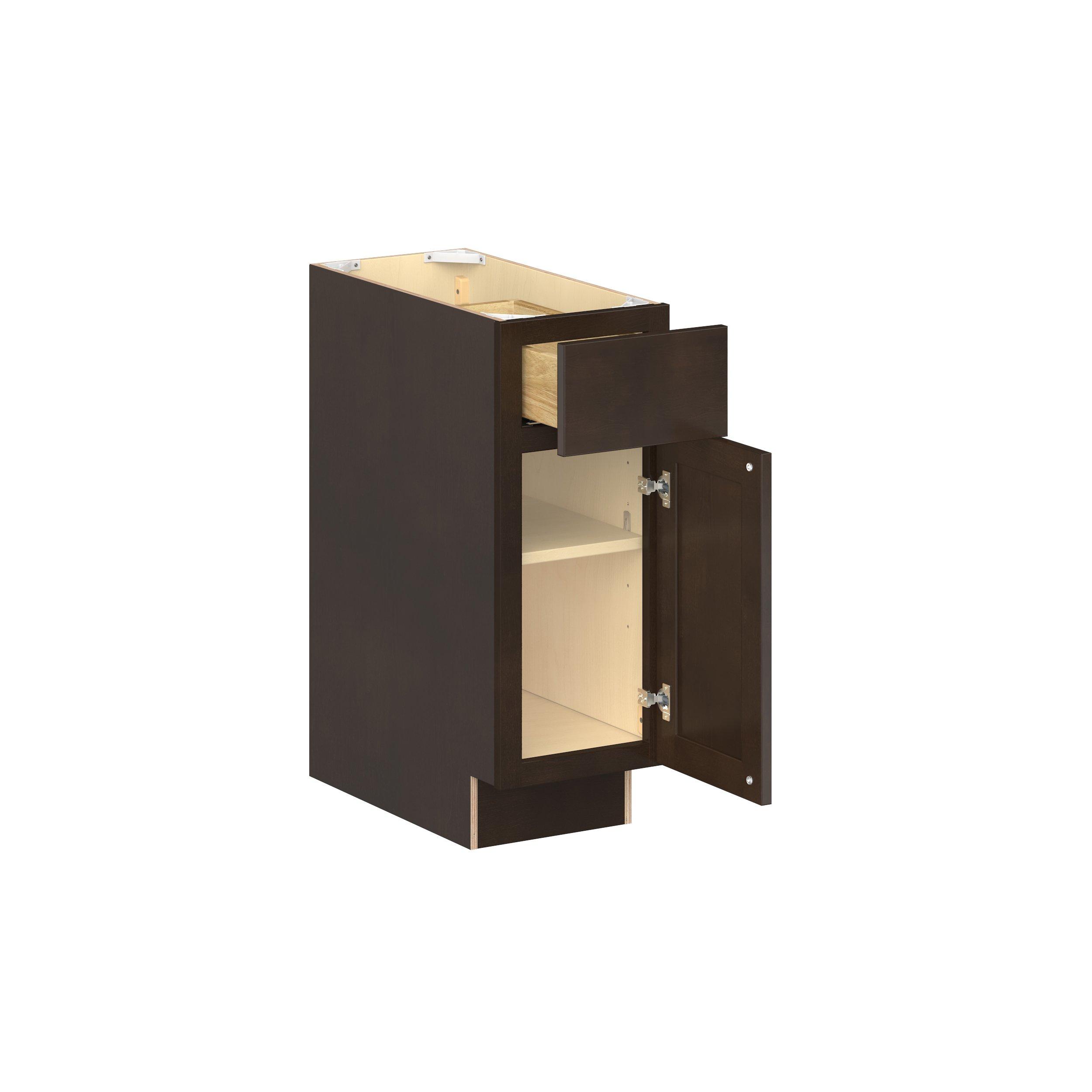 Embrace the timeless charm of the Baxley classic shaker door style. Studio Design Collection Baxley 12 in. Stained Cocoa Door and Drawer Base Cabinet - ADA - Right Door Hinge features all plywood construction, offering both superior strength and sophistication to your space. Featuring 5-piece solid wood doors and dovetail drawer joints, these cabinets offer durability and elegance. Baxley classic shaker door style is designed to retain its stunning appearance and withstand the test of time.