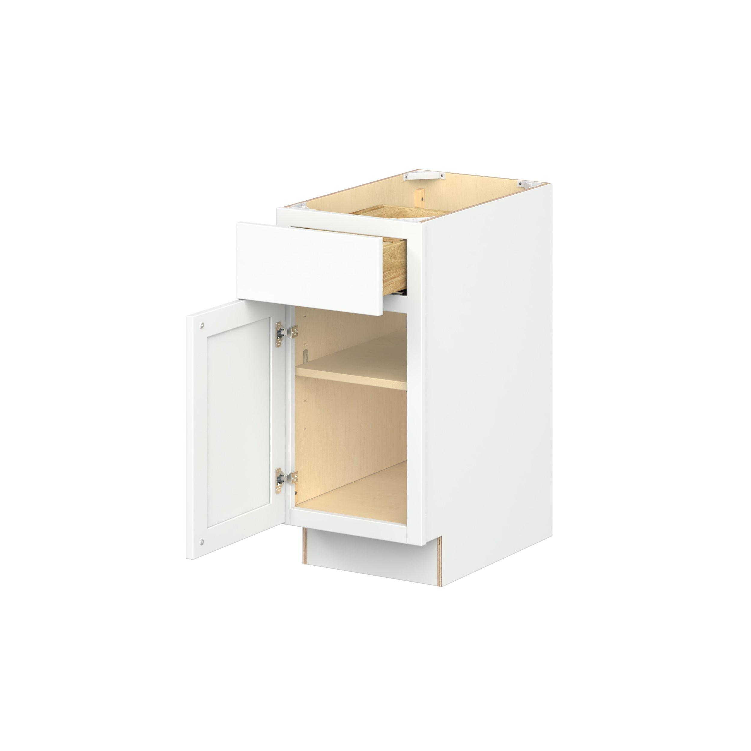 Embrace the timeless charm of the Baxley classic shaker door style. Studio Design Collection Baxley 15 in. Painted Pure White Door and Drawer Base Cabinet - ADA - Left Door Hinge features all plywood construction, offering both superior strength and sophistication to your space. Featuring 5-piece MDF doors and dovetail drawer joints, these cabinets offer durability and elegance. Baxley classic shaker door style is designed to retain its stunning appearance and withstand the test of time.