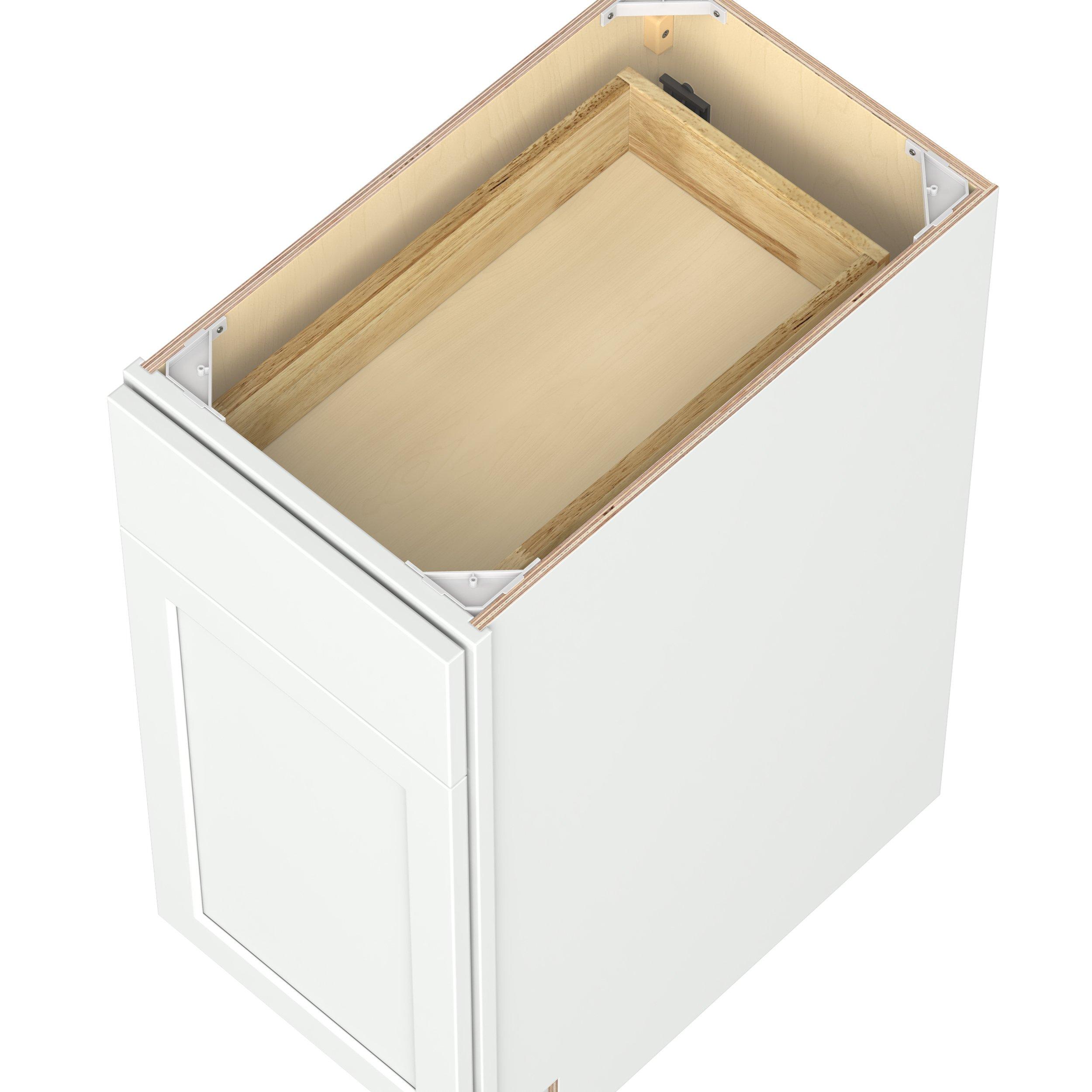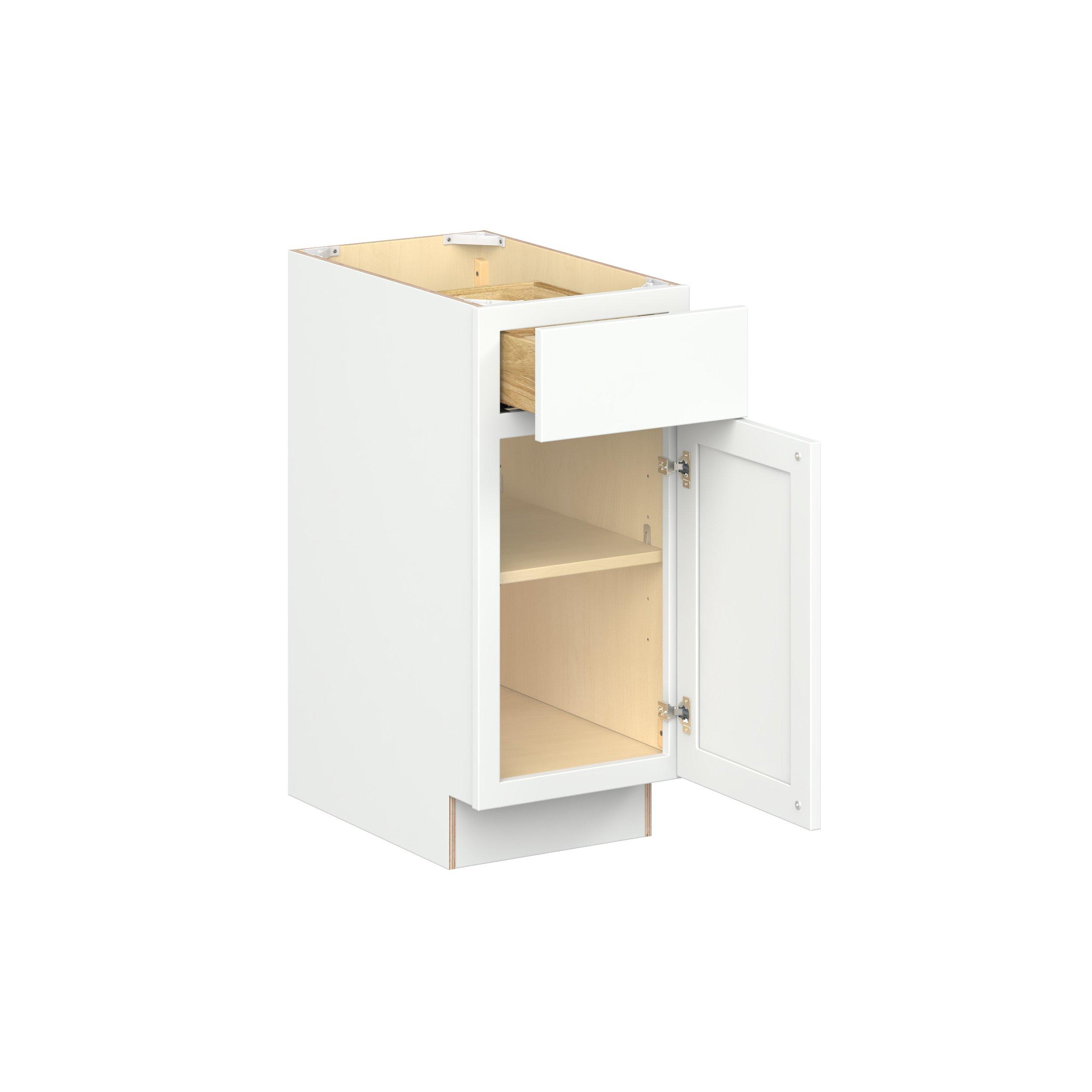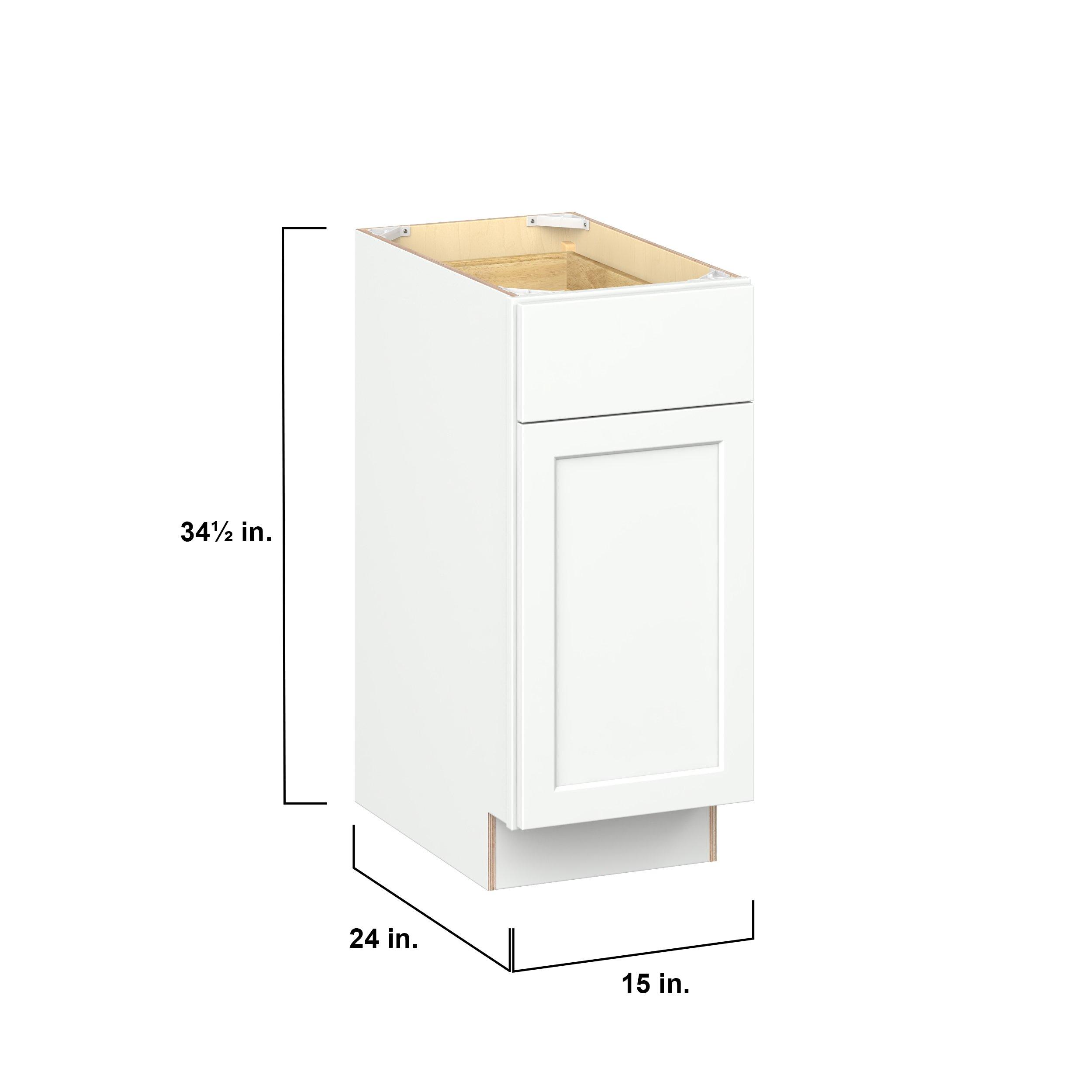 Embrace the timeless charm of the Baxley classic shaker door style. Studio Design Collection Baxley 15 in. Painted Pure White Door and Drawer Base Cabinet - Right Door Hinge features all plywood construction, offering both superior strength and sophistication to your space. Featuring 5-piece MDF doors and dovetail drawer joints, these cabinets offer durability and elegance. Baxley classic shaker door style is designed to retain its stunning appearance and withstand the test of time.