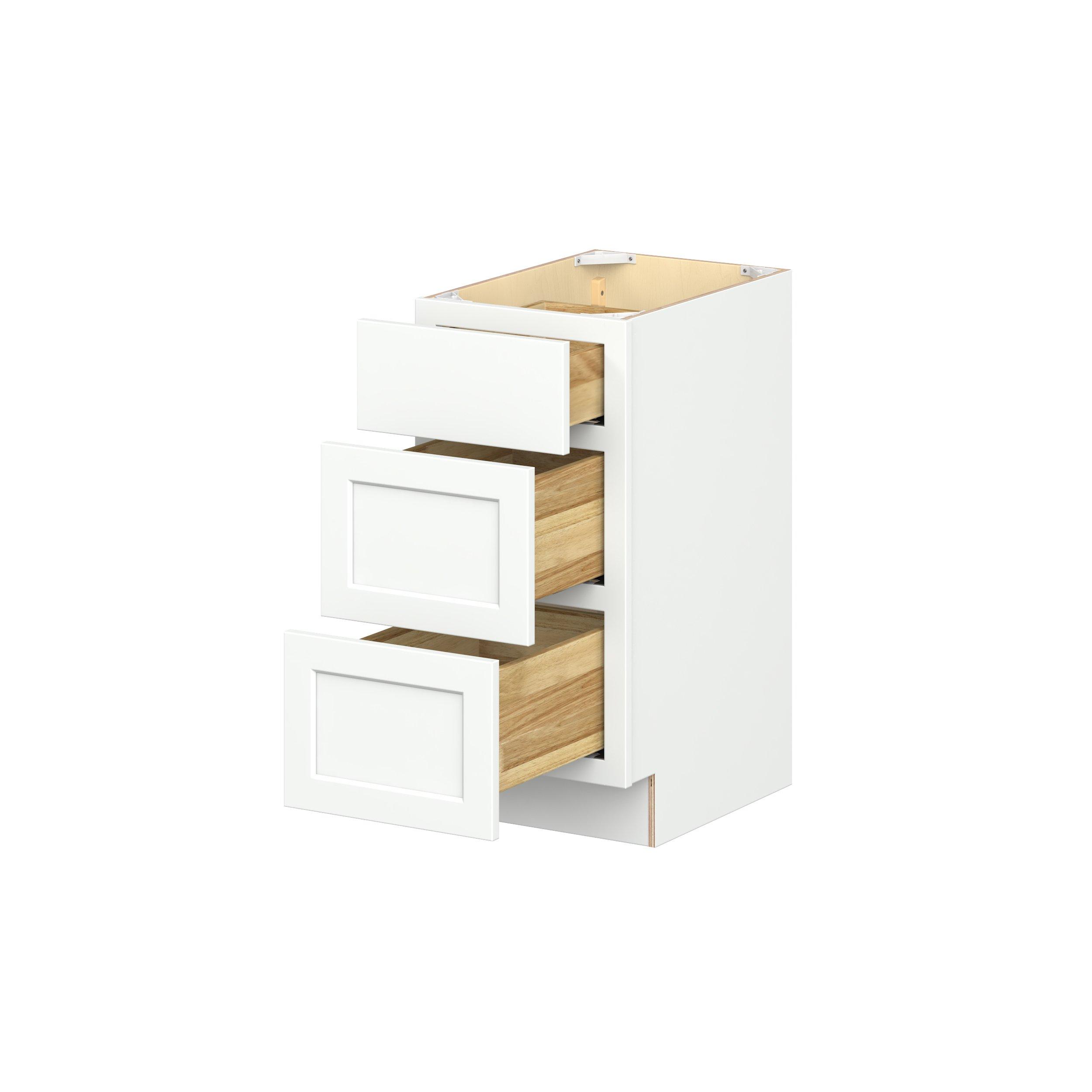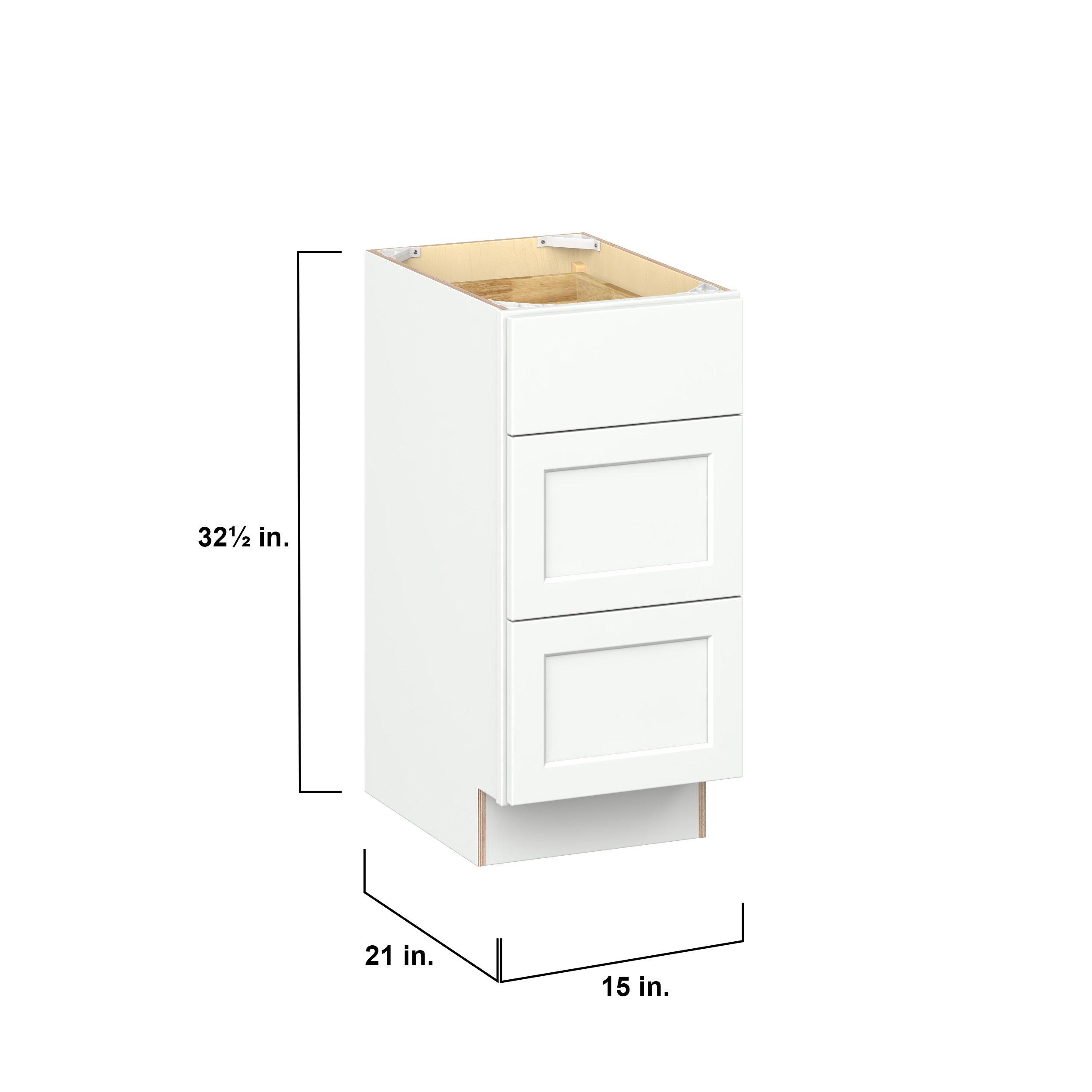 Embrace the timeless charm of the Baxley classic shaker door style. Studio Design Collection Baxley 15 in. Painted Pure White Vanity Drawer Base Cabinet - ADA features all plywood construction, offering both superior strength and sophistication to your space. Featuring 5-piece MDF doors and dovetail drawer joints, these cabinets offer durability and elegance. Baxley classic shaker door style is designed to retain its stunning appearance and withstand the test of time.