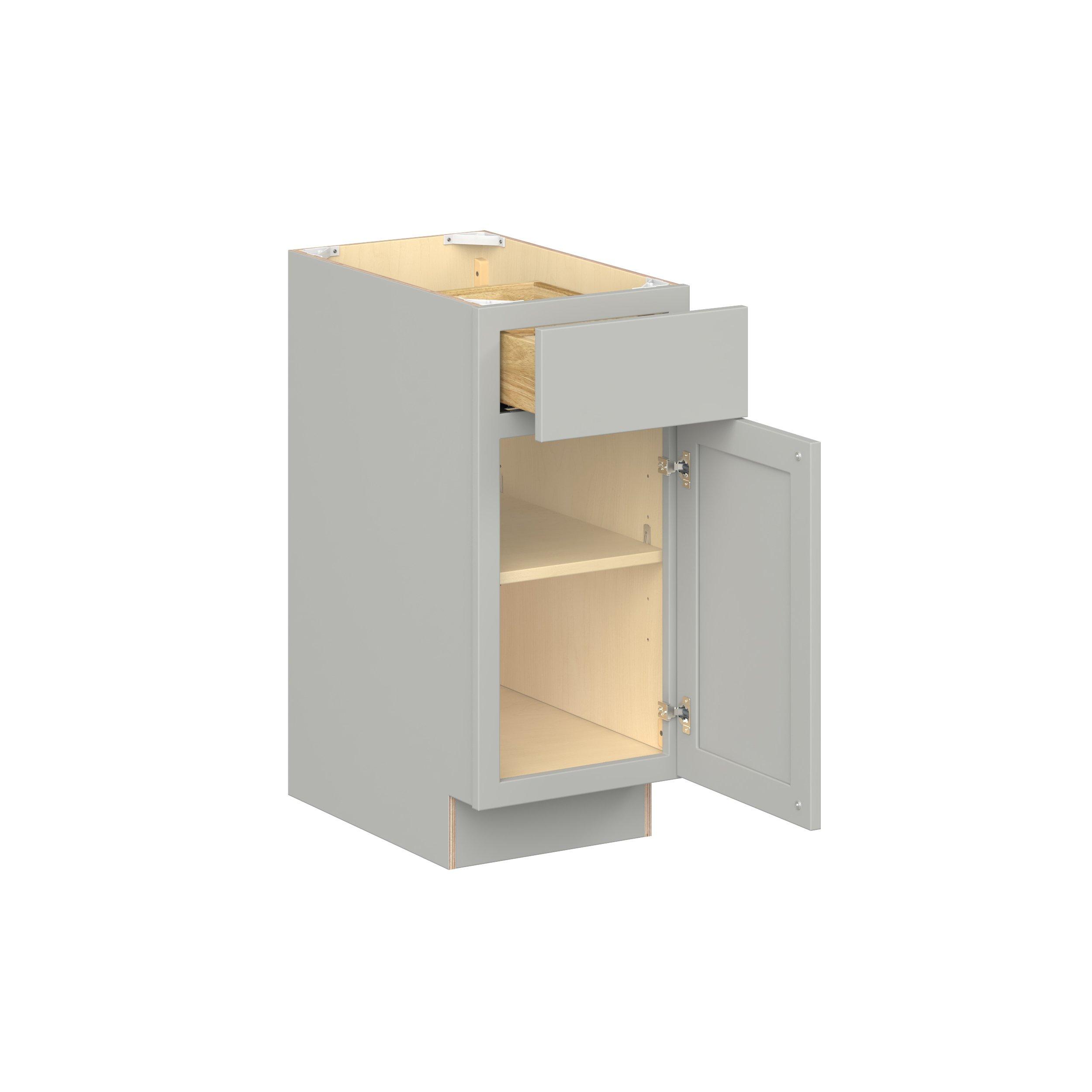Embrace the timeless charm of the Baxley classic shaker door style. Studio Design Collection Baxley 15 in. Painted Whisper Gray Door and Drawer Base Cabinet - Right Door Hinge features all plywood construction, offering both superior strength and sophistication to your space. Featuring 5-piece MDF doors and dovetail drawer joints, these cabinets offer durability and elegance. Baxley classic shaker door style is designed to retain its stunning appearance and withstand the test of time.
