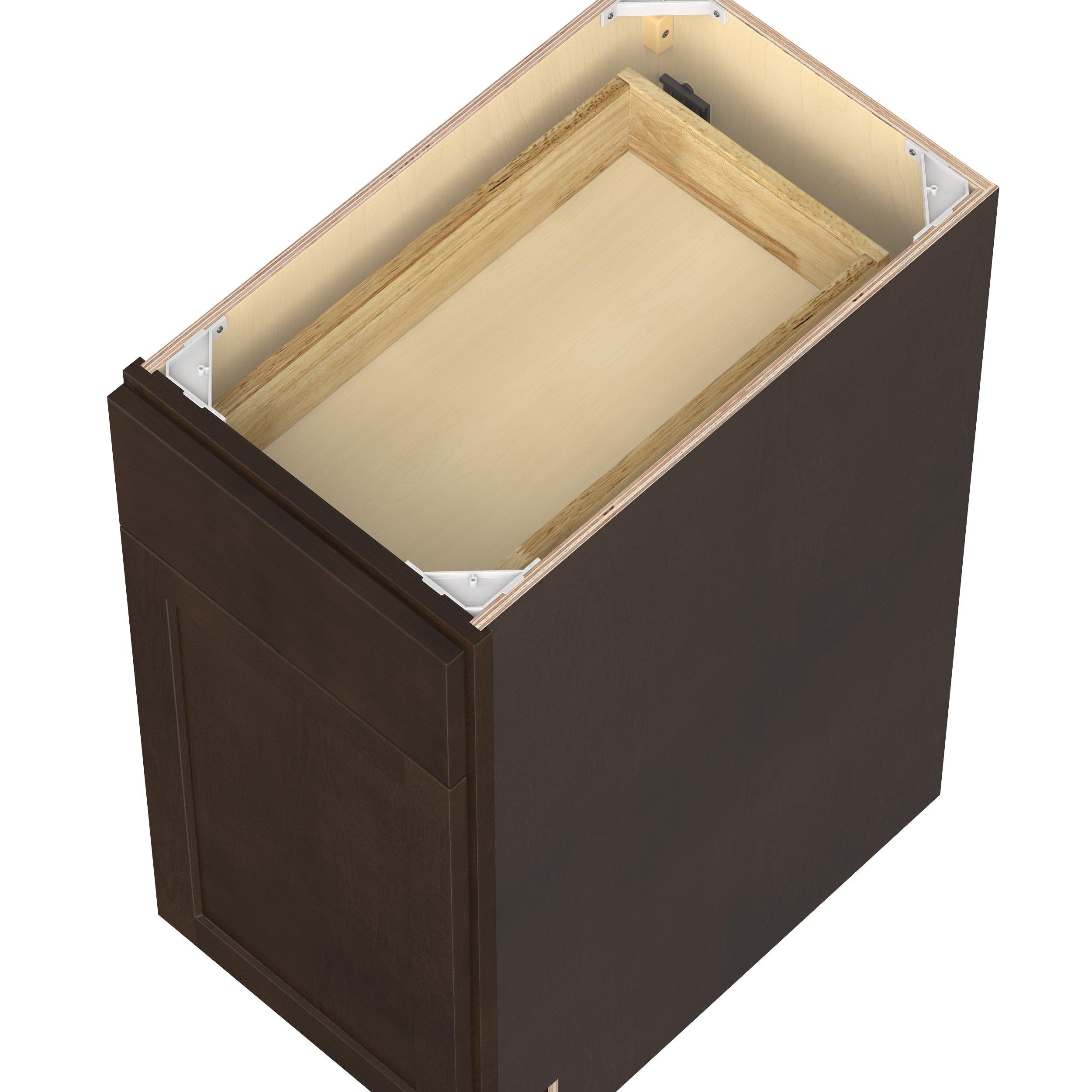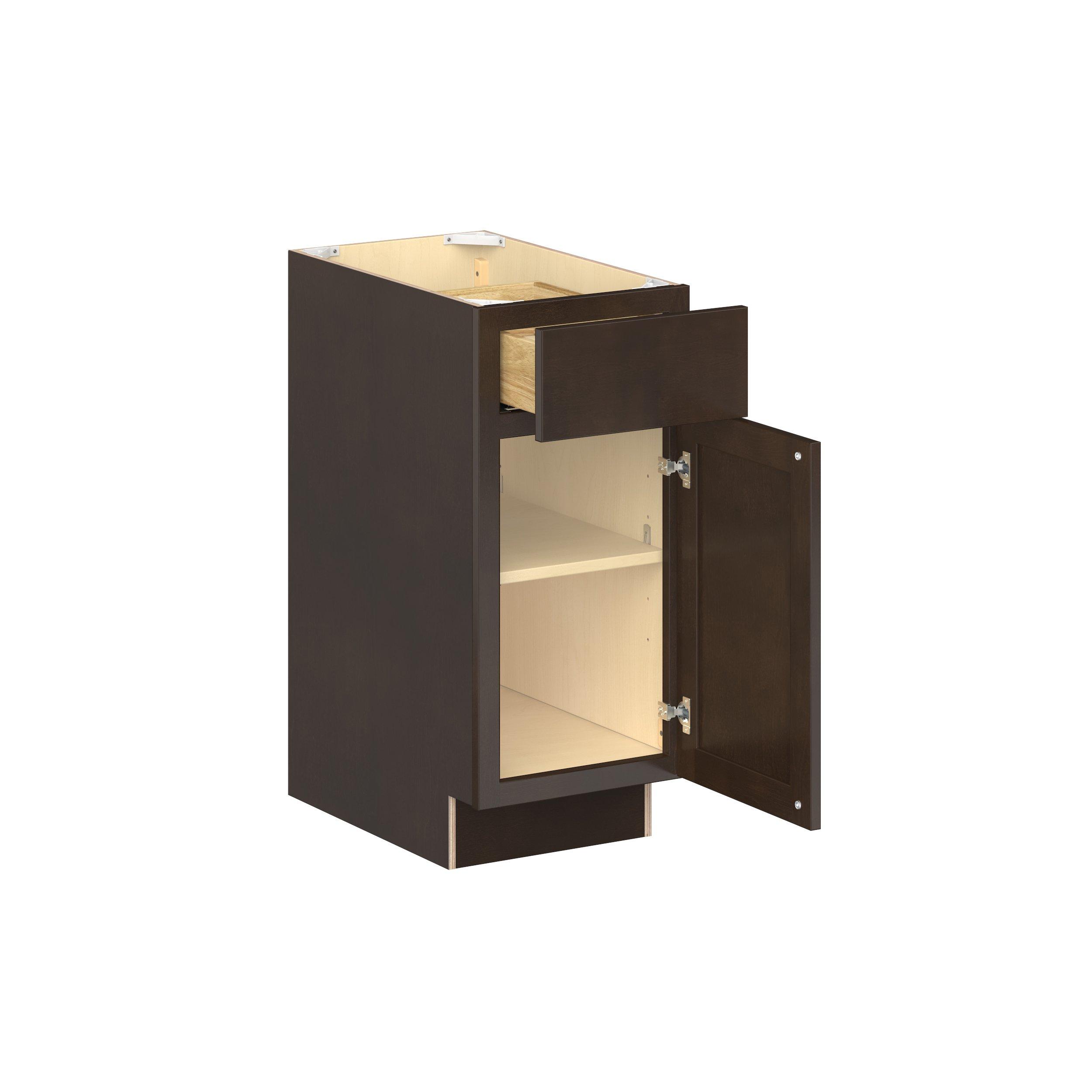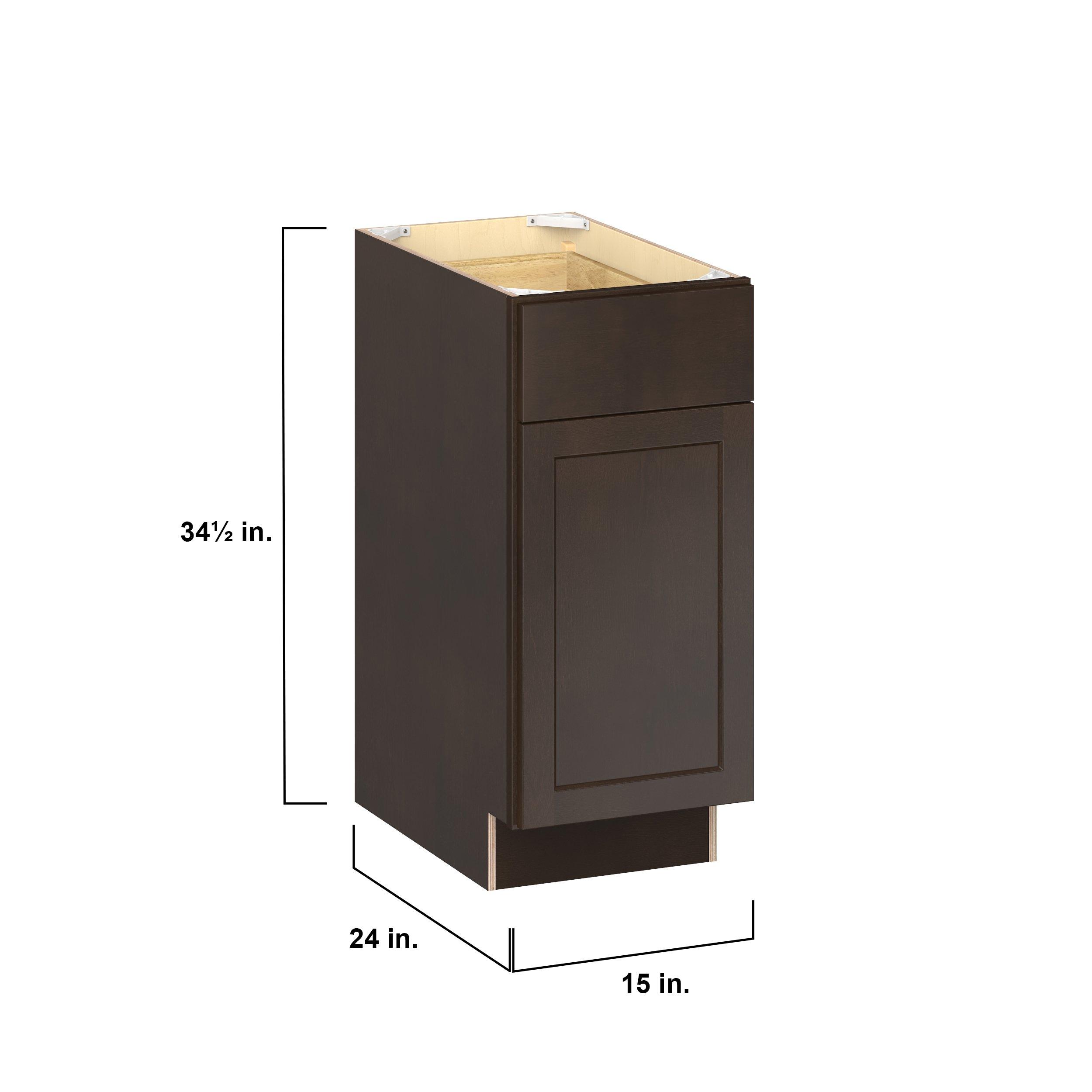 Embrace the timeless charm of the Baxley classic shaker door style. Studio Design Collection Baxley 15 in. Stained Cocoa Door and Drawer Base Cabinet - Right Door Hinge features all plywood construction, offering both superior strength and sophistication to your space. Featuring 5-piece solid wood doors and dovetail drawer joints, these cabinets offer durability and elegance. Baxley classic shaker door style is designed to retain its stunning appearance and withstand the test of time.