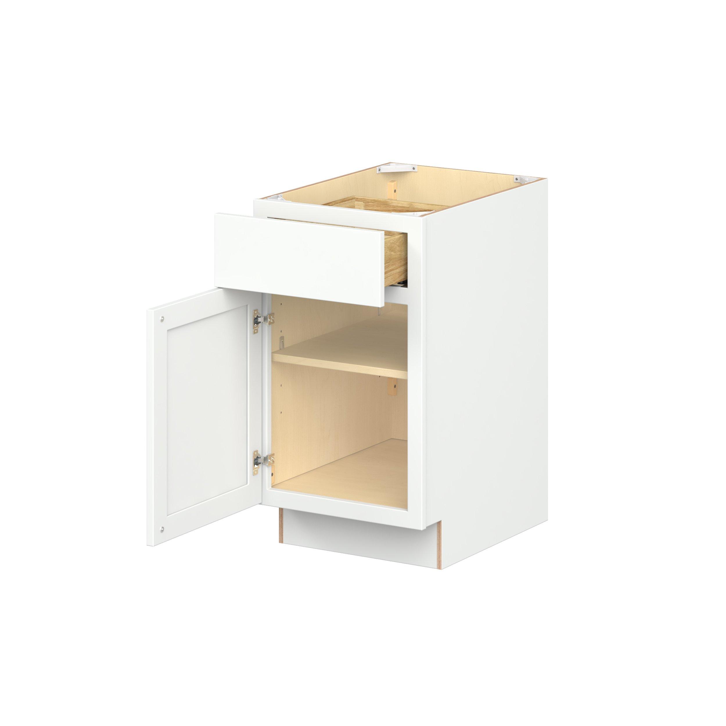 Embrace the timeless charm of the Baxley classic shaker door style. Studio Design Collection Baxley 18 in. Painted Pure White Door and Drawer Base Cabinet - ADA - Left Door Hinge features all plywood construction, offering both superior strength and sophistication to your space. Featuring 5-piece MDF doors and dovetail drawer joints, these cabinets offer durability and elegance. Baxley classic shaker door style is designed to retain its stunning appearance and withstand the test of time.