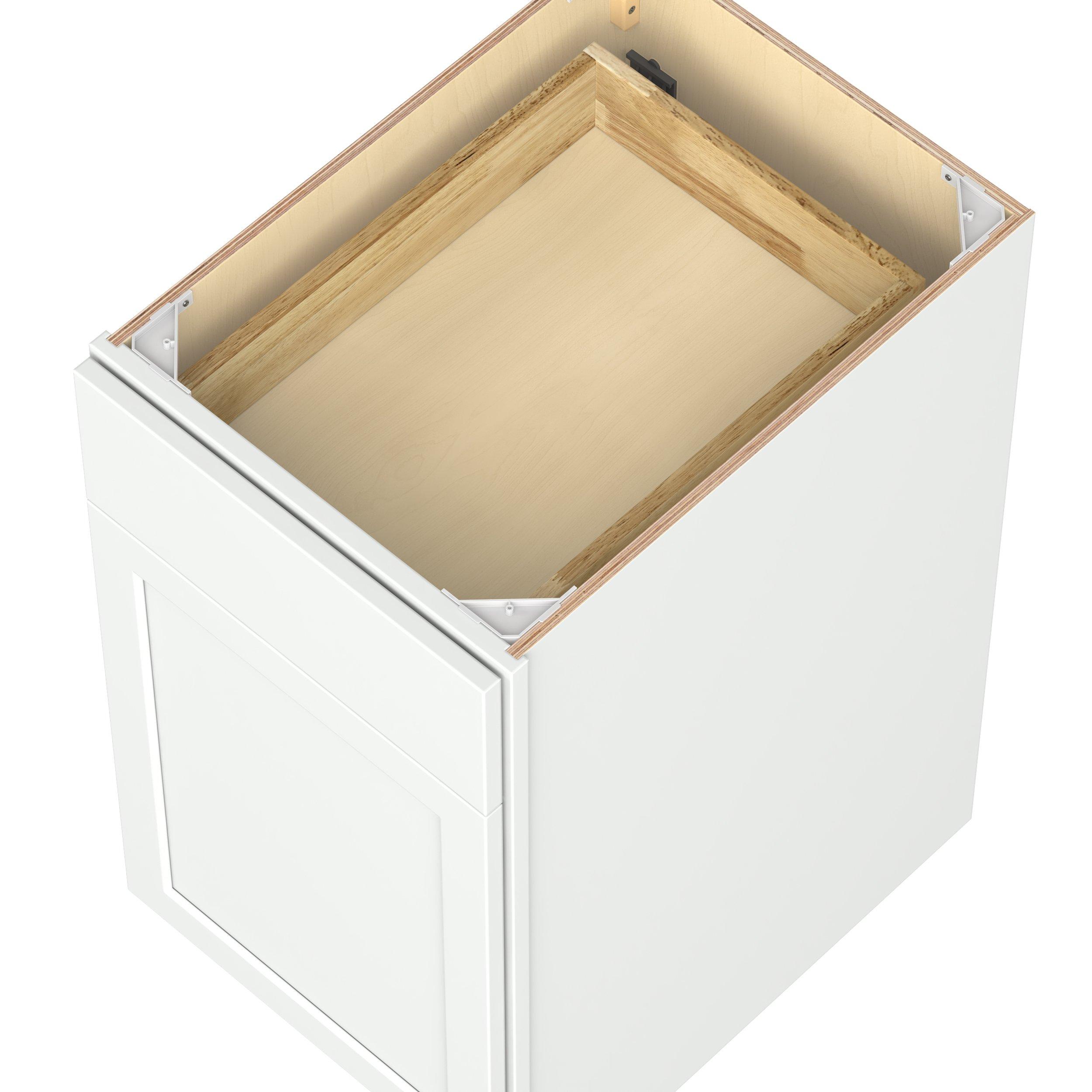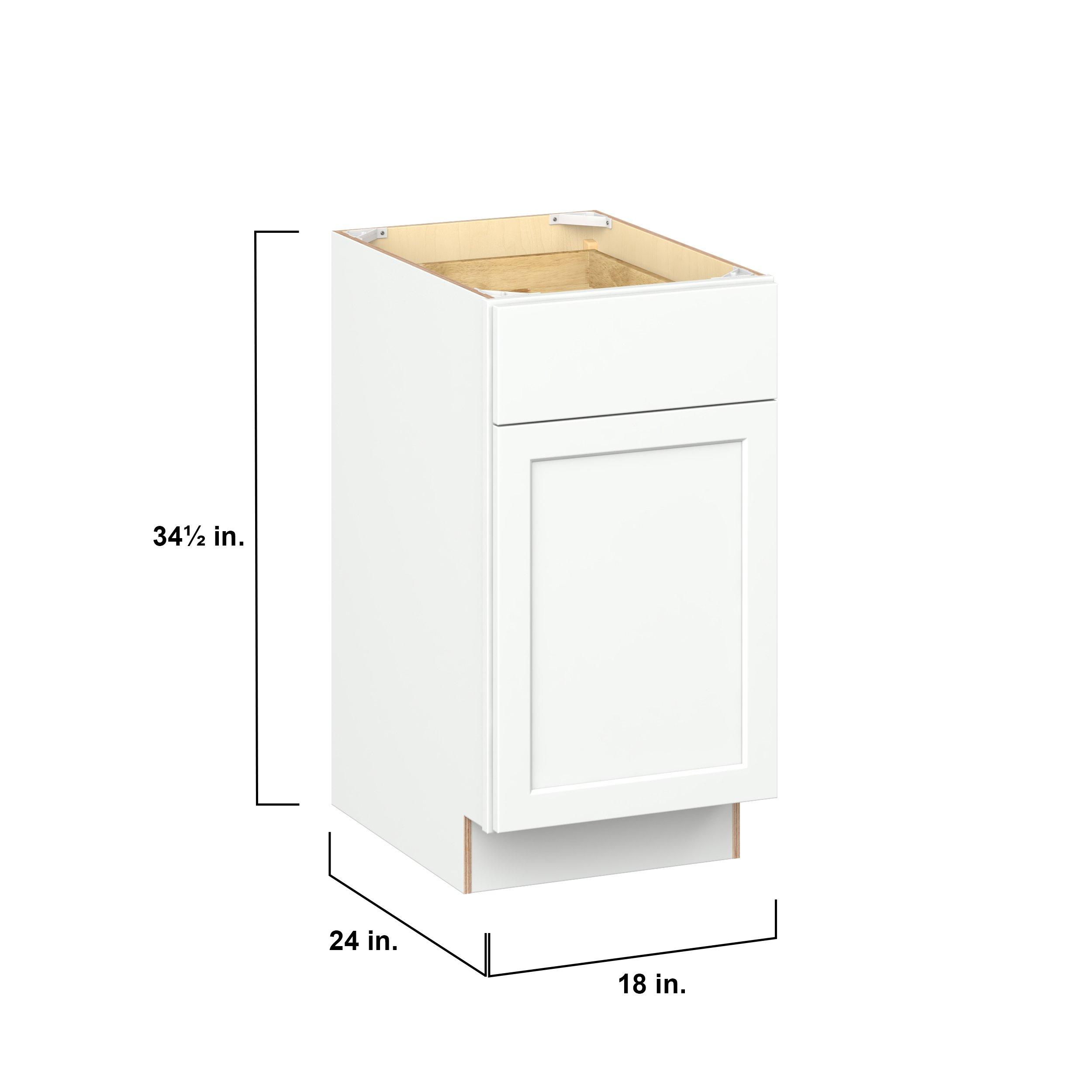 Embrace the timeless charm of the Baxley classic shaker door style. Studio Design Collection Baxley 18 in. Painted Pure White Door and Drawer Base Cabinet - Right Door Hinge features all plywood construction, offering both superior strength and sophistication to your space. Featuring 5-piece MDF doors and dovetail drawer joints, these cabinets offer durability and elegance. Baxley classic shaker door style is designed to retain its stunning appearance and withstand the test of time.