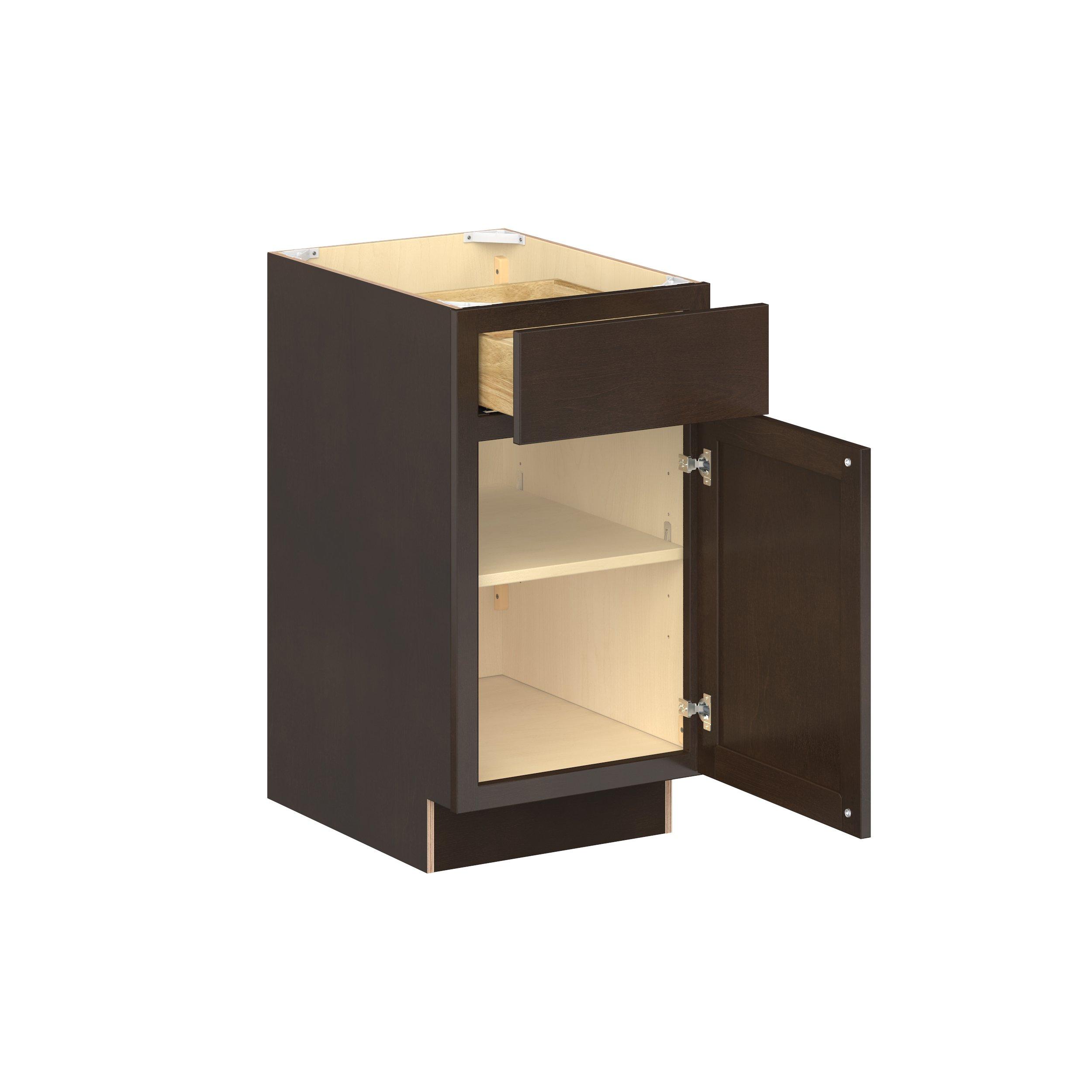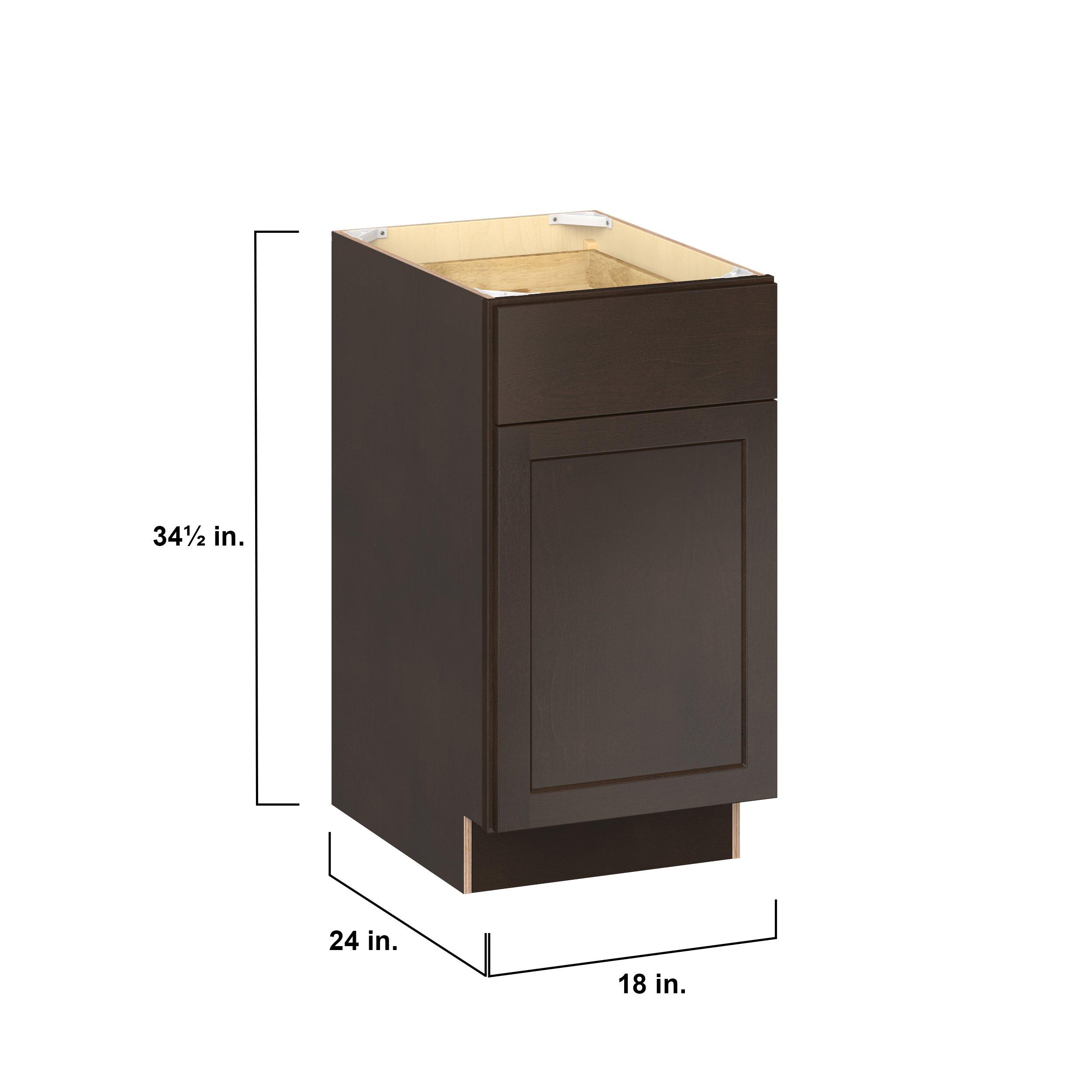 Embrace the timeless charm of the Baxley classic shaker door style. Studio Design Collection Baxley 18 in. Stained Cocoa Door and Drawer Base Cabinet - Right Door Hinge features all plywood construction, offering both superior strength and sophistication to your space. Featuring 5-piece solid wood doors and dovetail drawer joints, these cabinets offer durability and elegance. Baxley classic shaker door style is designed to retain its stunning appearance and withstand the test of time.