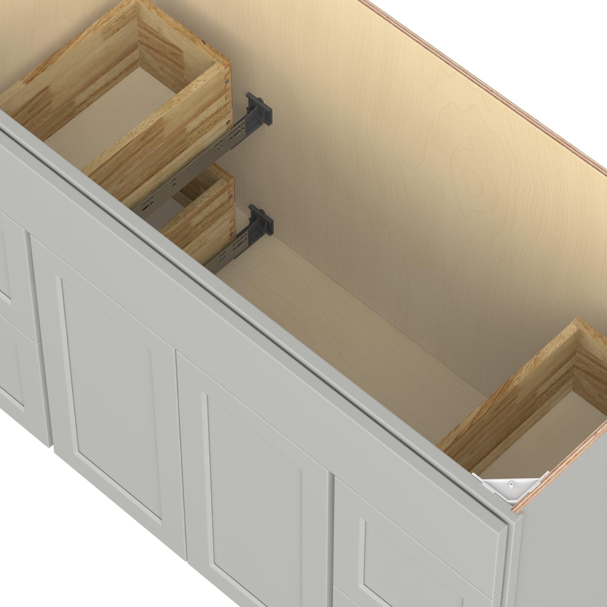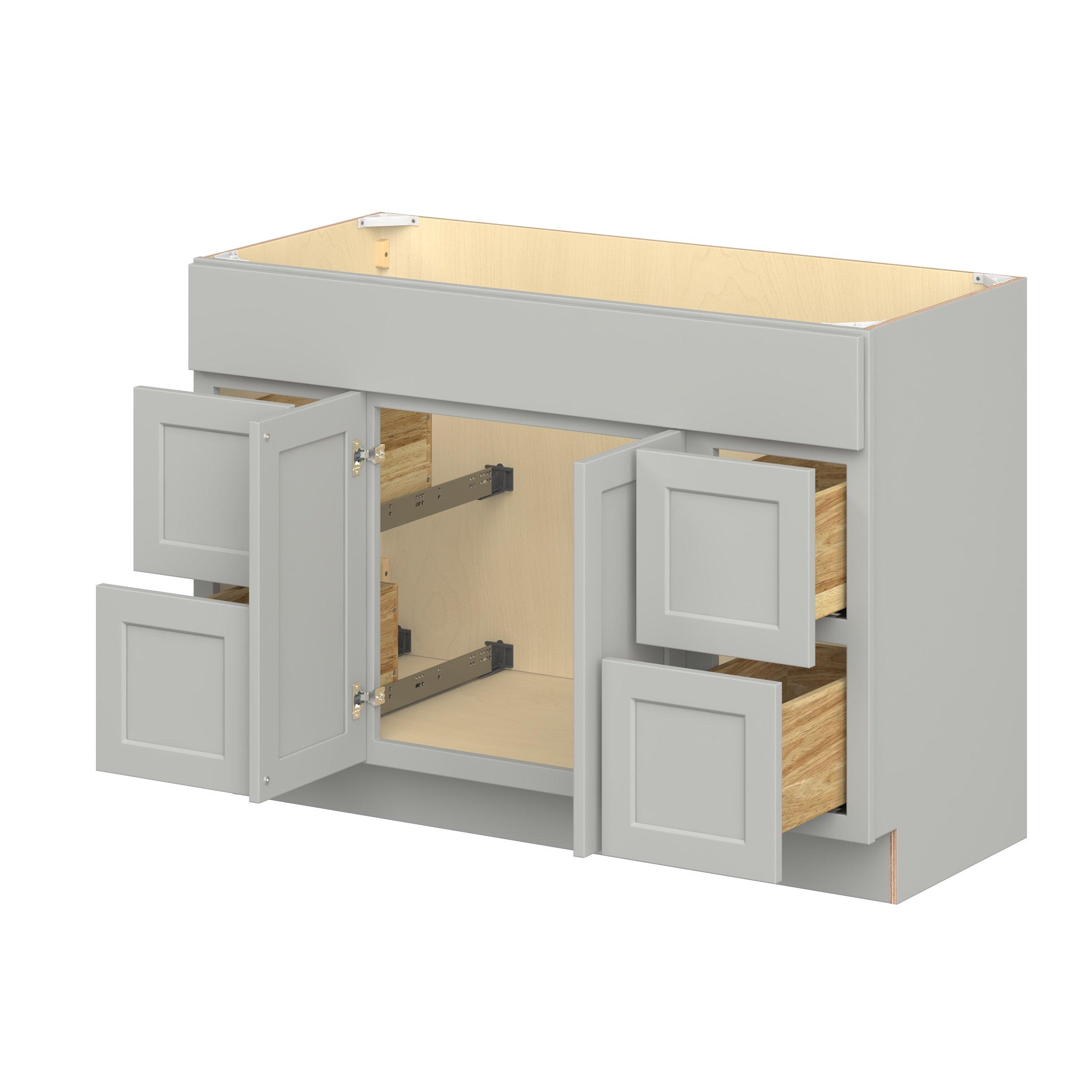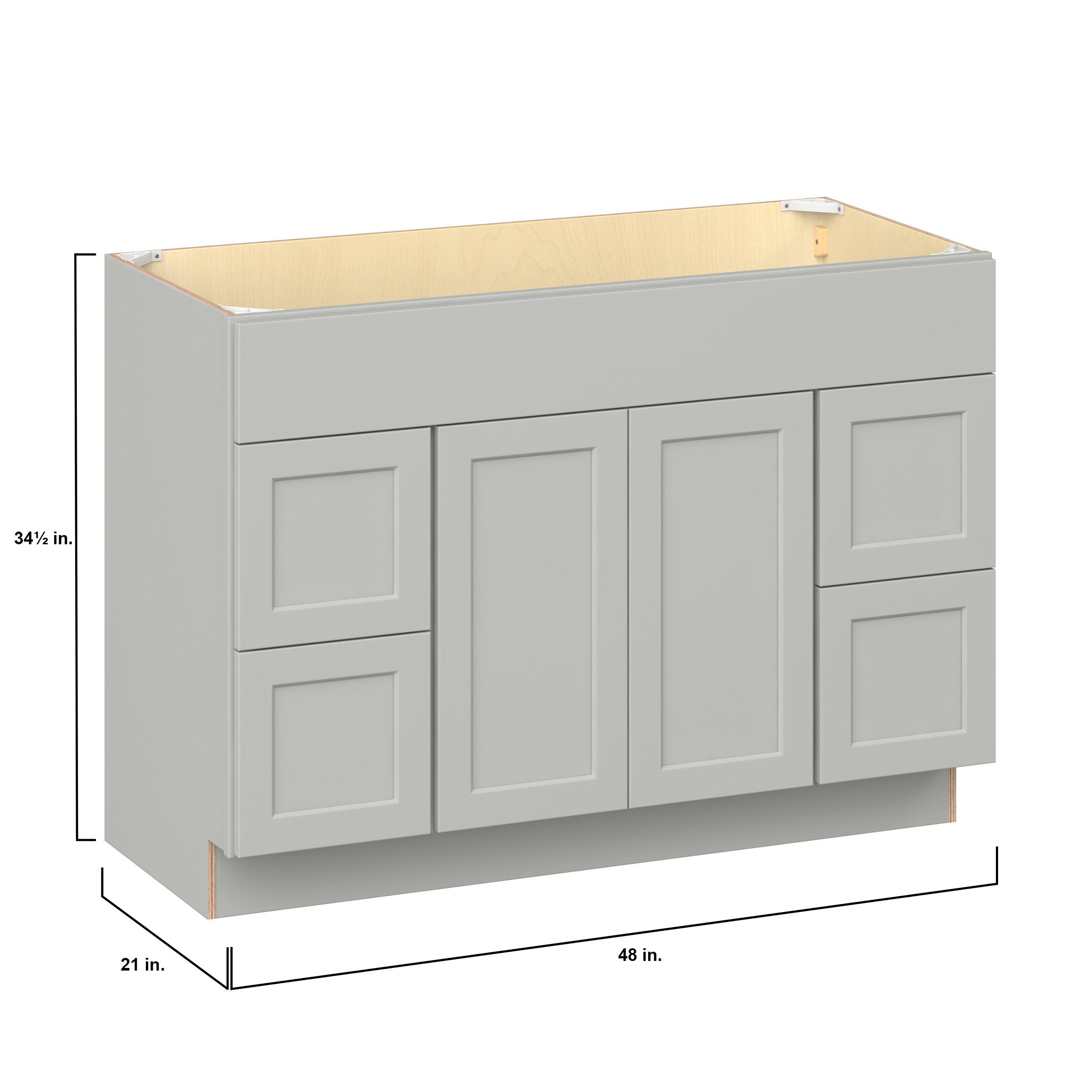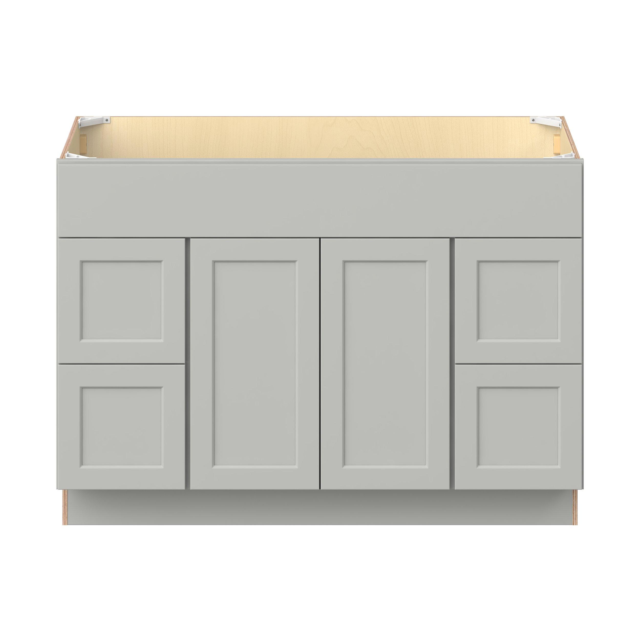 Double DoorEmbrace the timeless charm of the Baxley classic shaker door style. Studio Design Collection Baxley 48 in. Painted Whisper Gray Vanity Sink Door and Drawer Base Cabinet features all plywood construction, offering both superior strength and sophistication to your space. Featuring 5-piece MDF doors and dovetail drawer joints, these cabinets offer durability and elegance. Baxley classic shaker door style is designed to retain its stunning appearance and withstand the test of time.