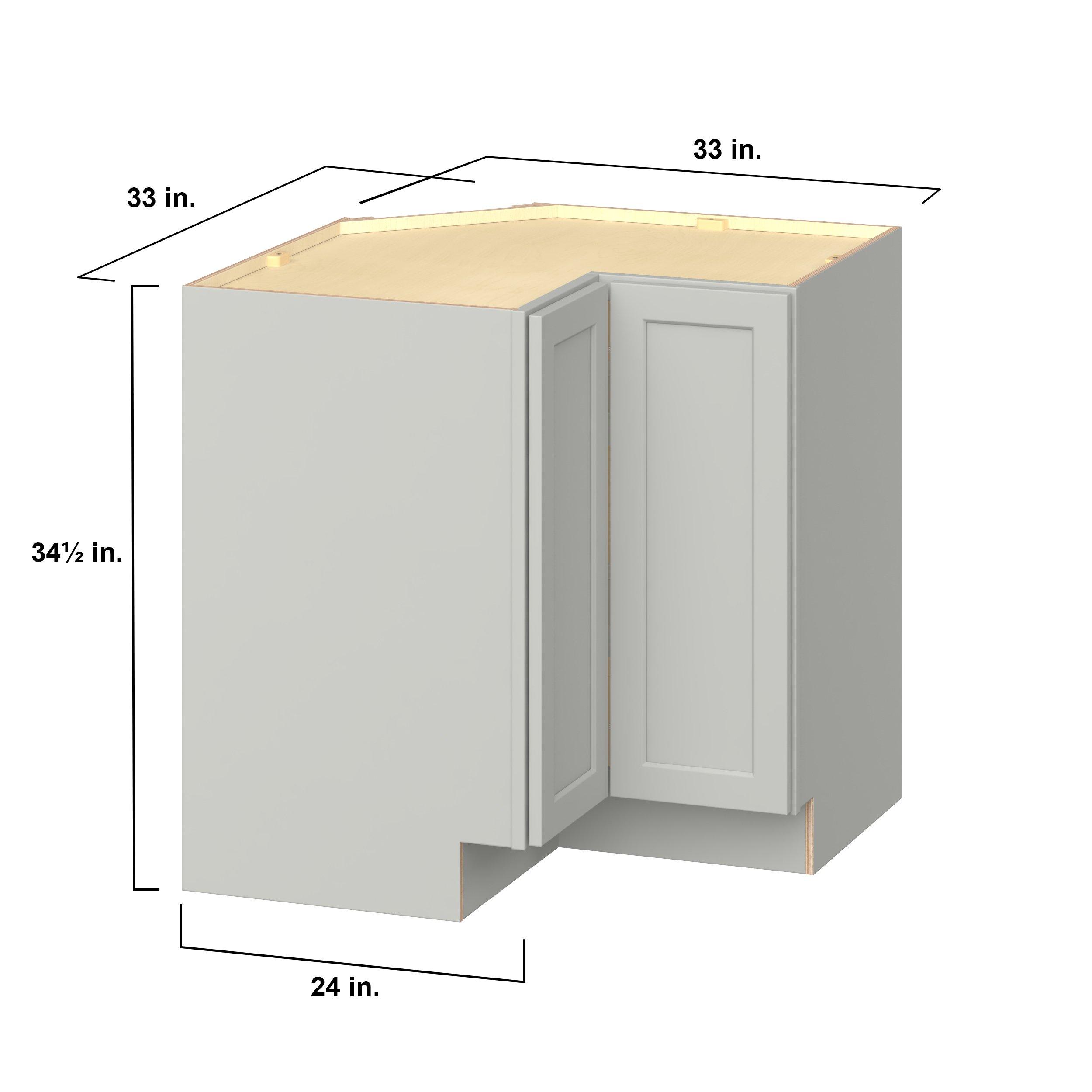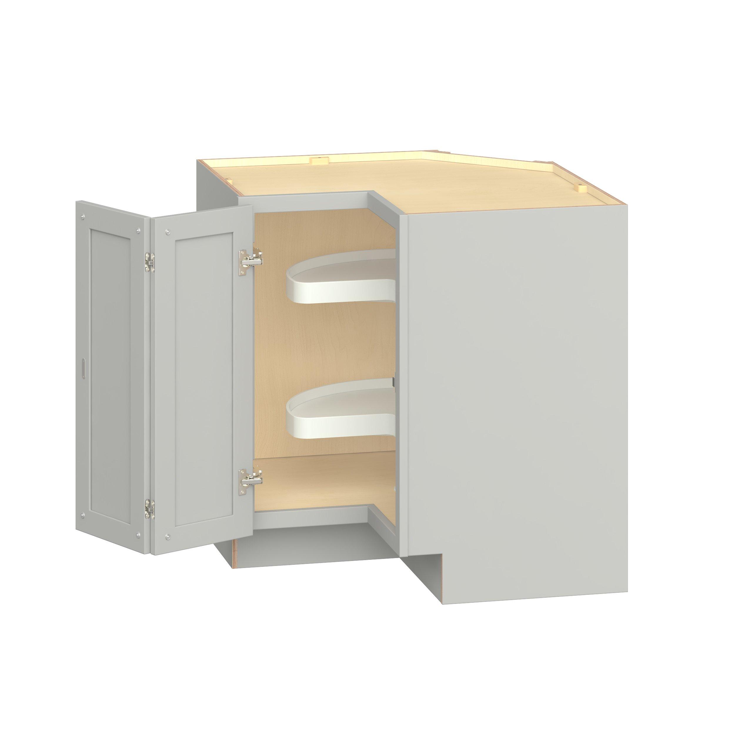 Embrace the timeless charm of the Baxley classic shaker door style. Studio Design Collection Baxley 33 in. Painted Whisper Gray Lazy Susan Corner Base Cabinet features all plywood construction, offering both superior strength and sophistication to your space. Featuring 5-piece MDF doors and dovetail drawer joints, these cabinets offer durability and elegance. Baxley classic shaker door style is designed to retain its stunning appearance and withstand the test of time.